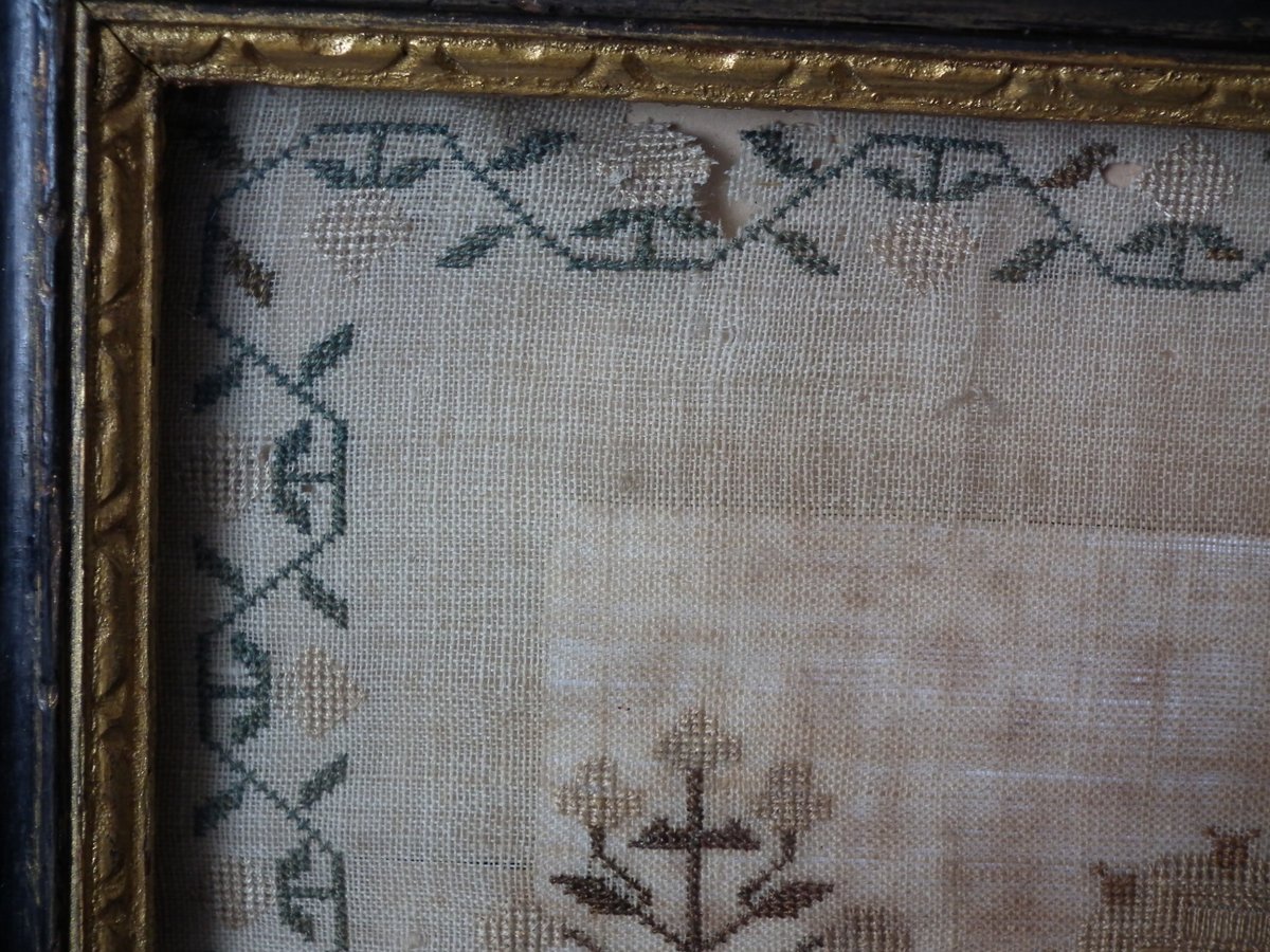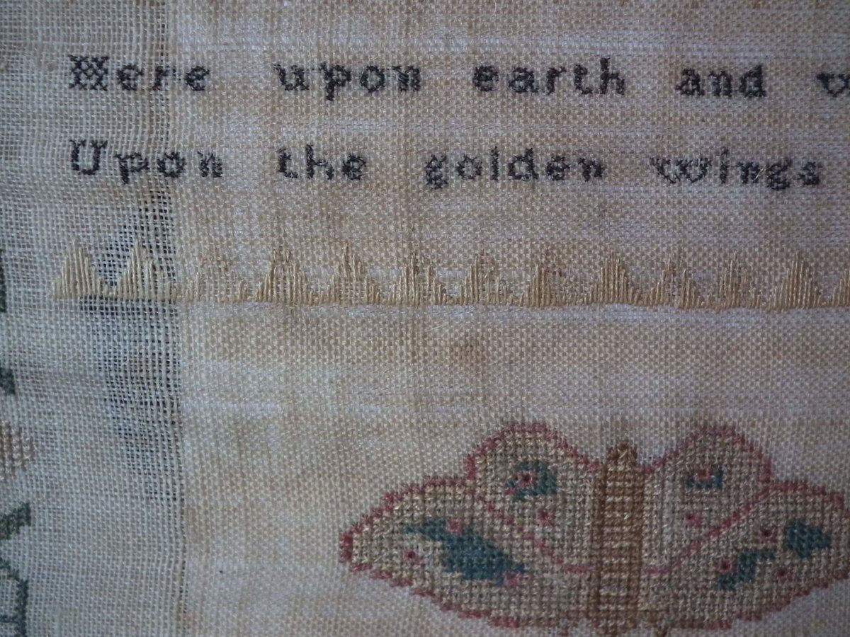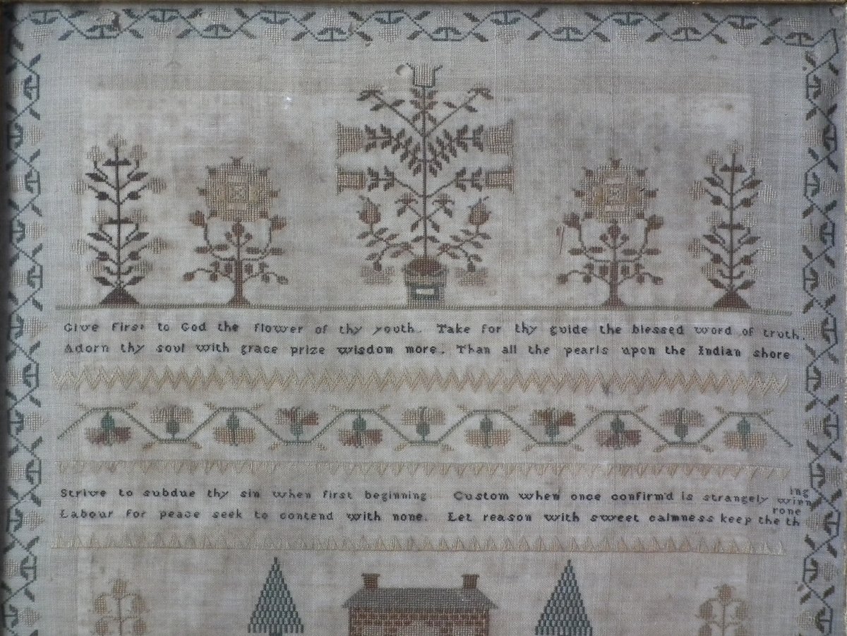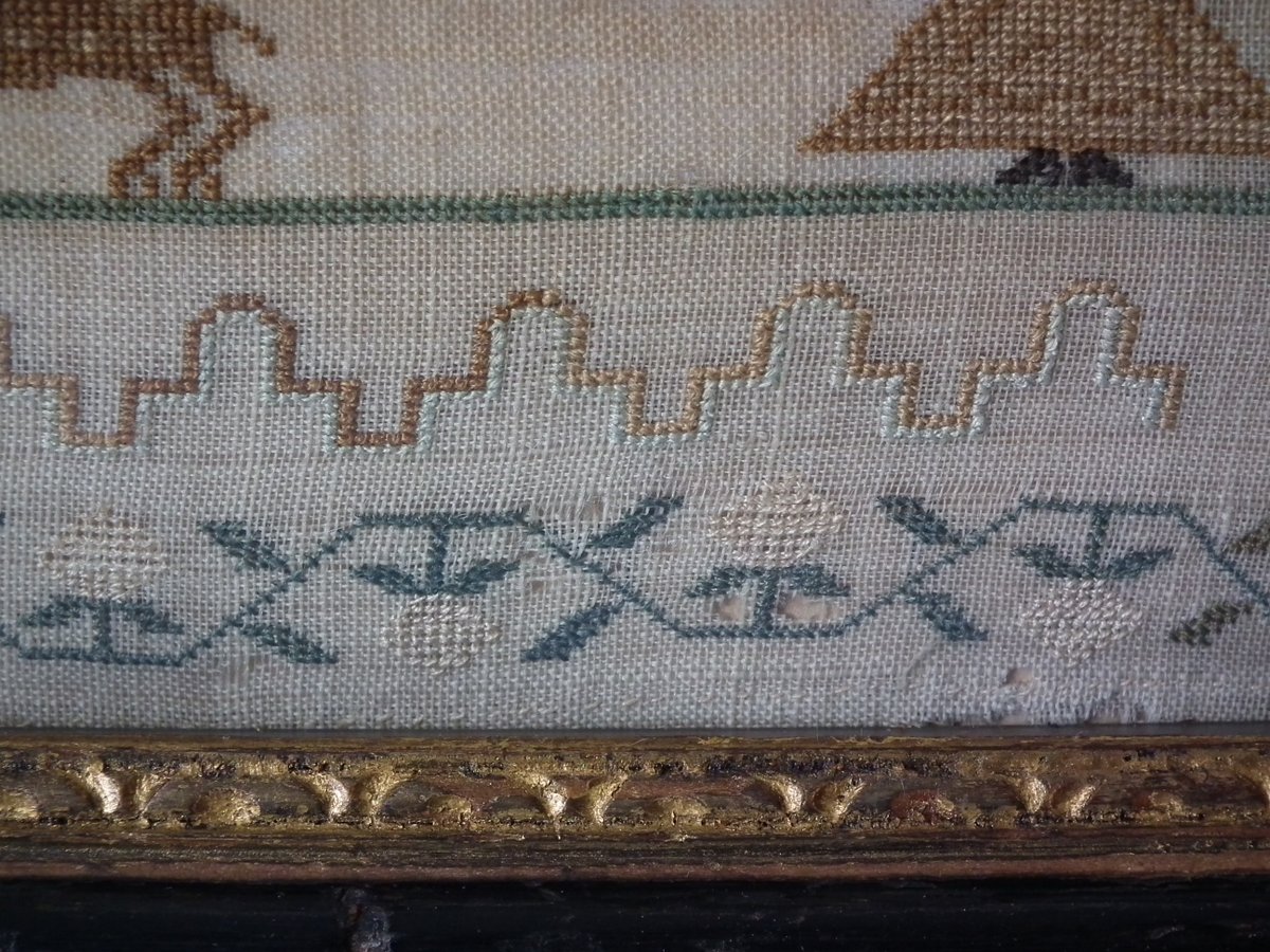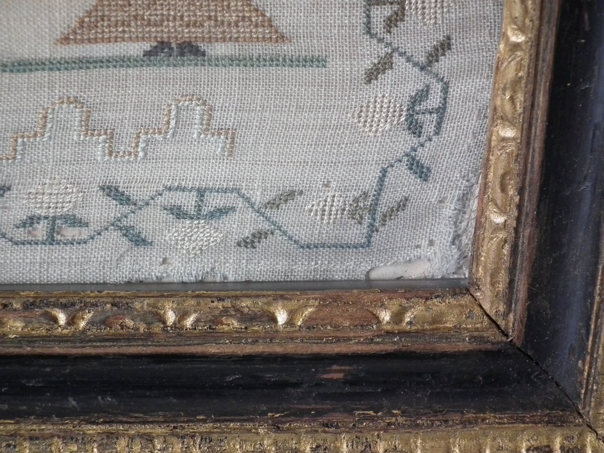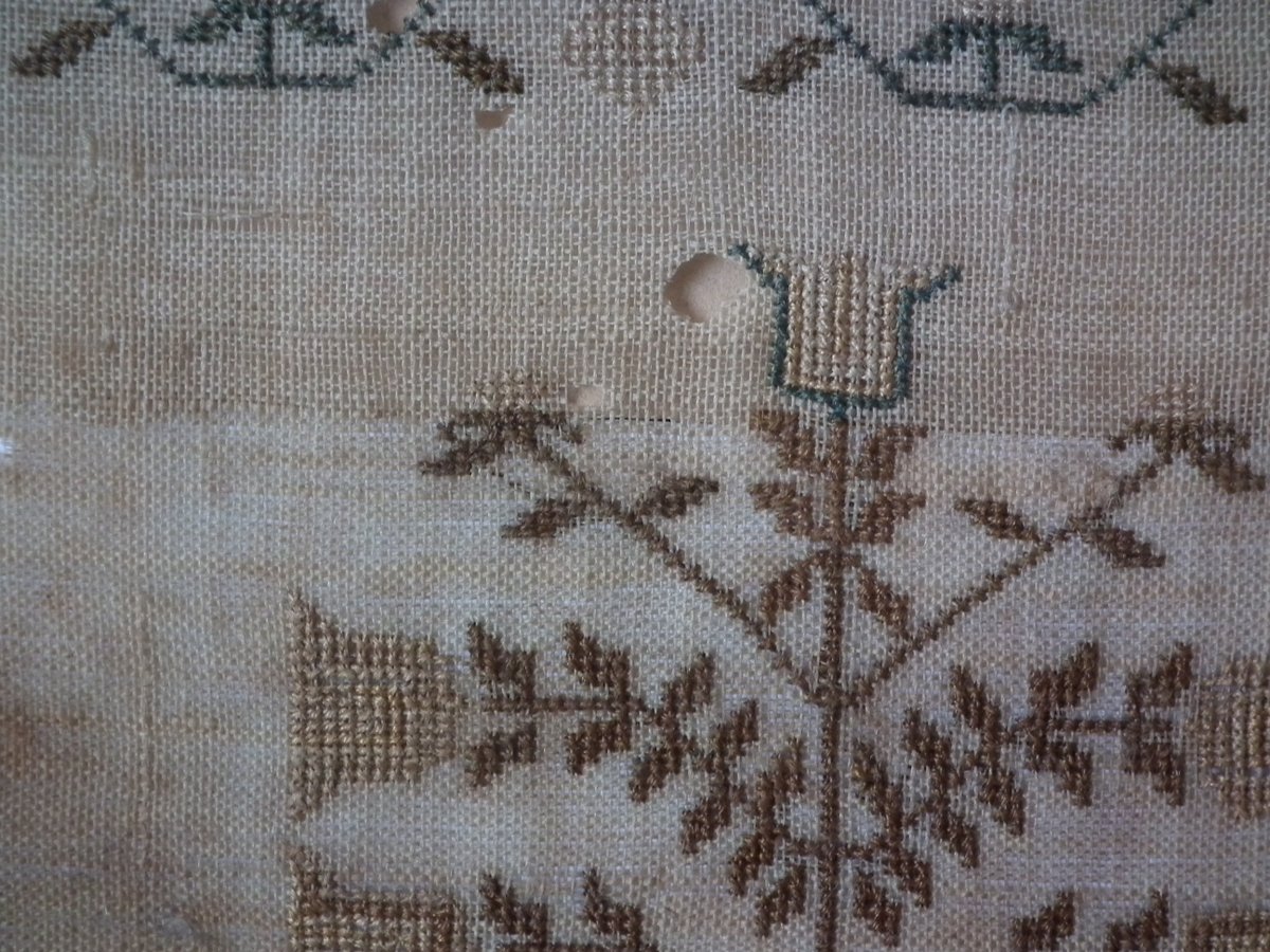 The sampler is worked in silk on linen ground, in a variety of stitches.