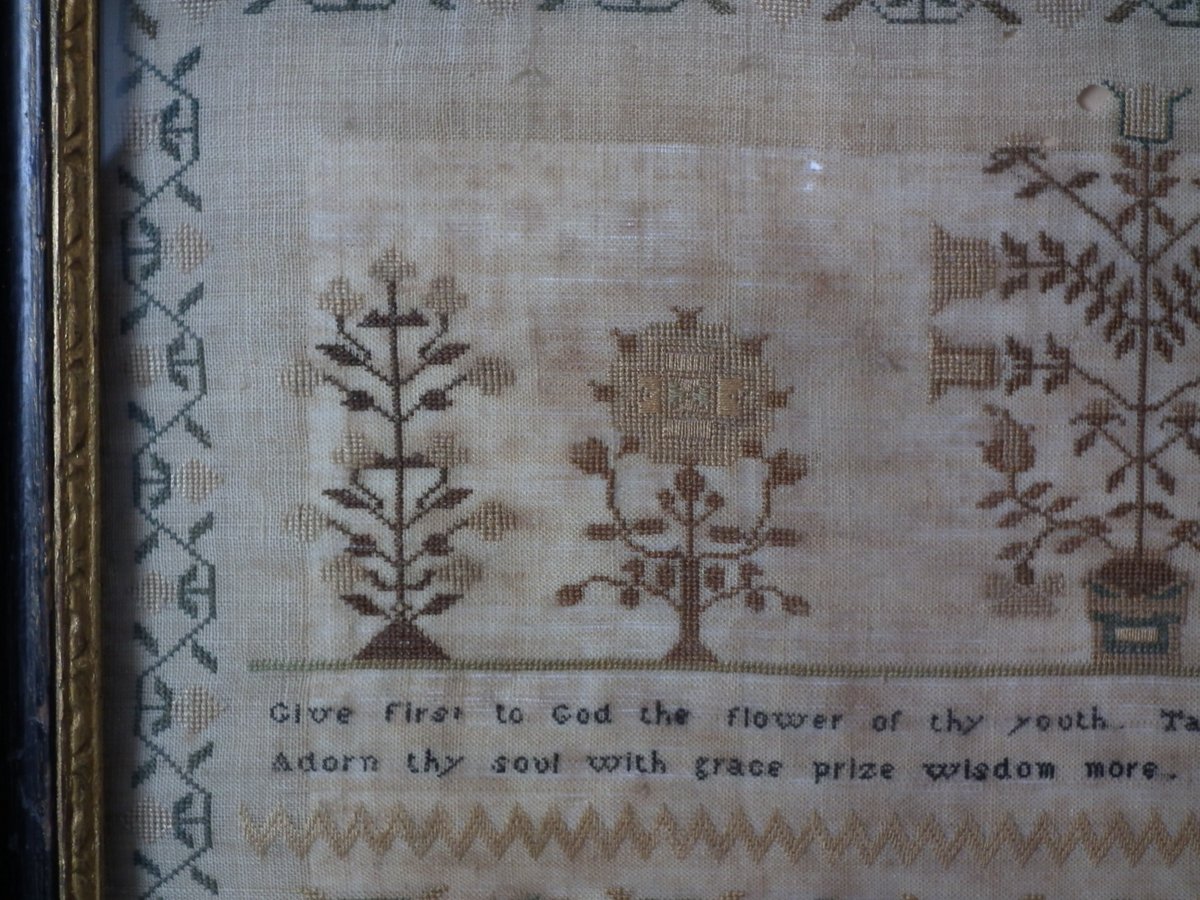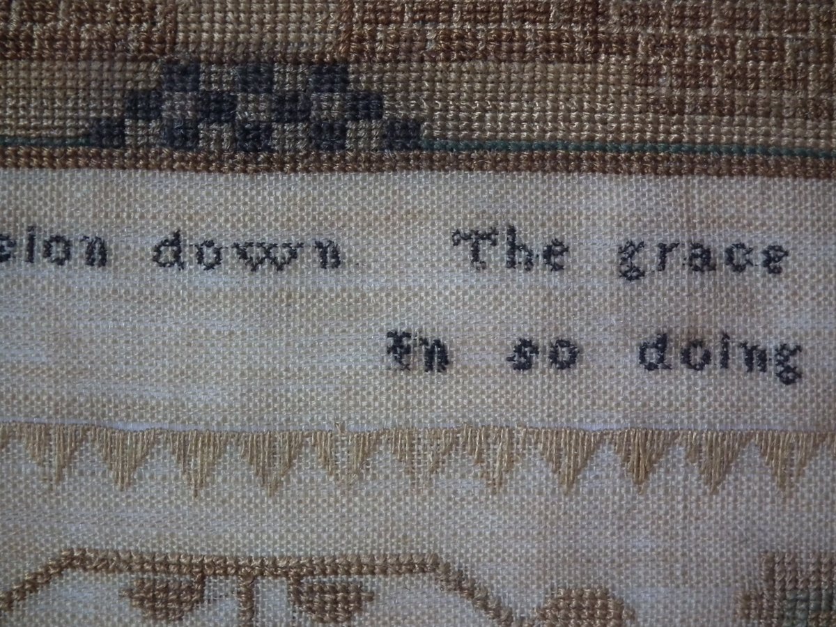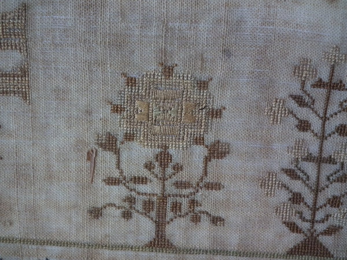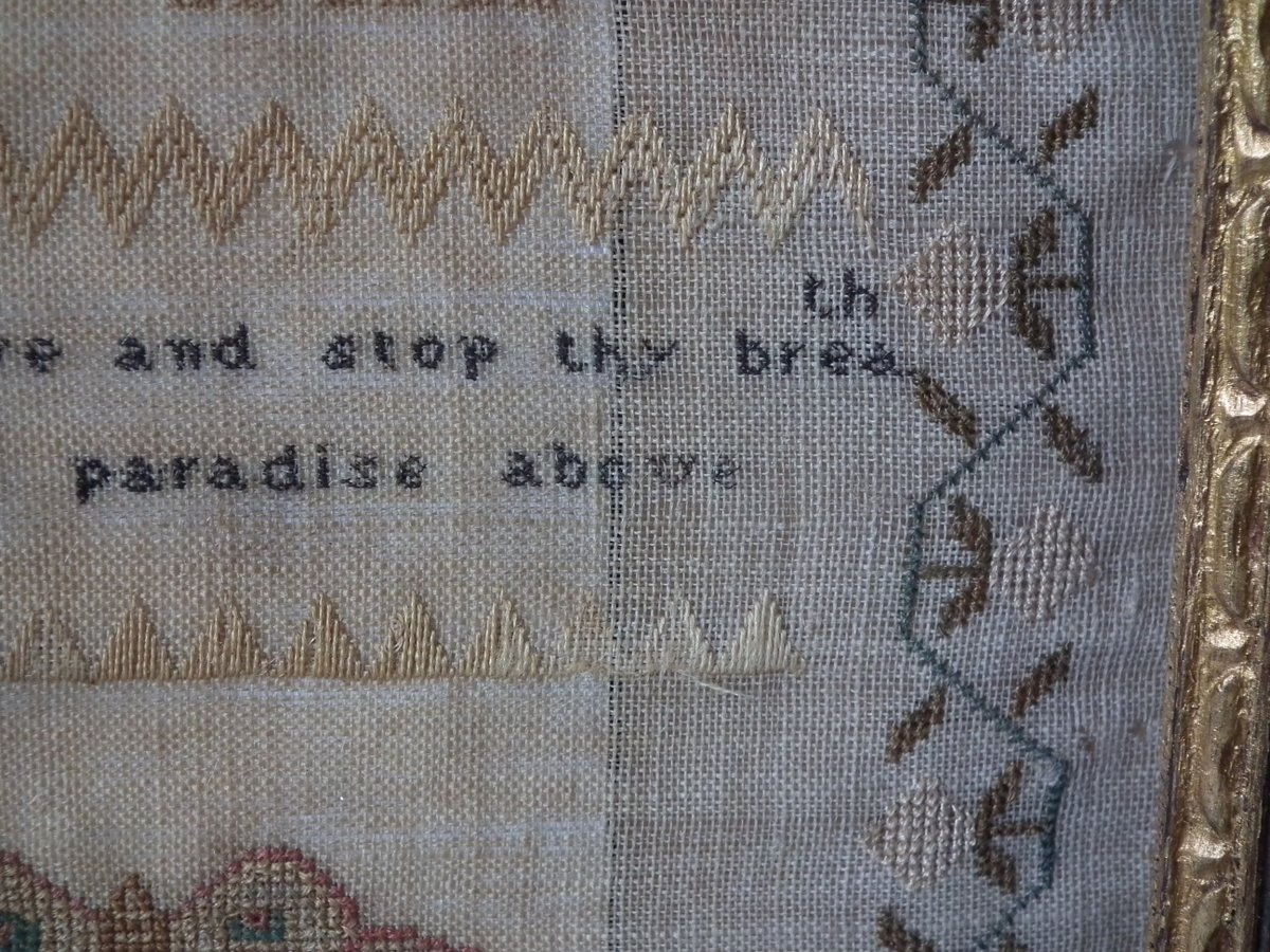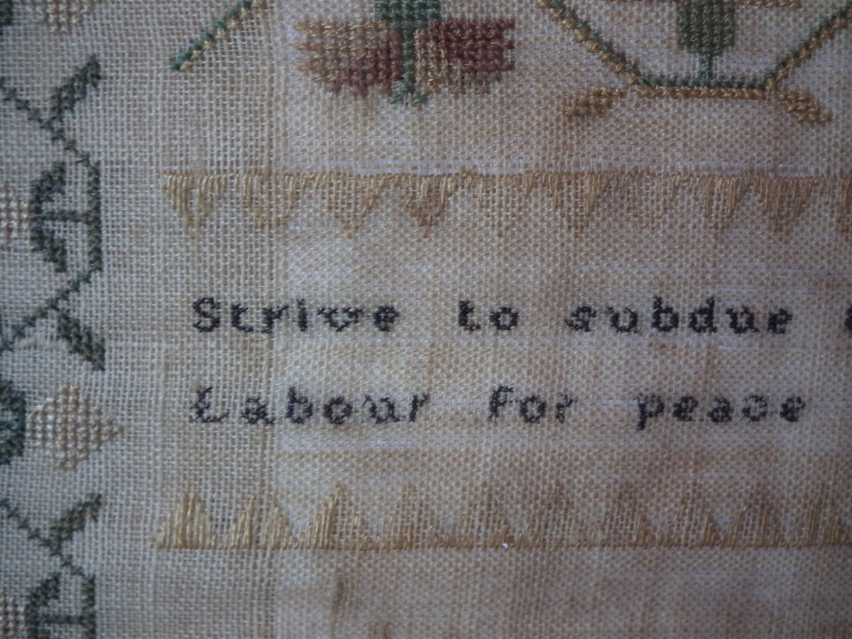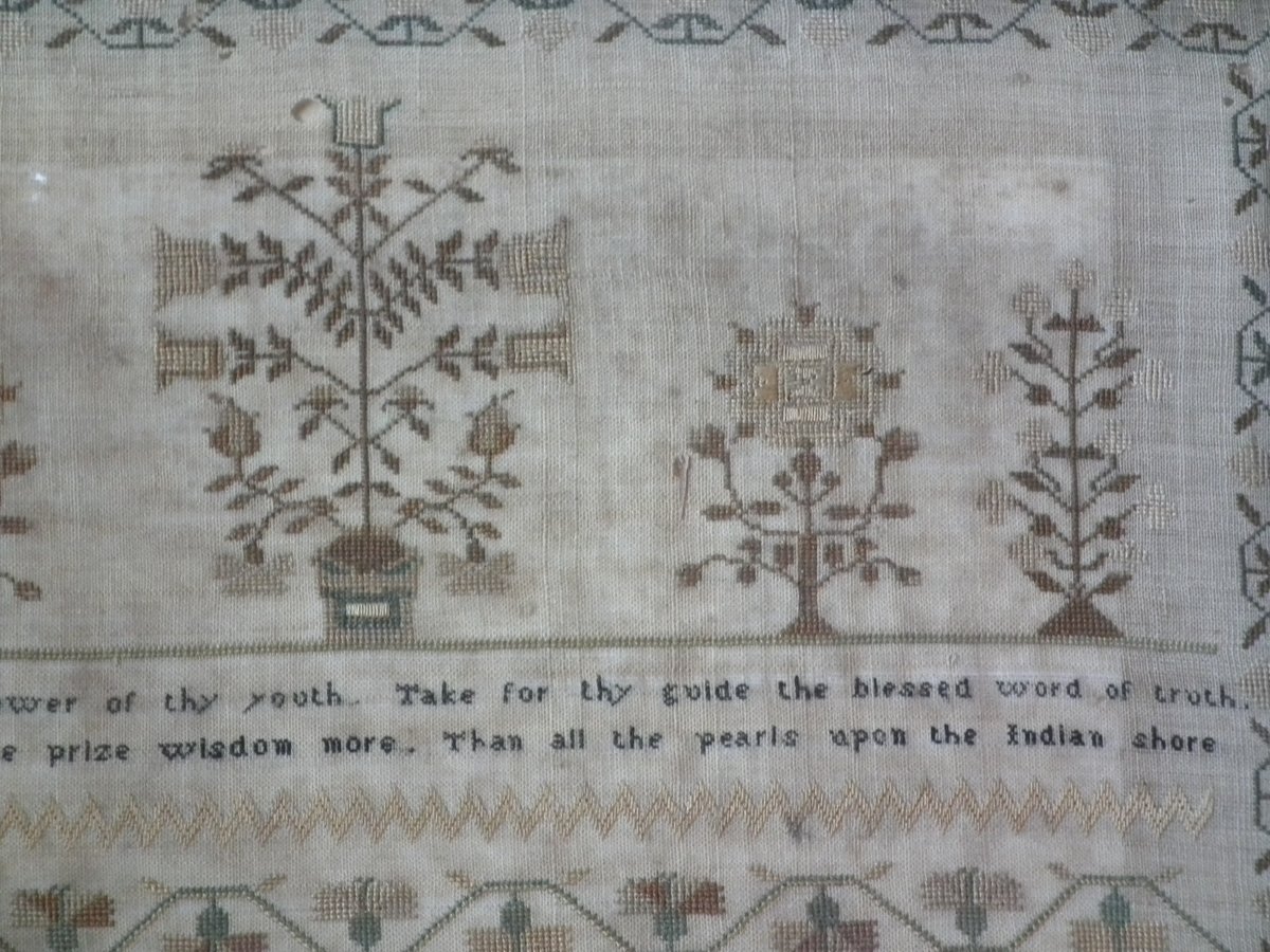 The sampler is worked in silk on linen ground, in a variety of stitches.