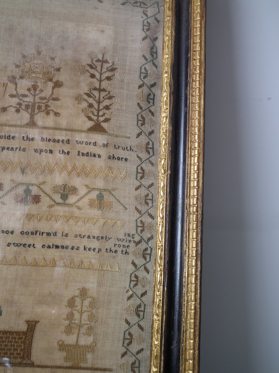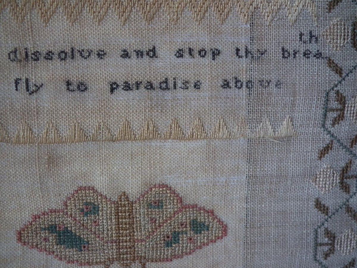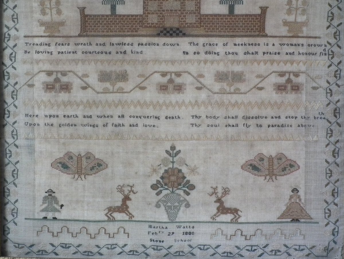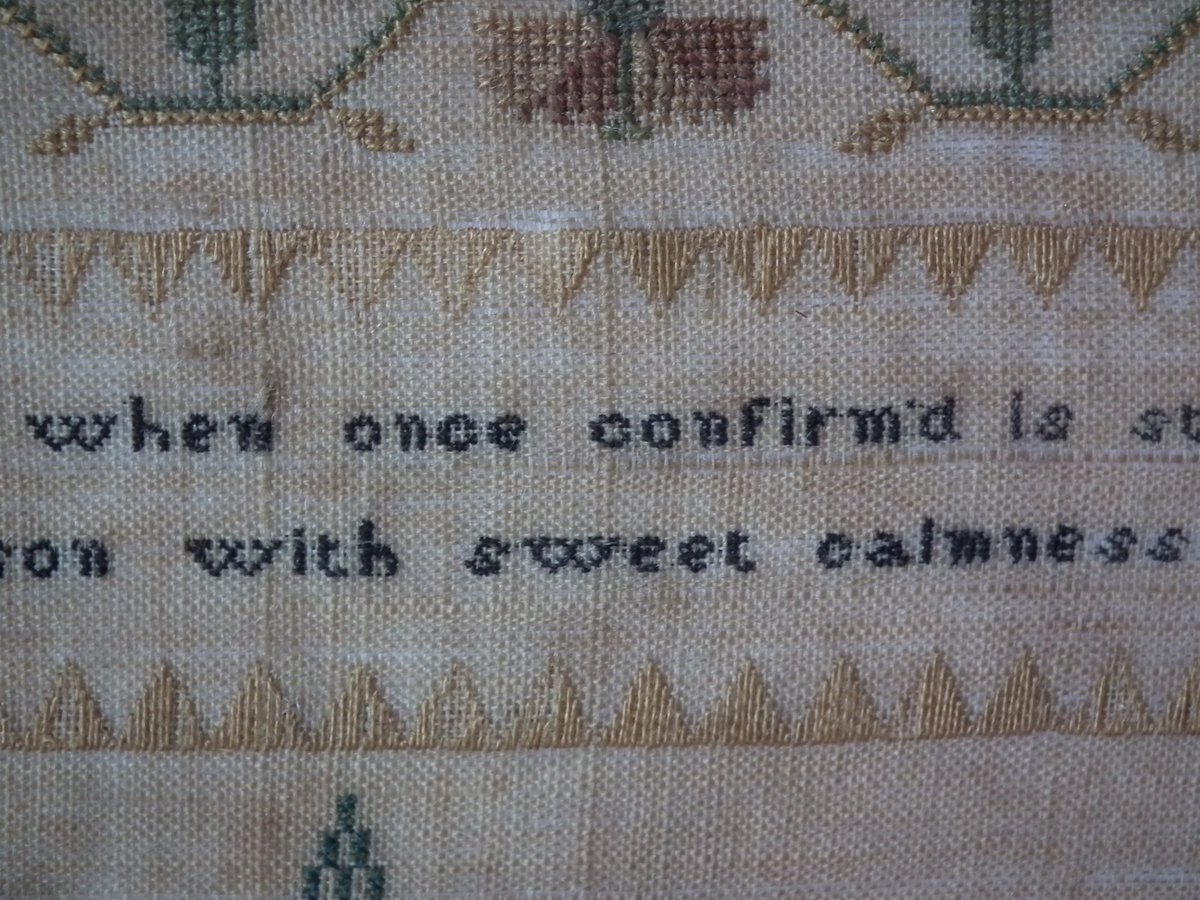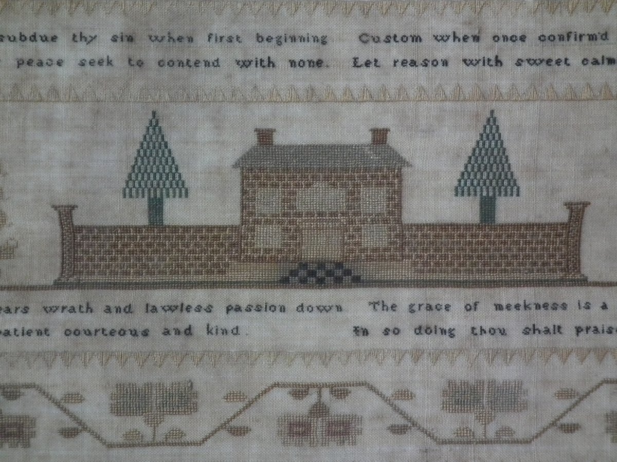 The sampler is worked in silk on linen ground, in a variety of stitches.