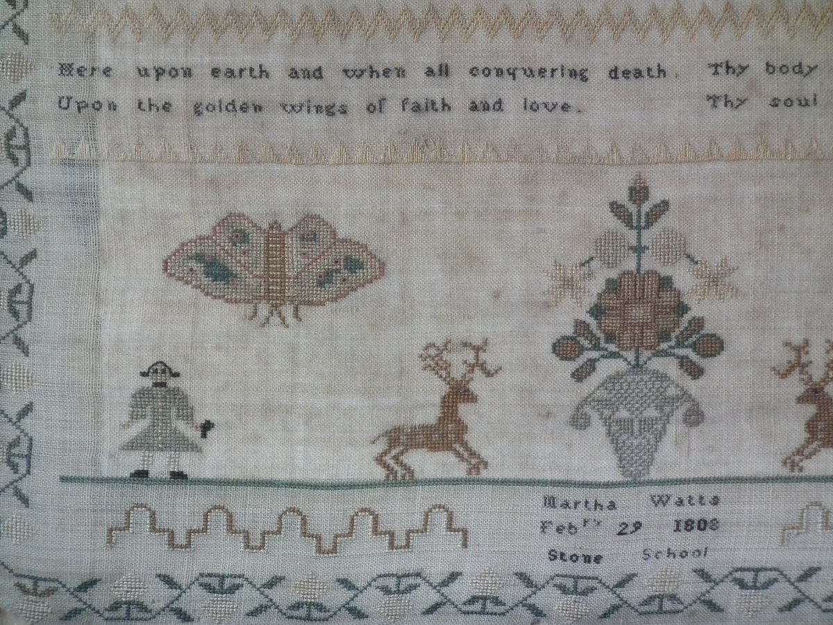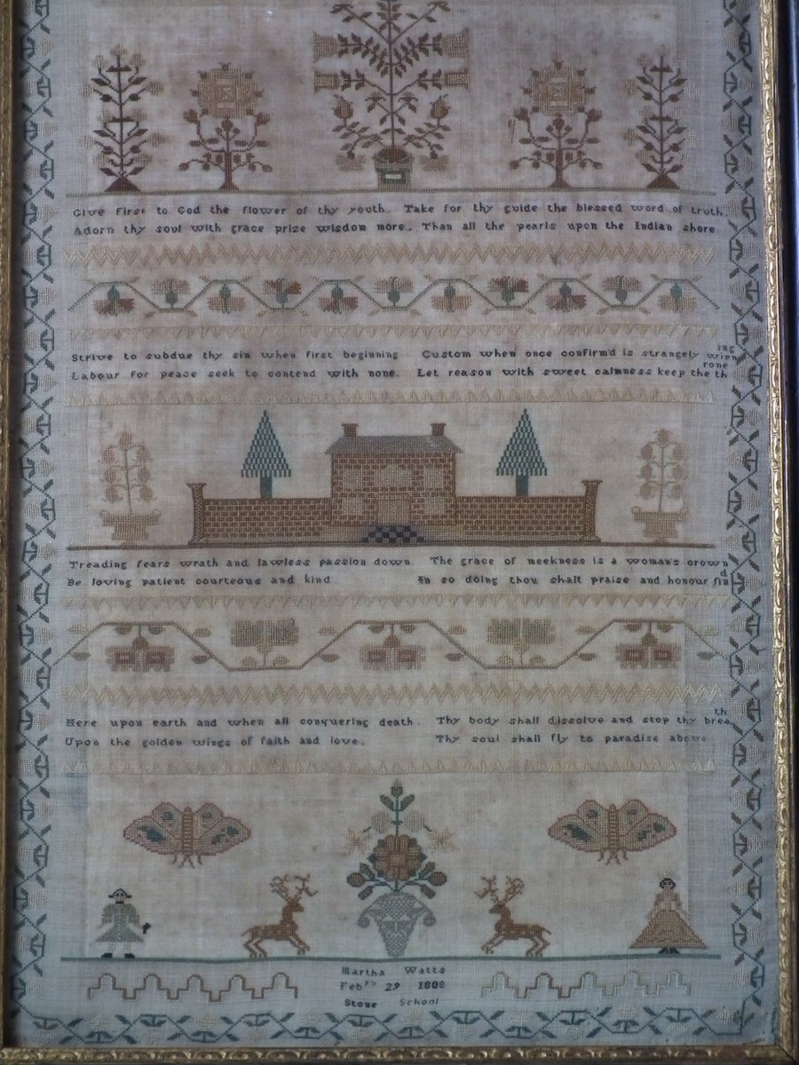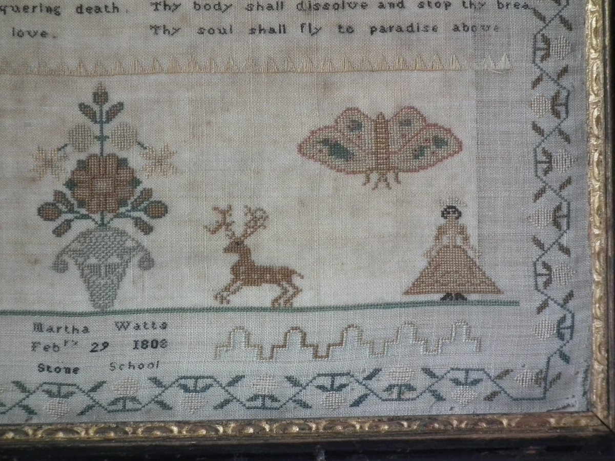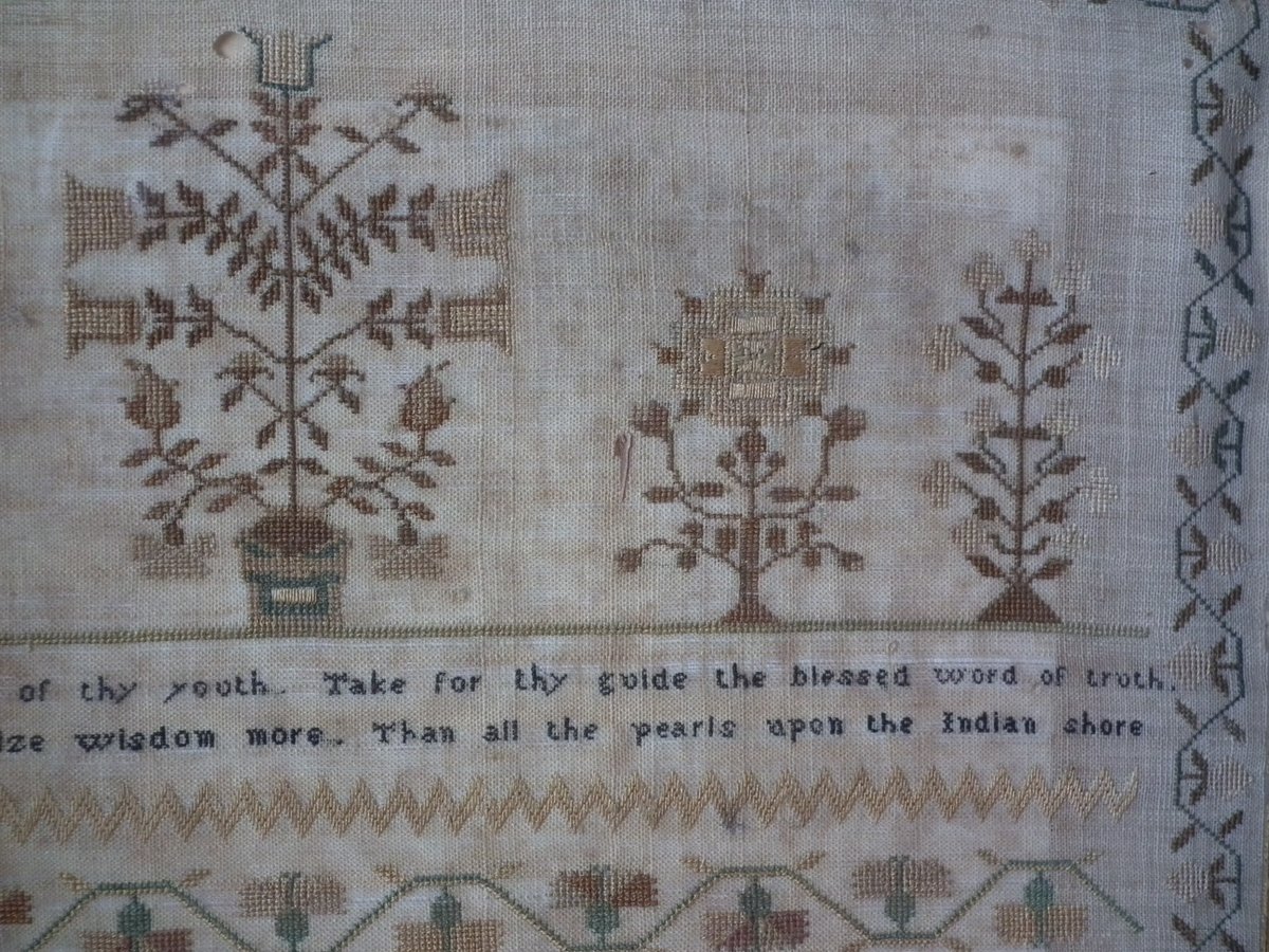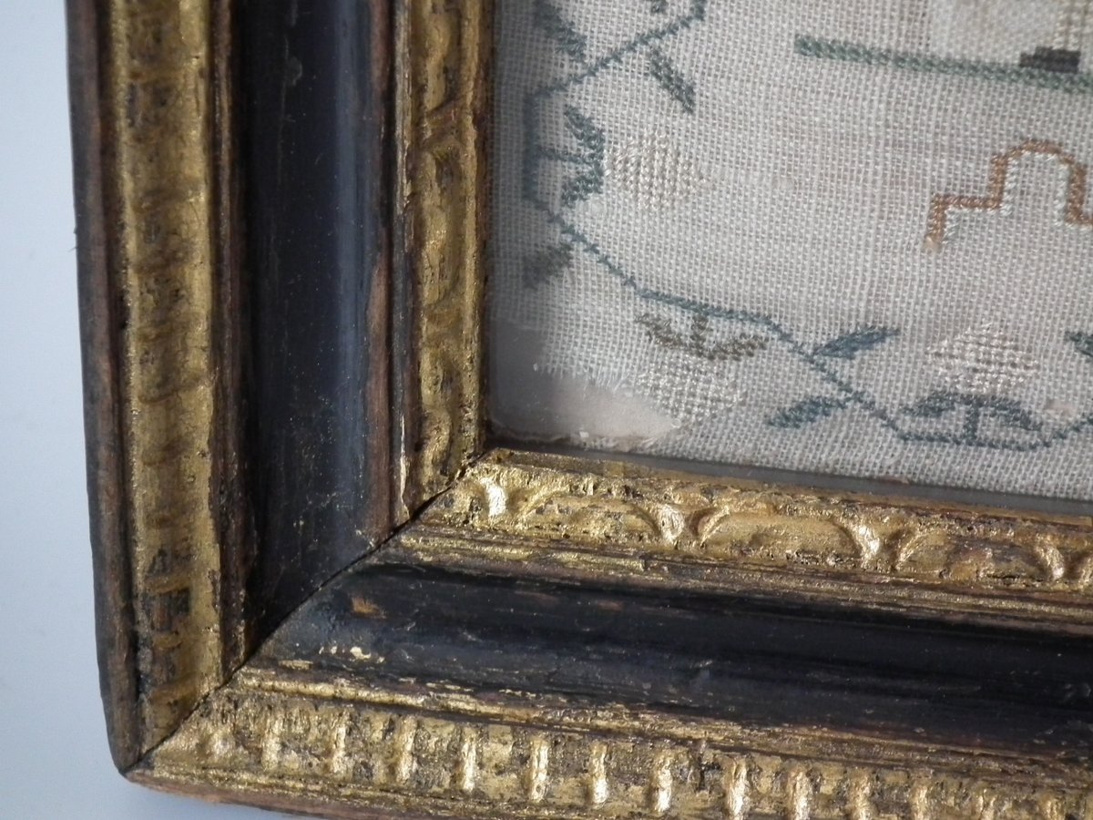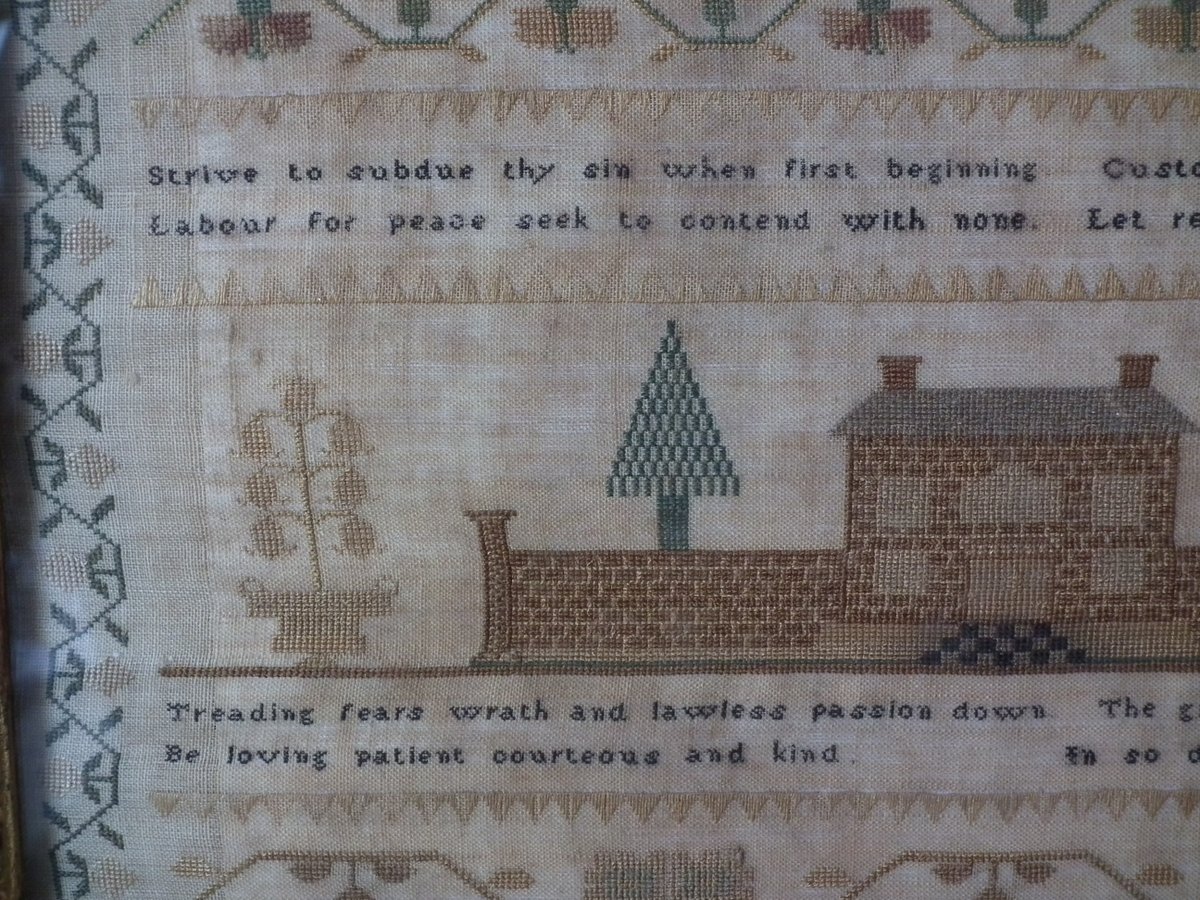 The sampler is worked in silk on linen ground, in a variety of stitches.