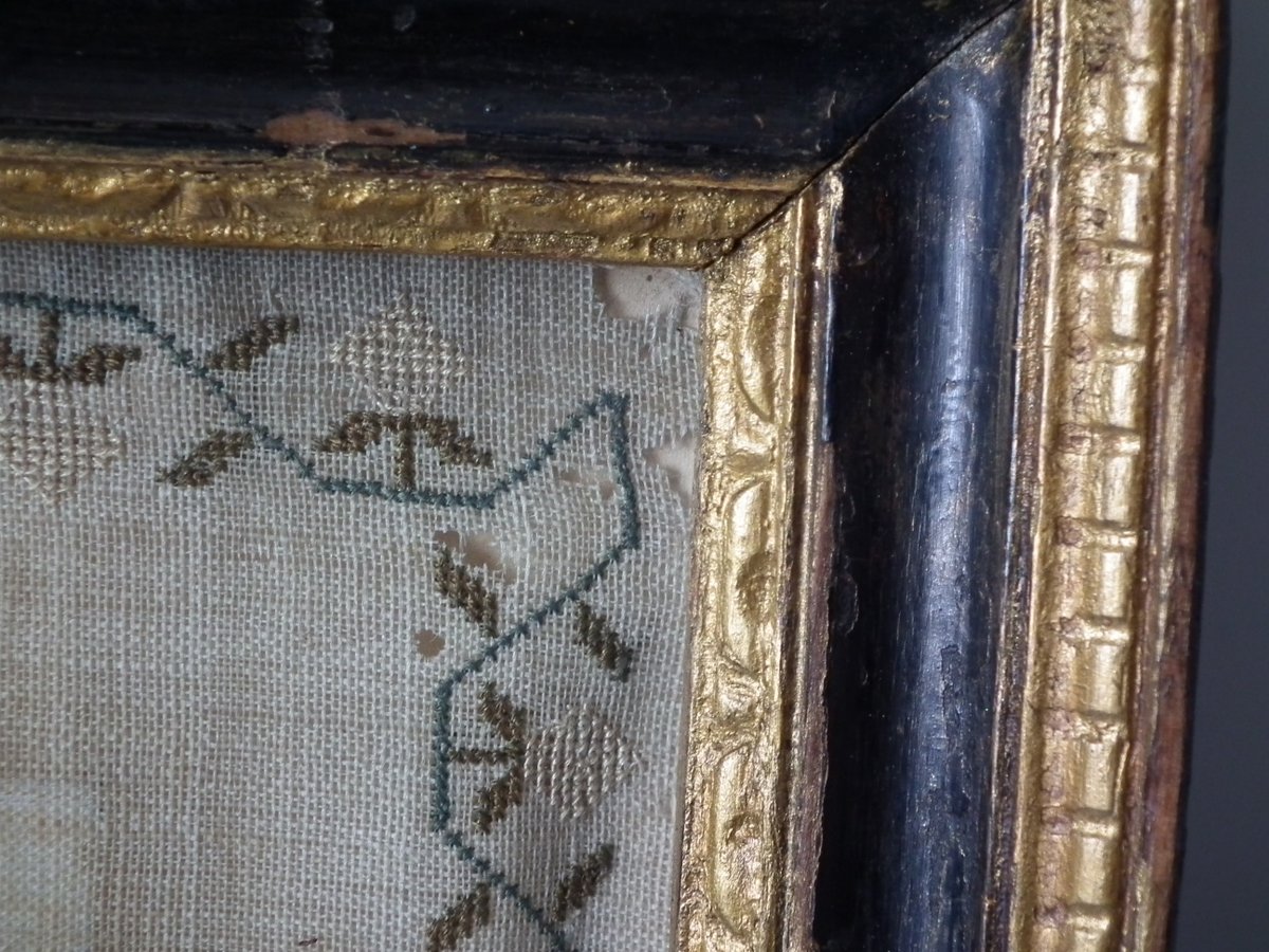 Some stitch losses to the border, divider lines, the signature, motifs and verses.