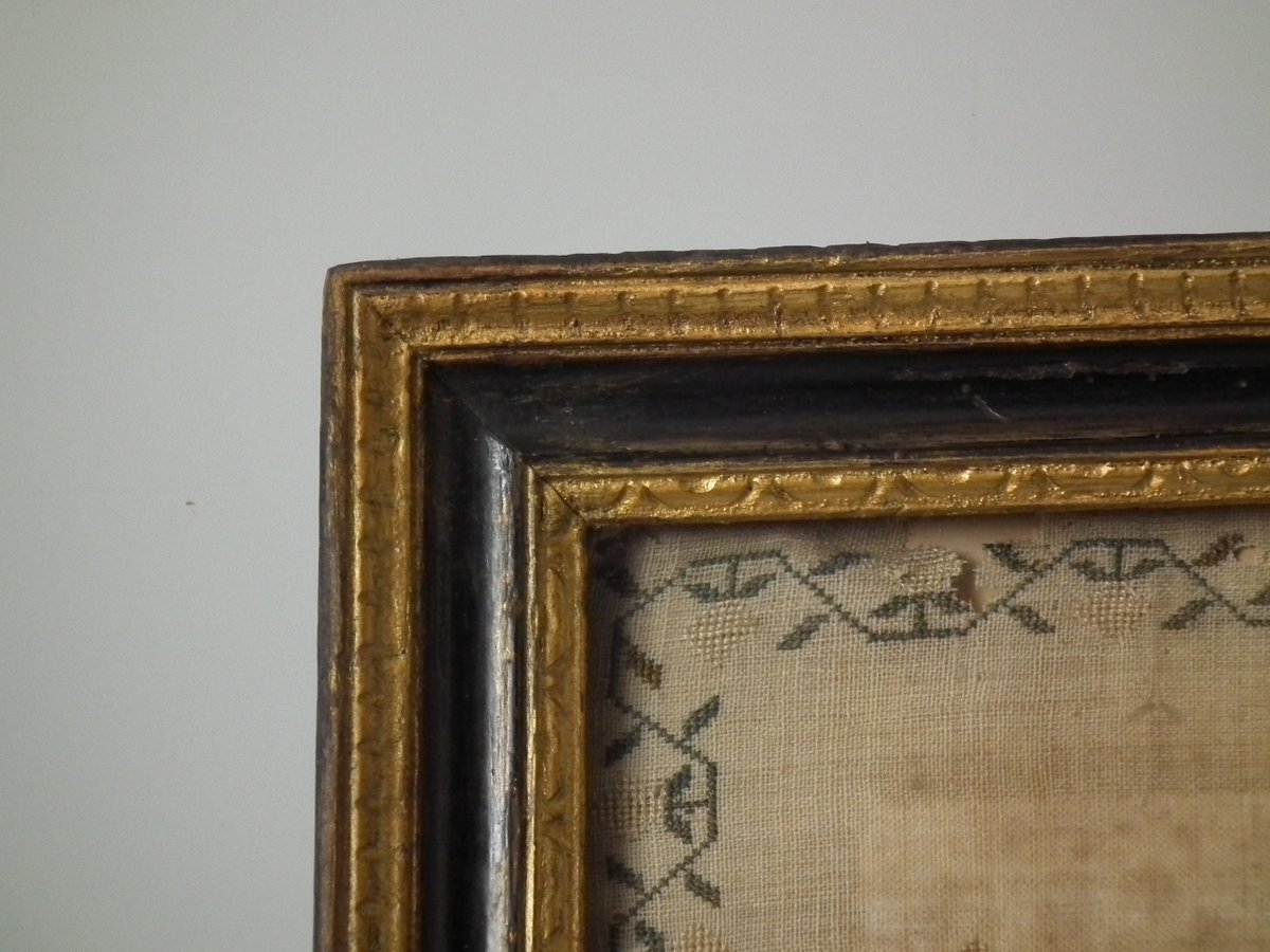 George III, dated 1808. 19ins by 12.5 ins wide. 1808 Sampler by Martha Watts. Framed in an old wood frame with glass. Tacked onto to a wooden stretcher frame.