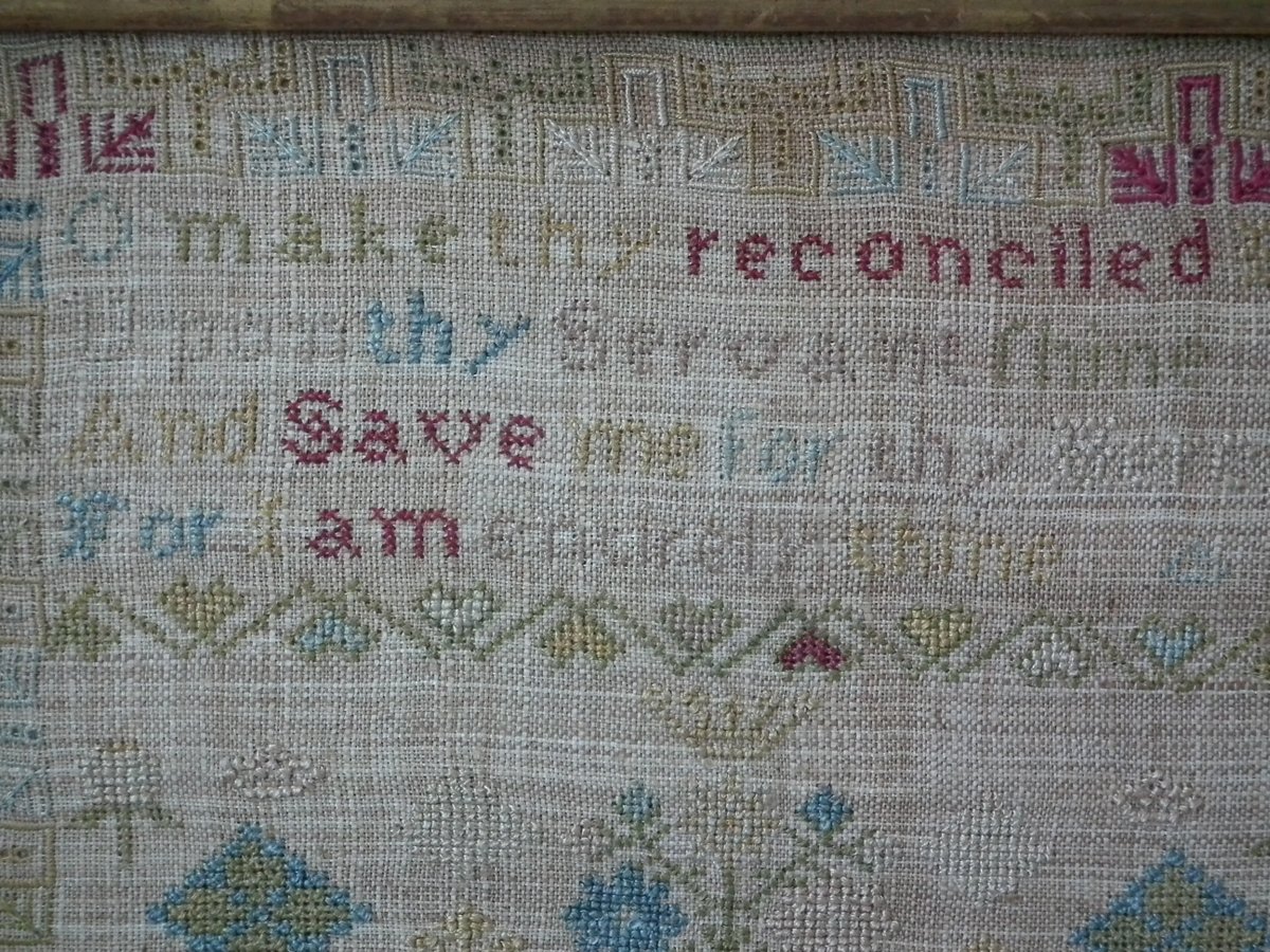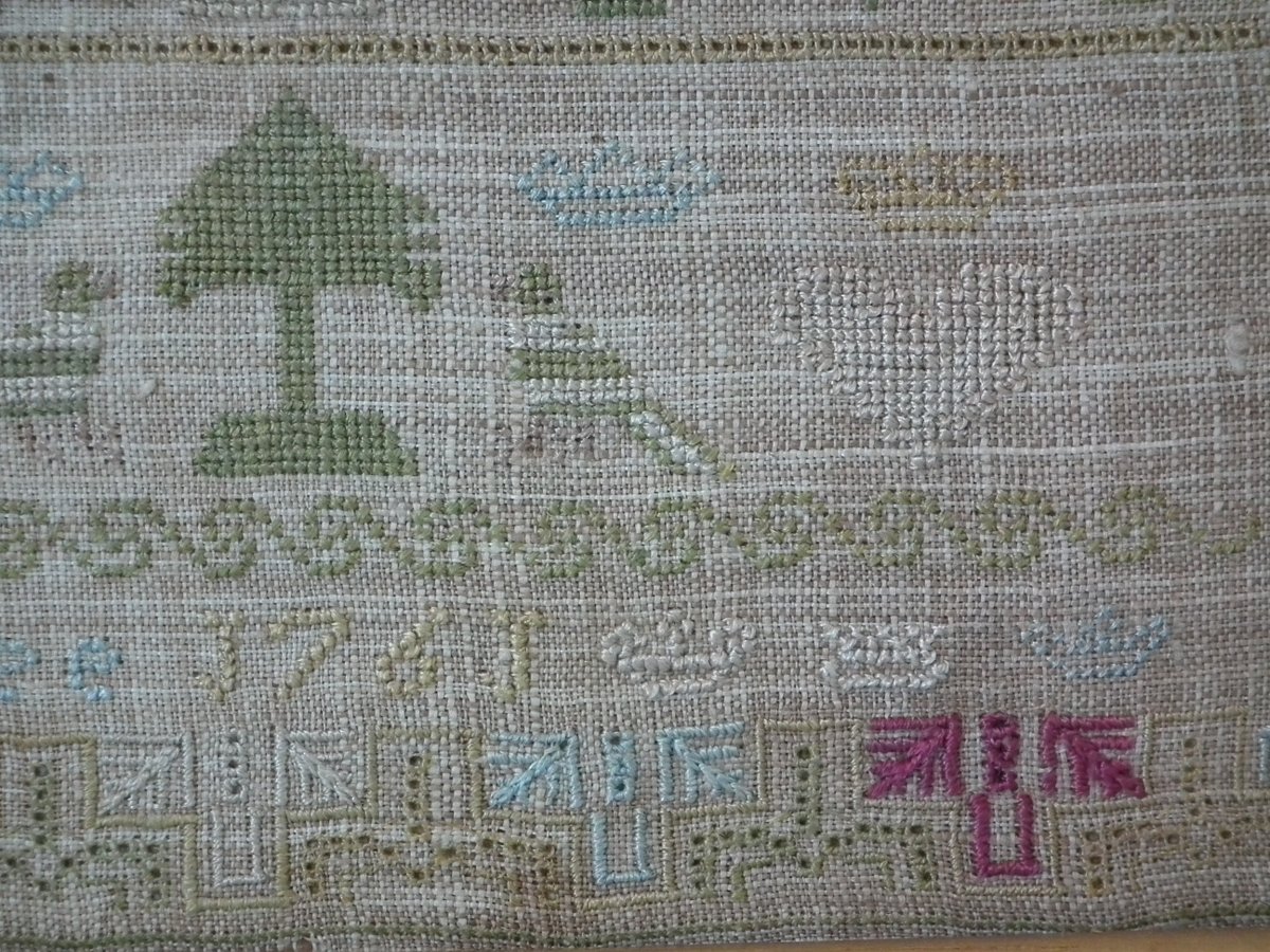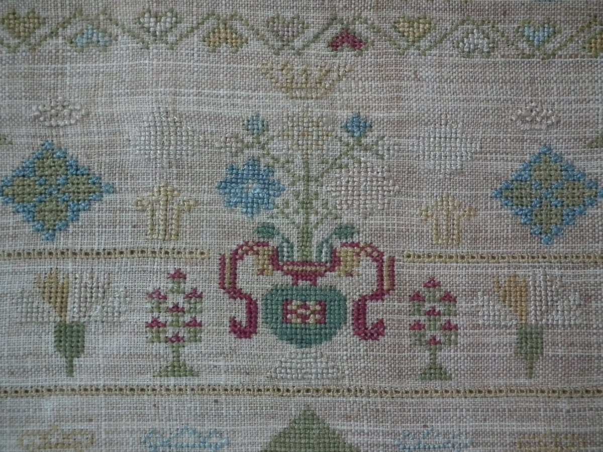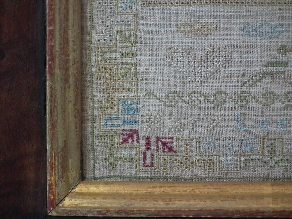 The sampler is worked in silk on linen ground, in a variety of stitches including Algerian eye.