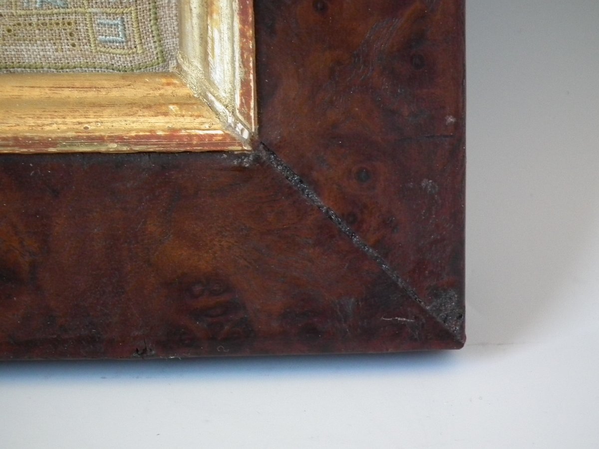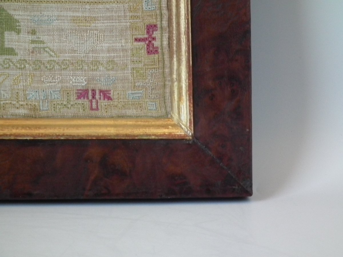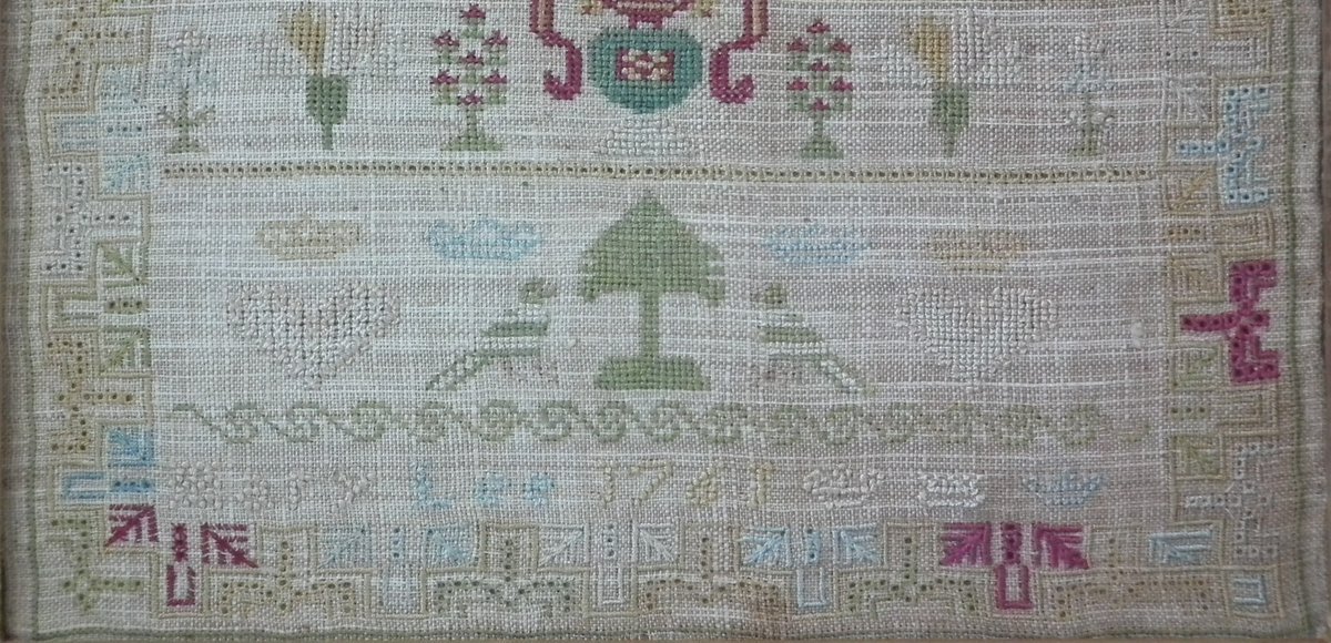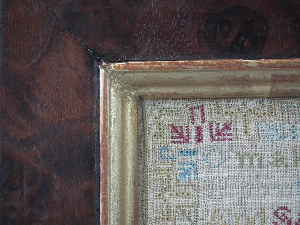 The sampler is worked in silk on linen ground, in a variety of stitches including Algerian eye.