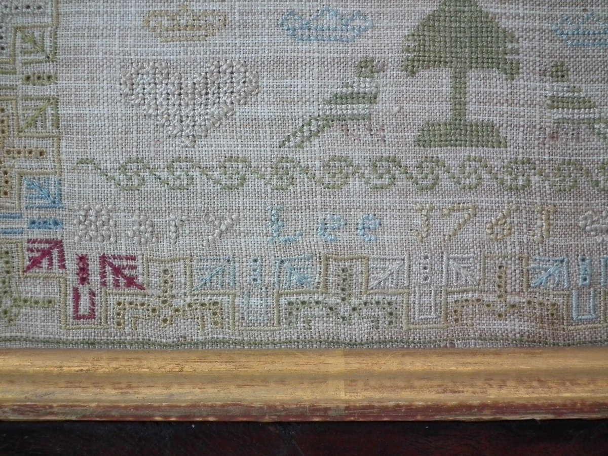 George III, dated 1761. 7.5ins high by 7ins wide. Antique Sampler, 1761, by Mary Lee. Framed in an old wood frame with rippled, old glass.