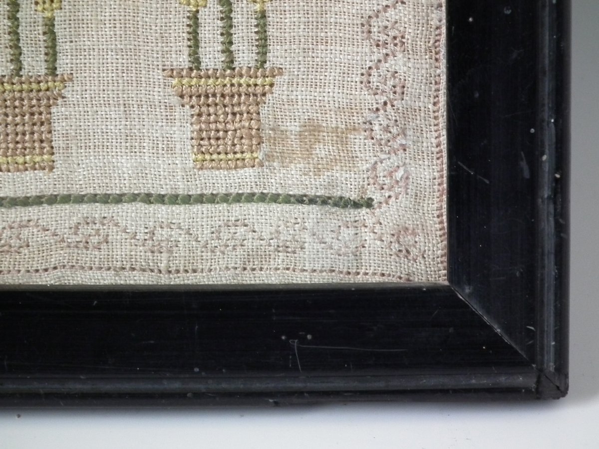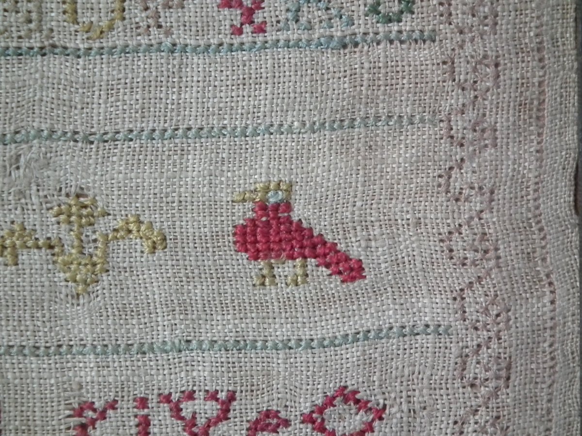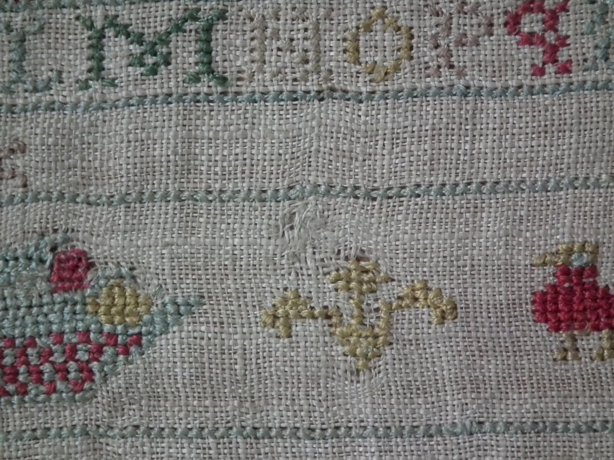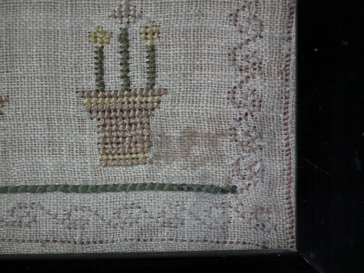 The sampler is worked in silk on linen ground, in cross stitch and Algerian eye.