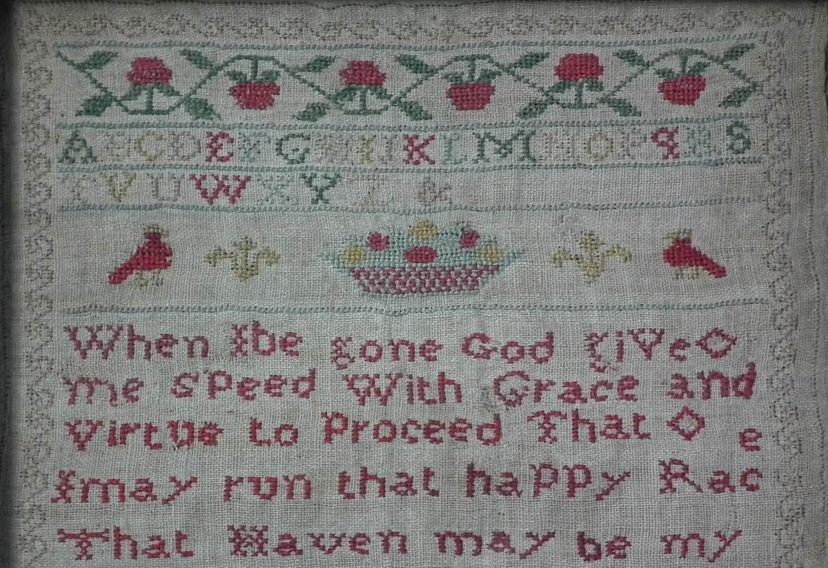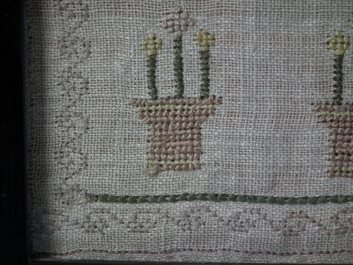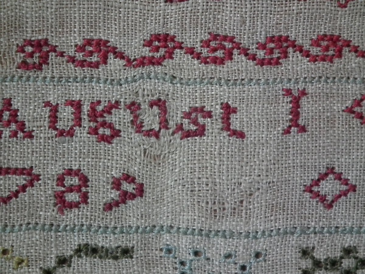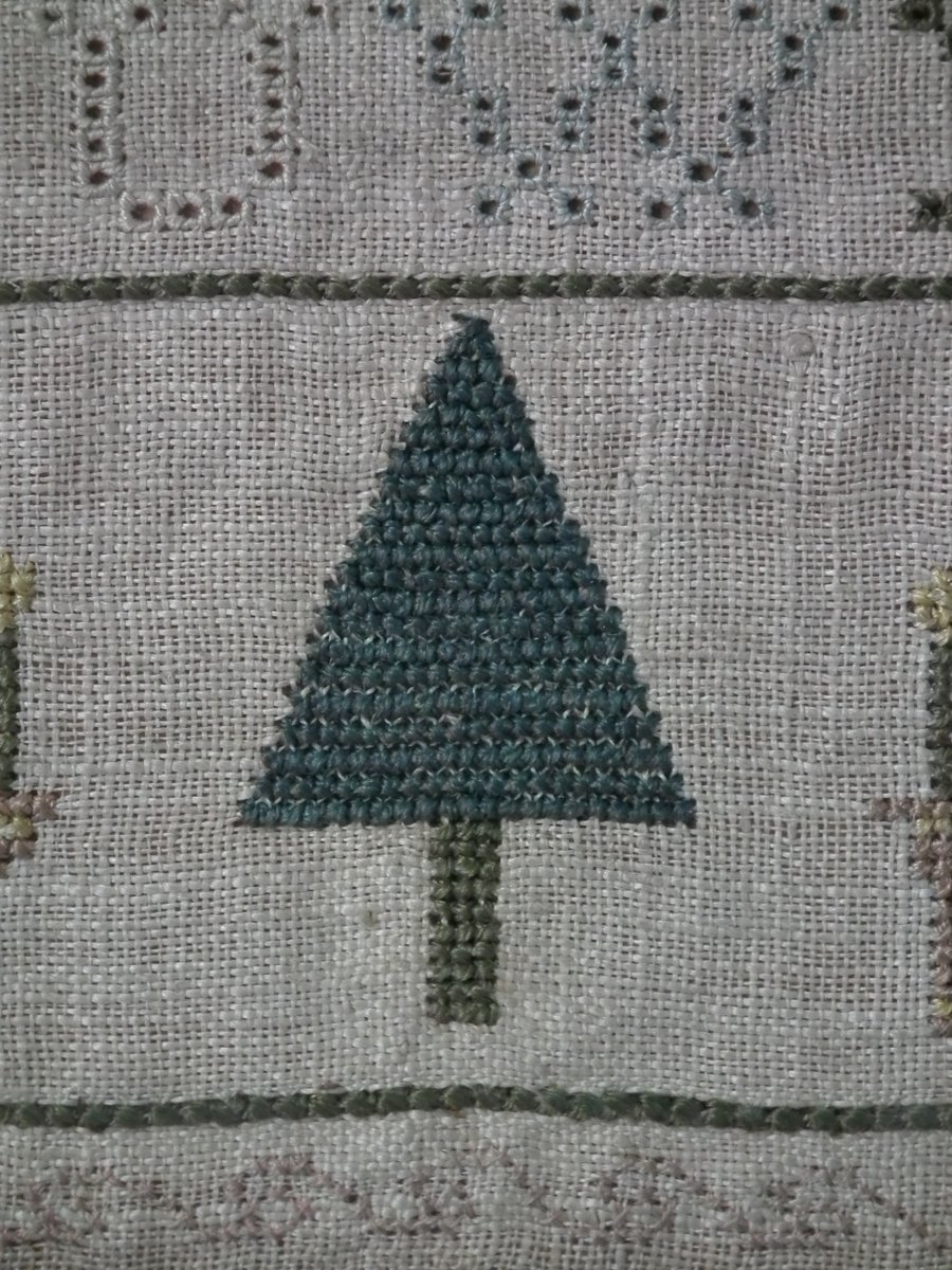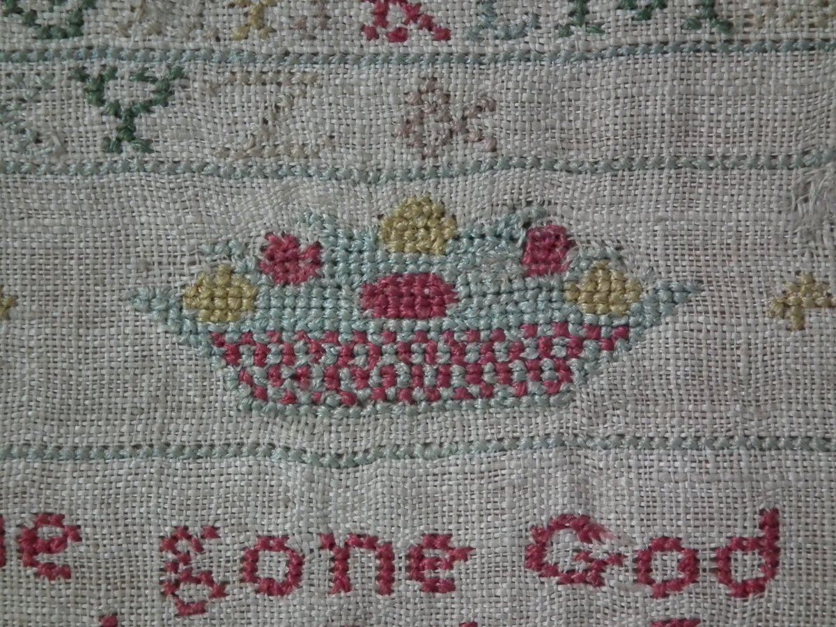 The sampler is worked in silk on linen ground, in cross stitch and Algerian eye.