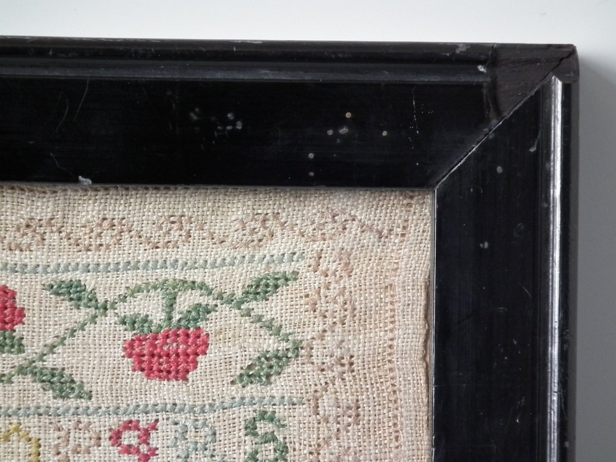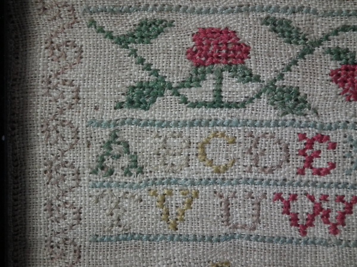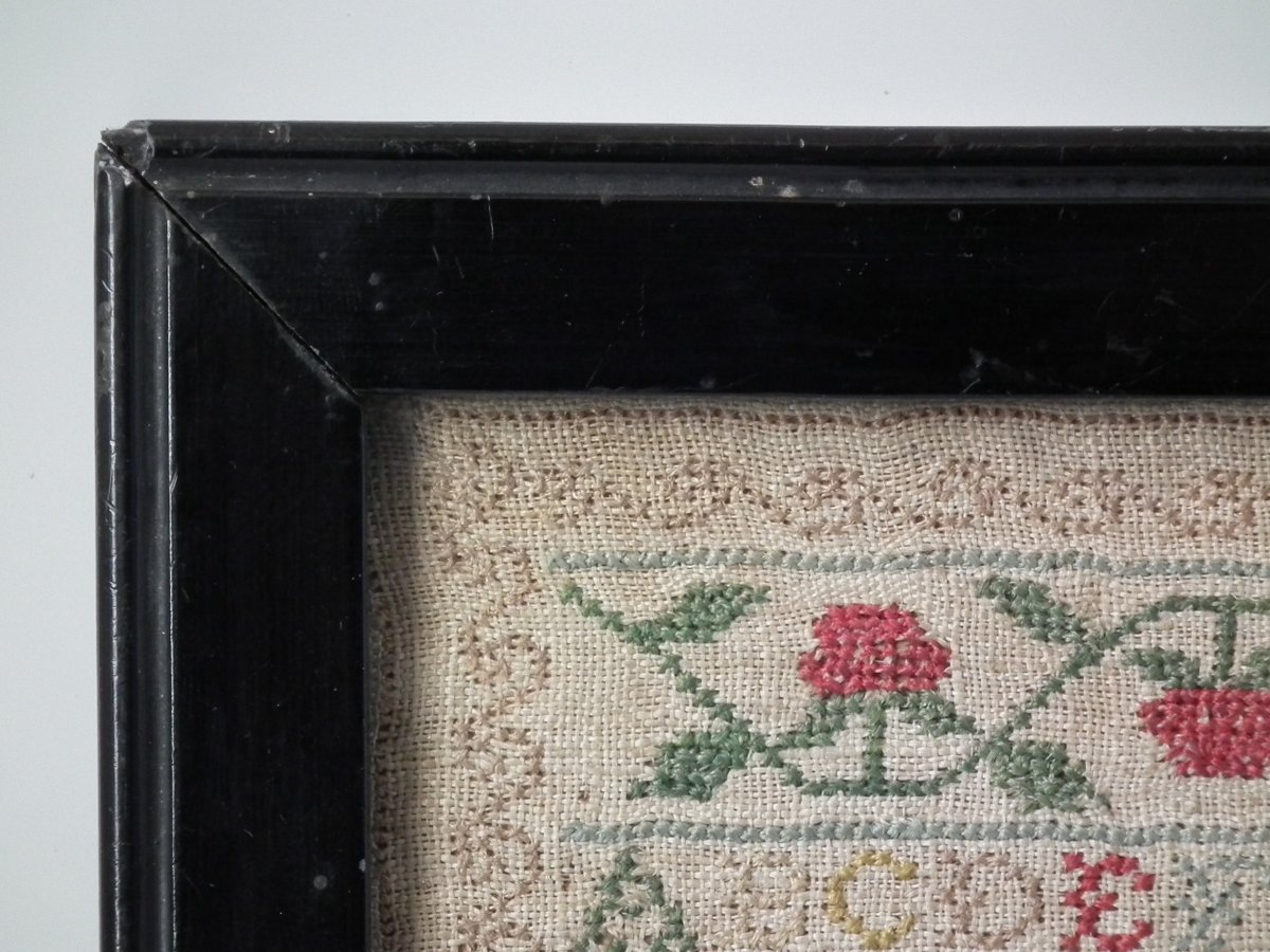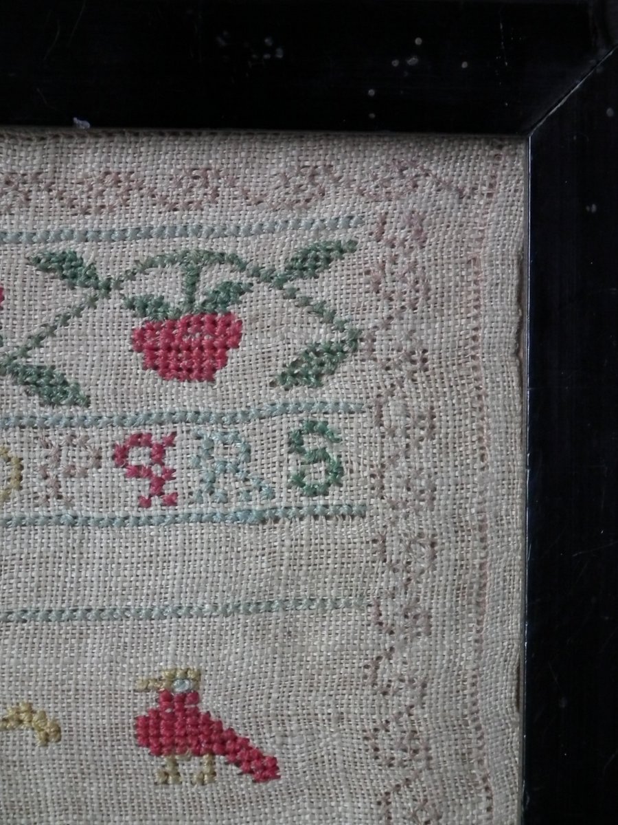 The sampler is worked in silk on linen ground, in cross stitch and Algerian eye.
