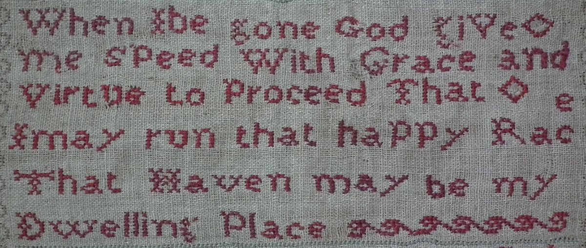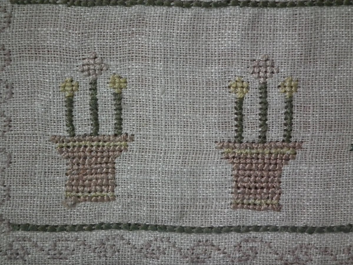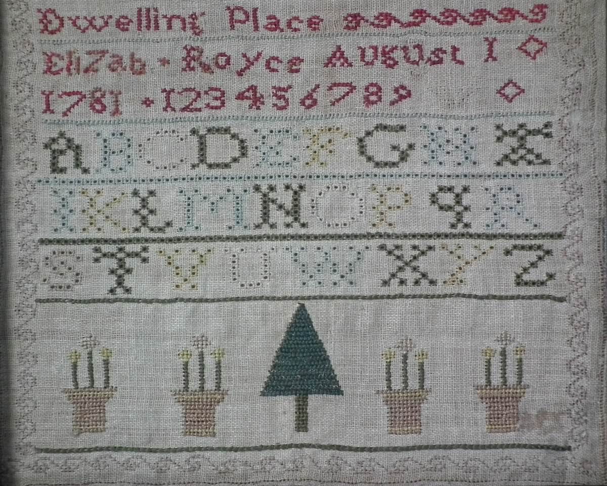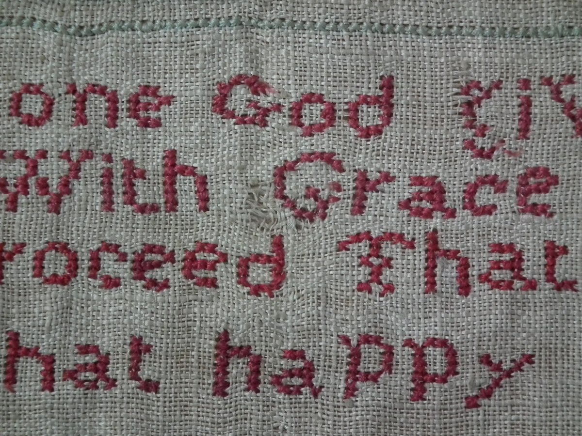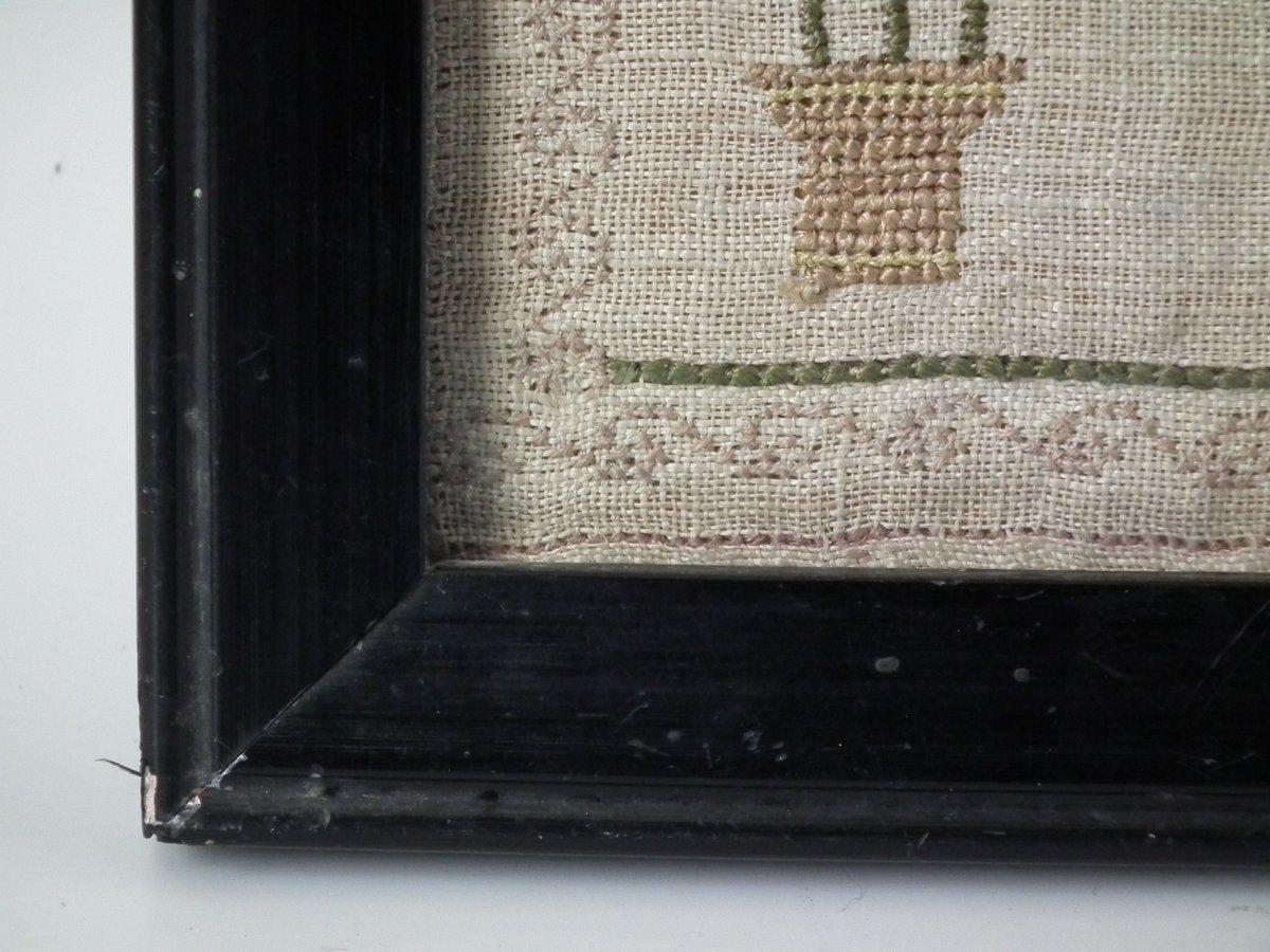 The sampler is worked in silk on linen ground, in cross stitch and Algerian eye.