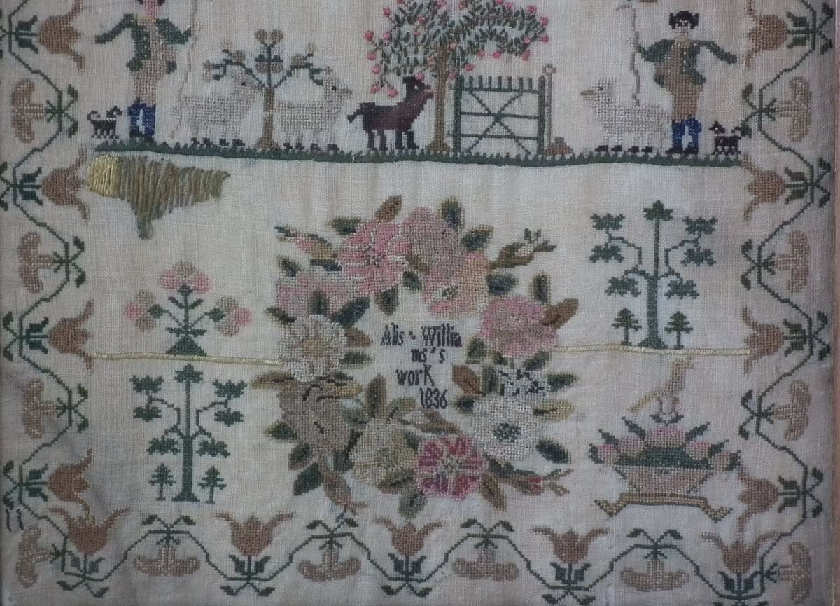 William IV, dated 1836. 19ins high by 12.5ins wide. Antique Sampler, 1836, By Alis Williams. Framed in an old wood frame with rippled, old glass.