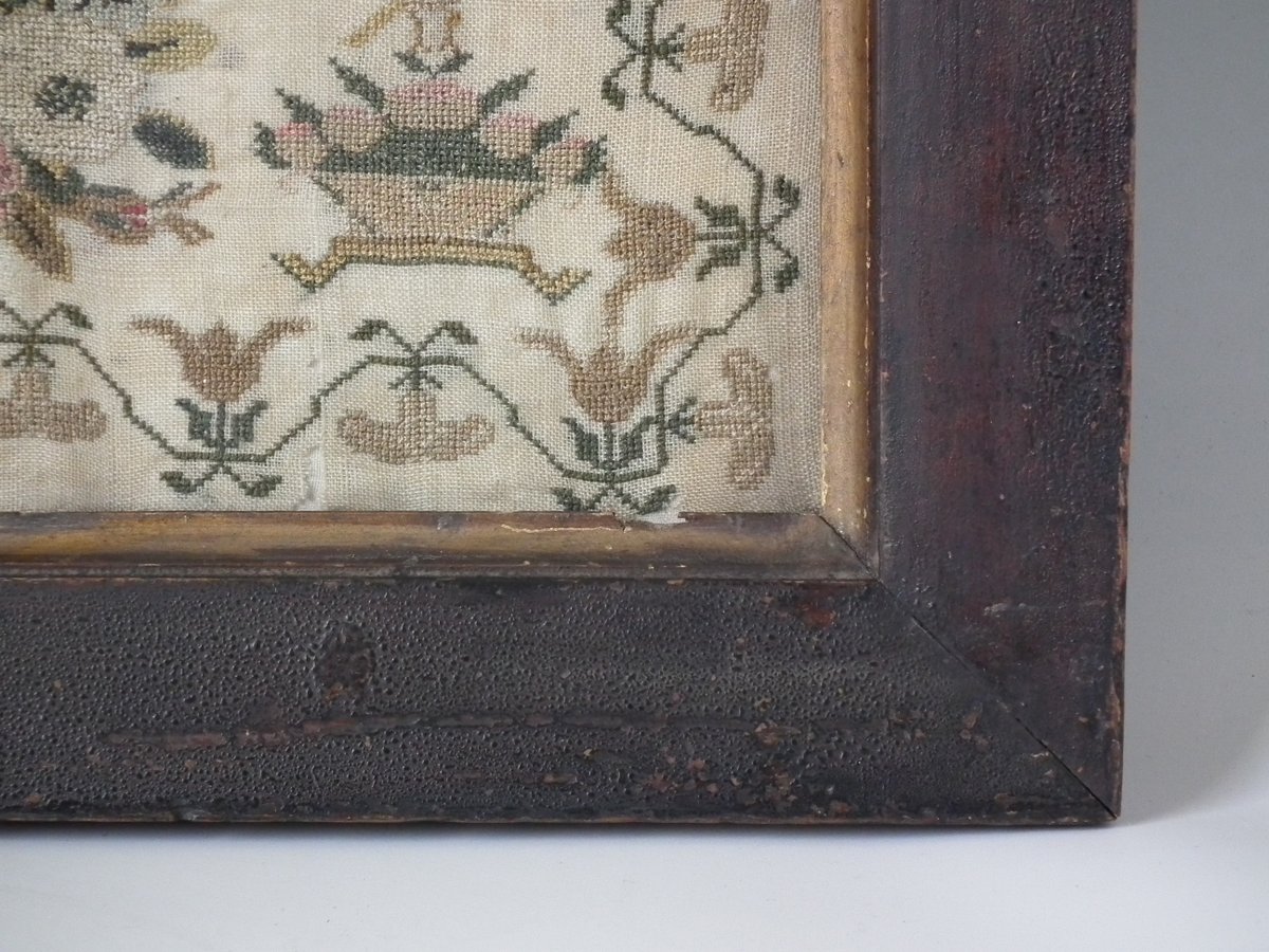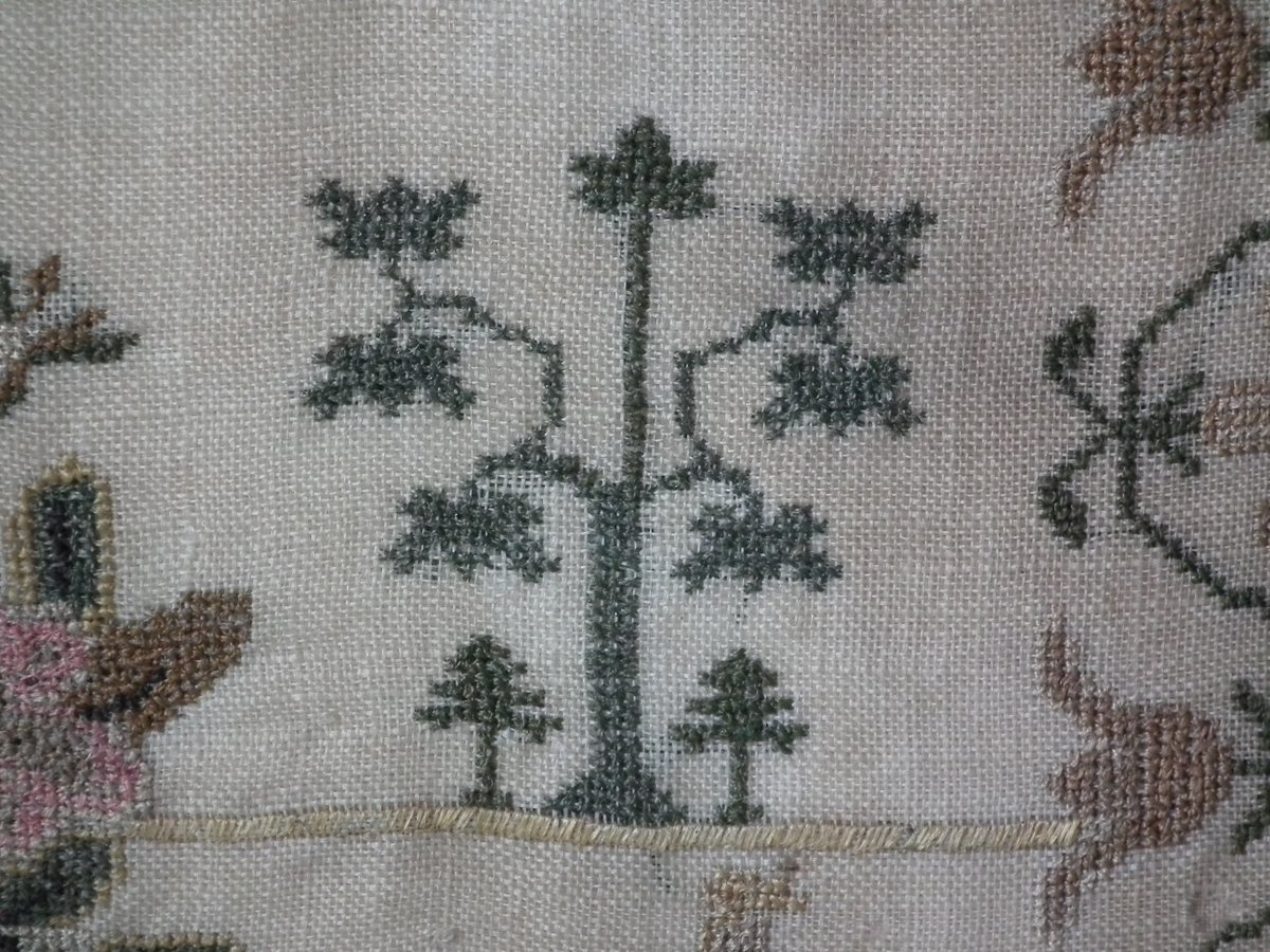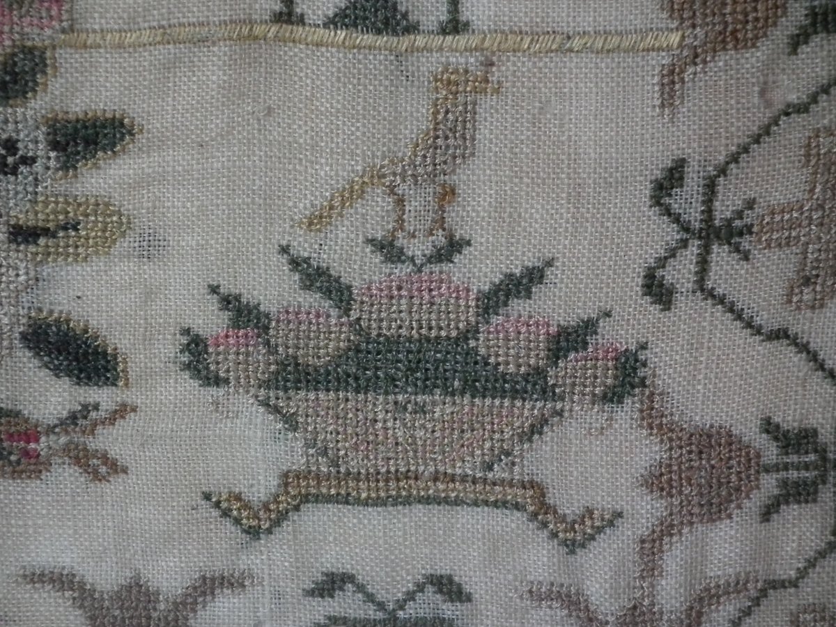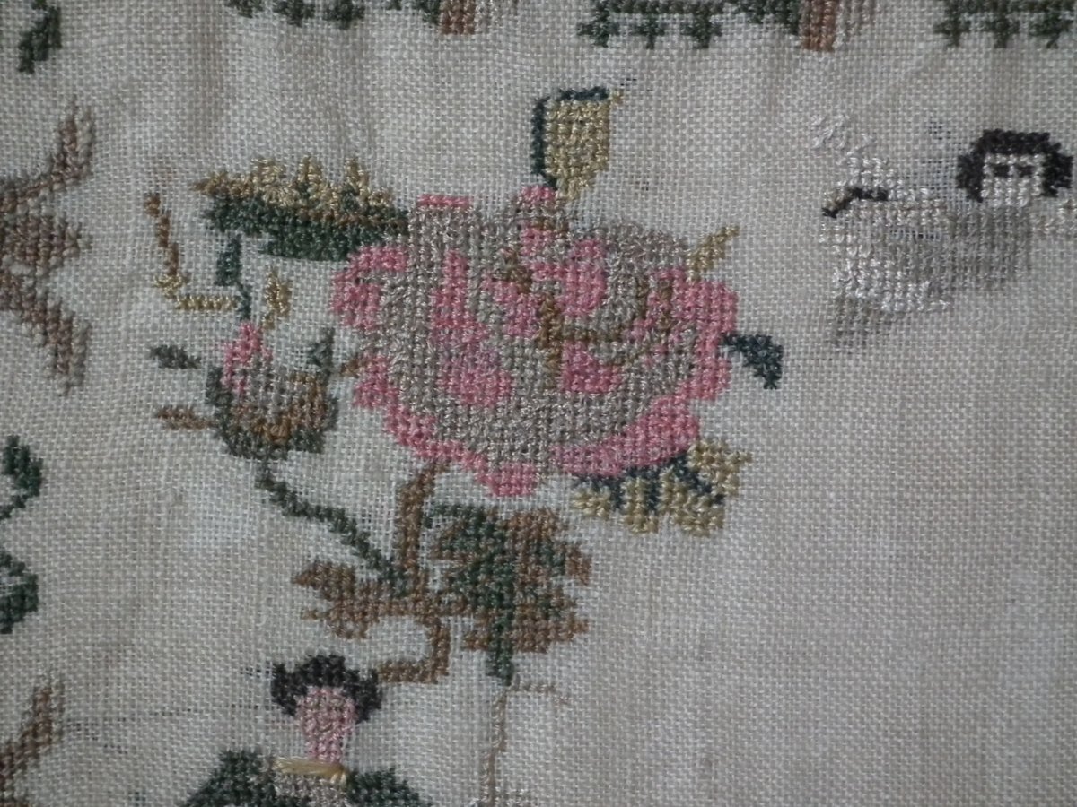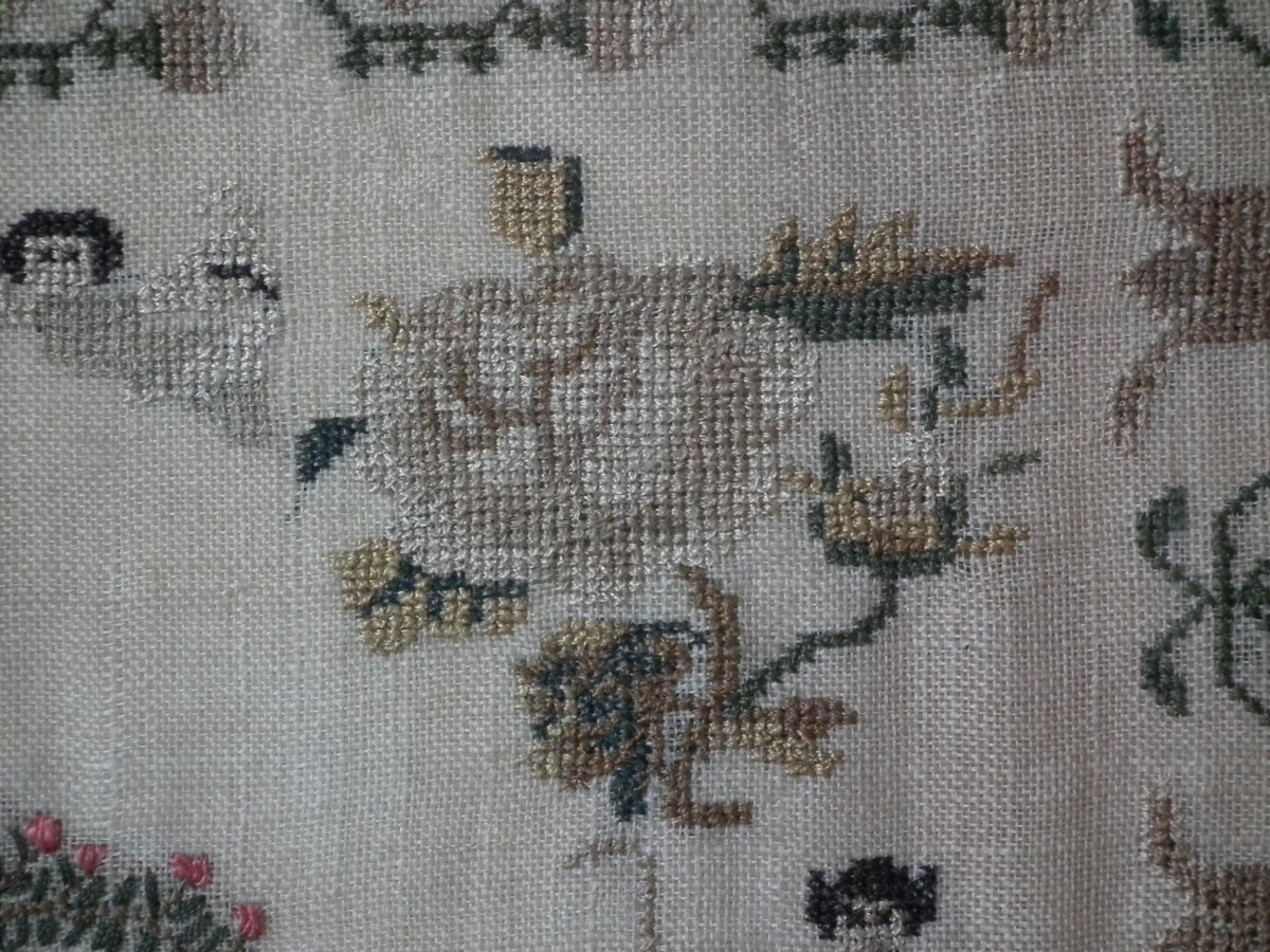The sampler is worked in silk on a linen ground, in a variety of stitches.