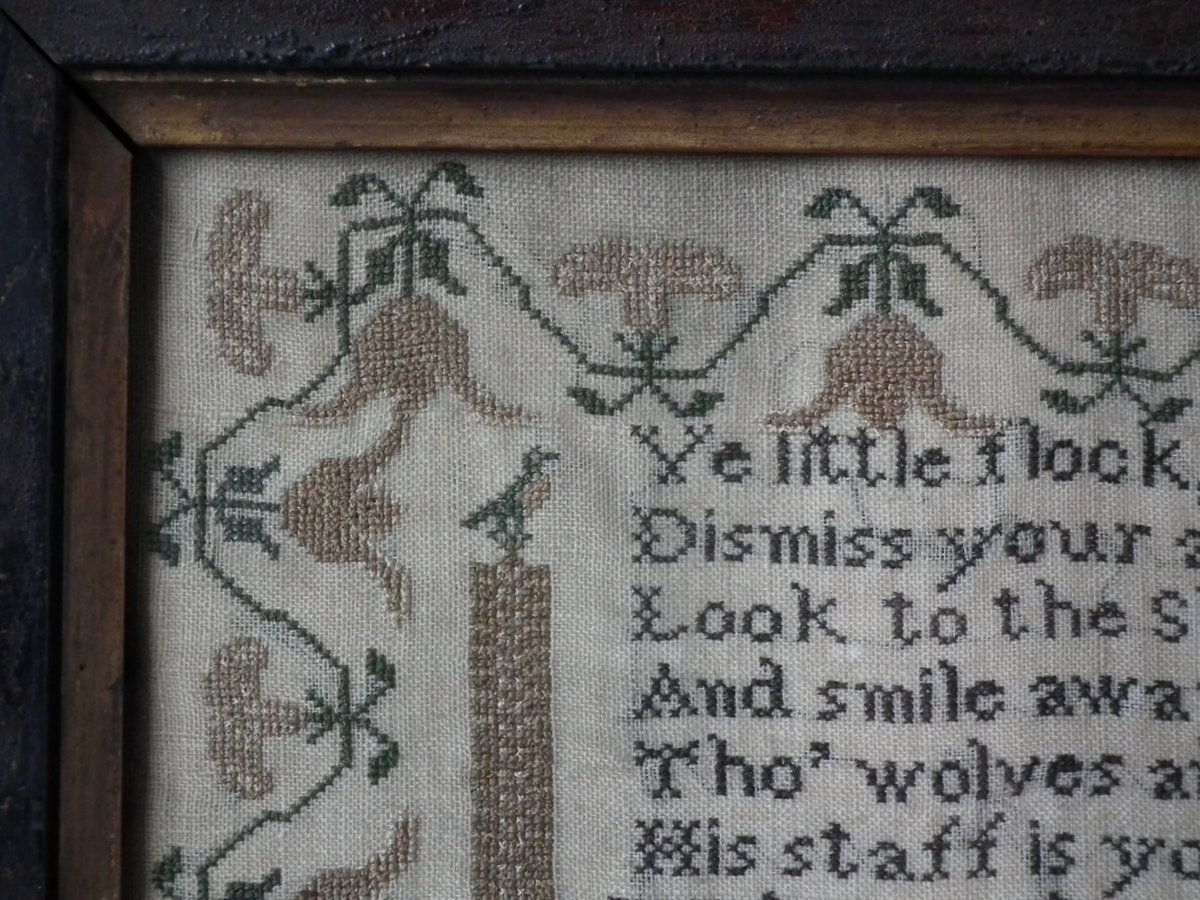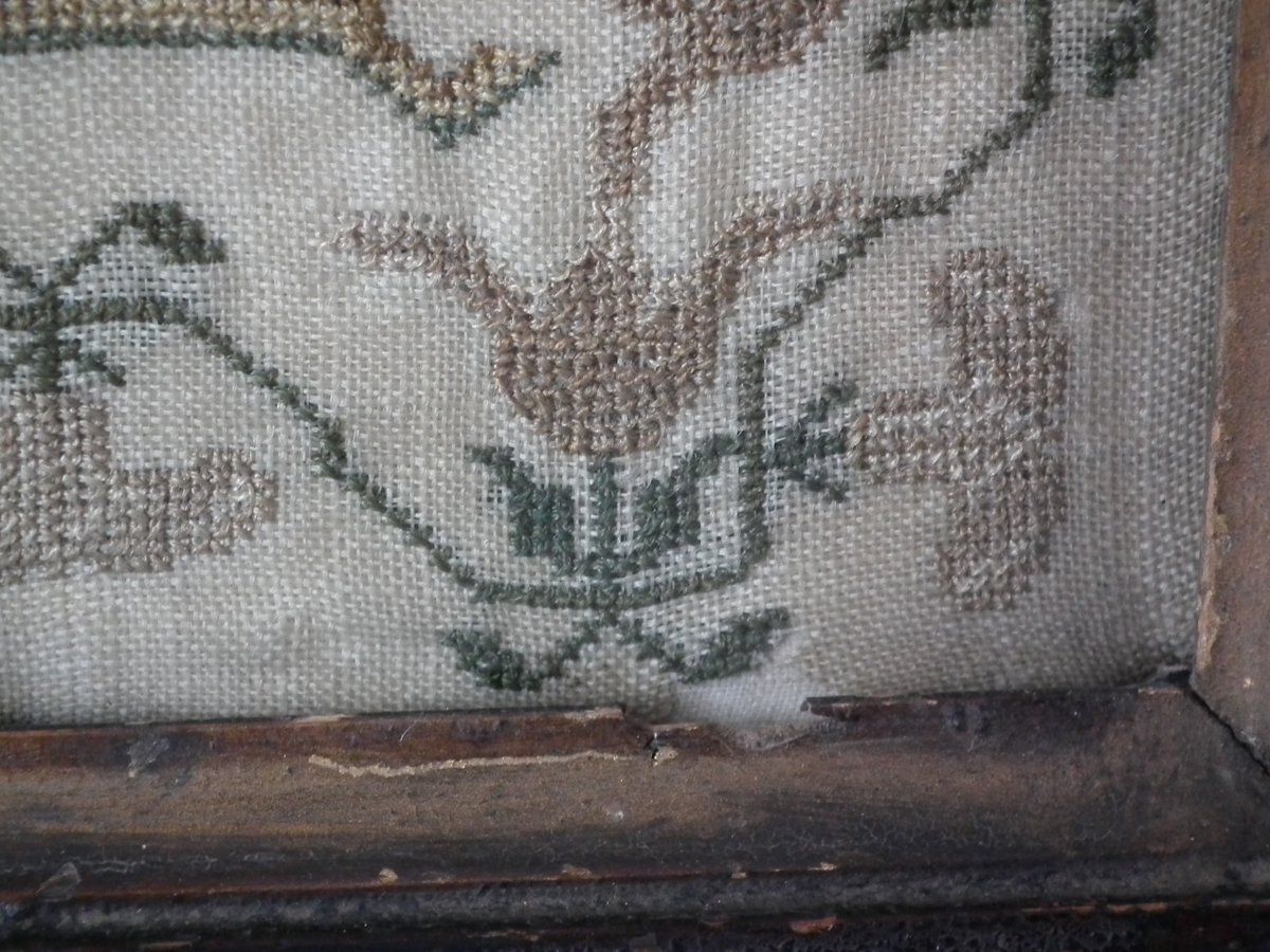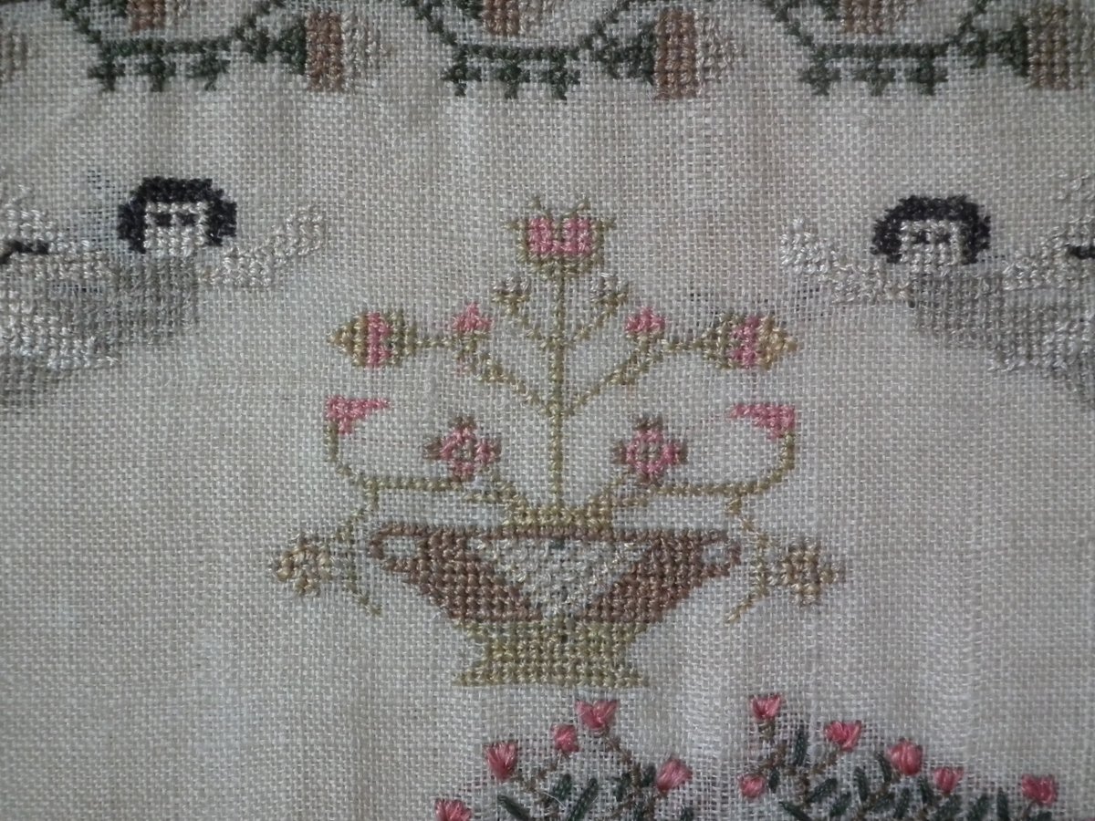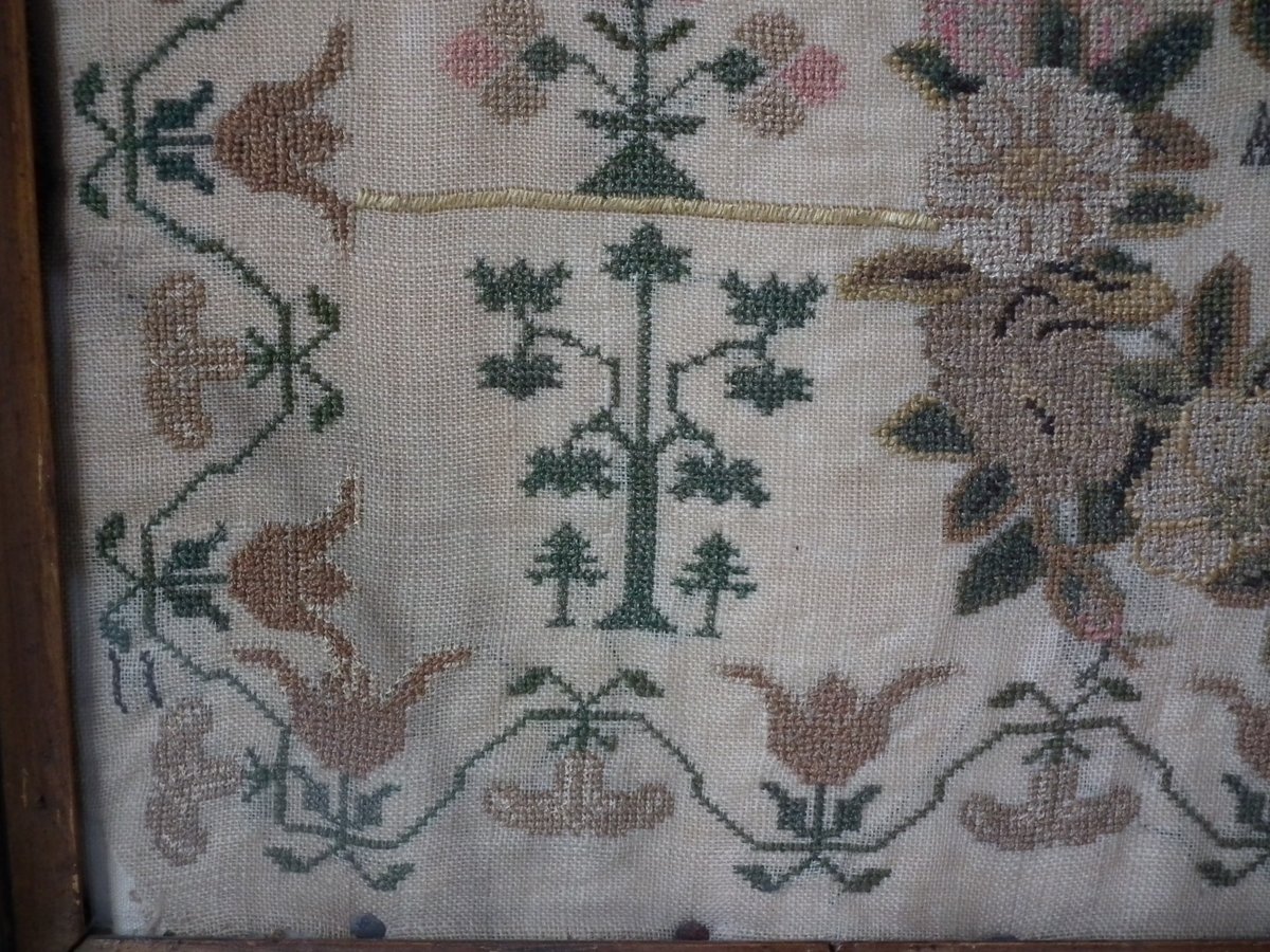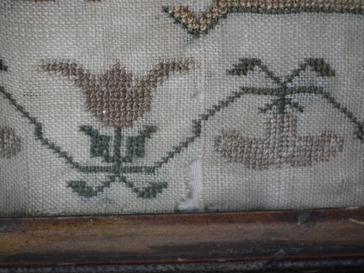 The sampler is worked in silk on a linen ground, in a variety of stitches.