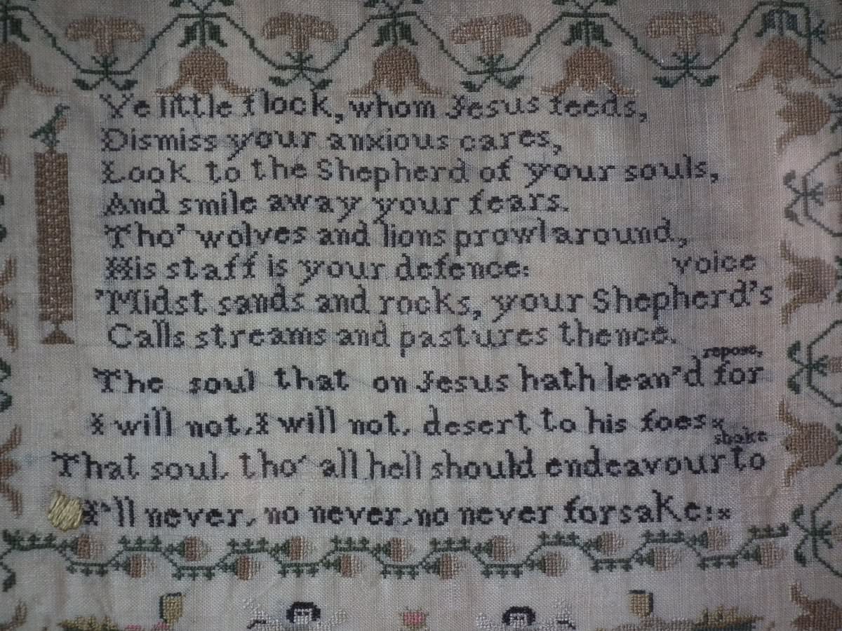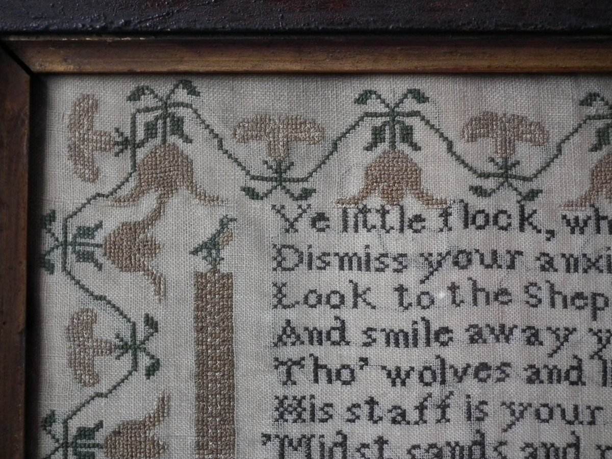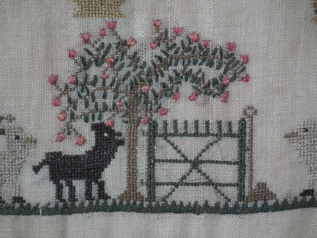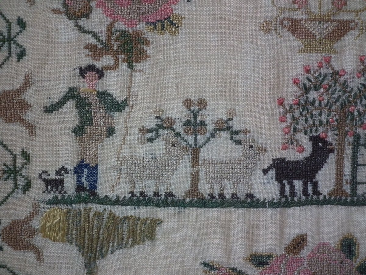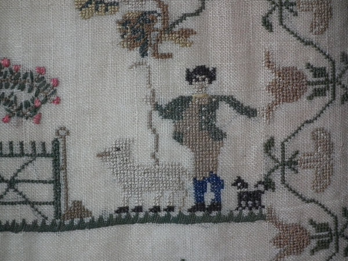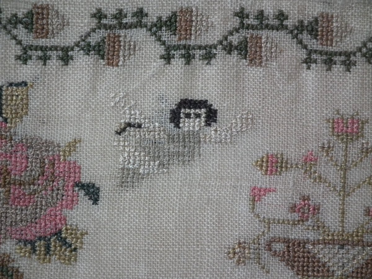 The sampler is worked in silk on a linen ground, in a variety of stitches.