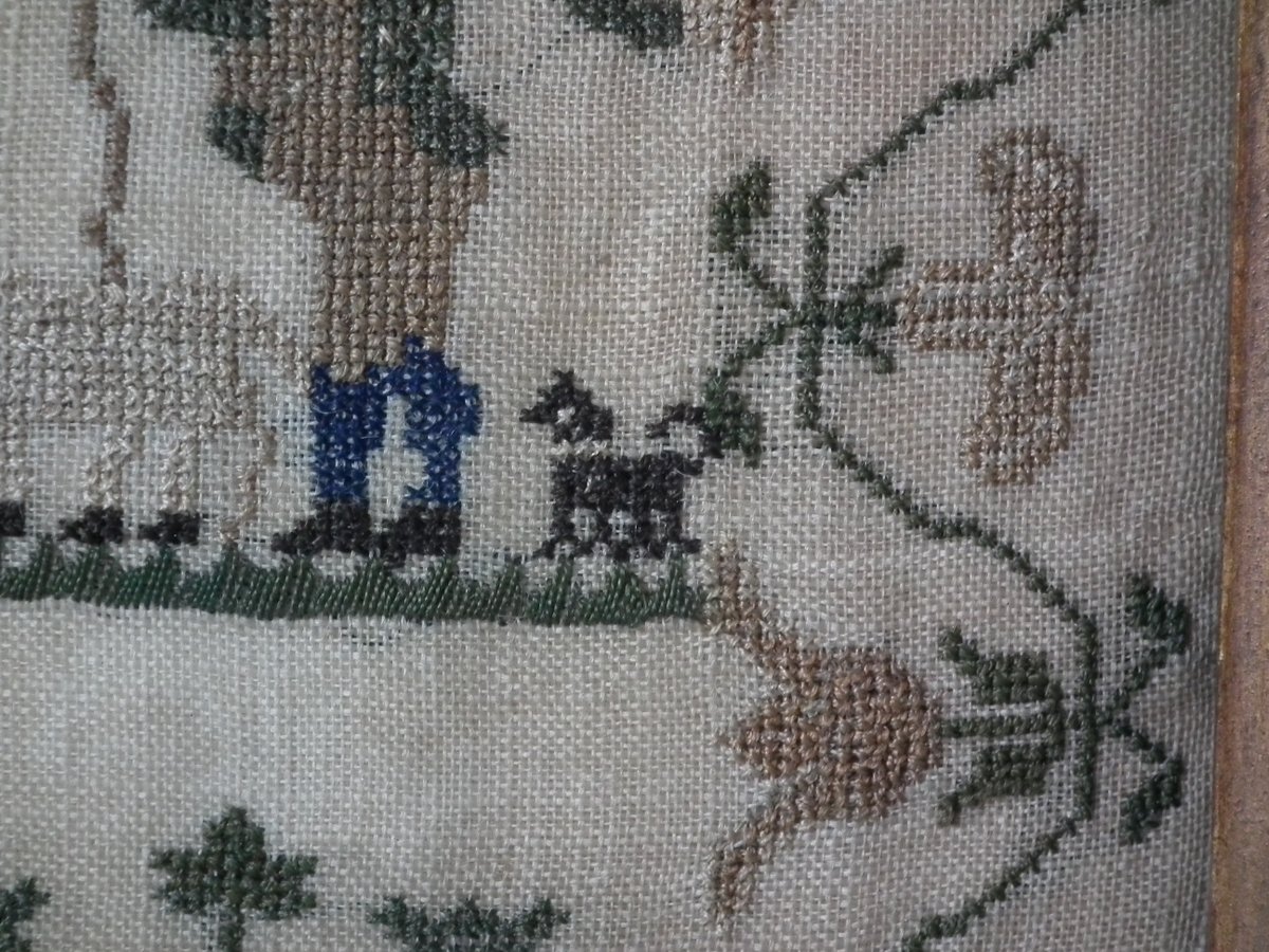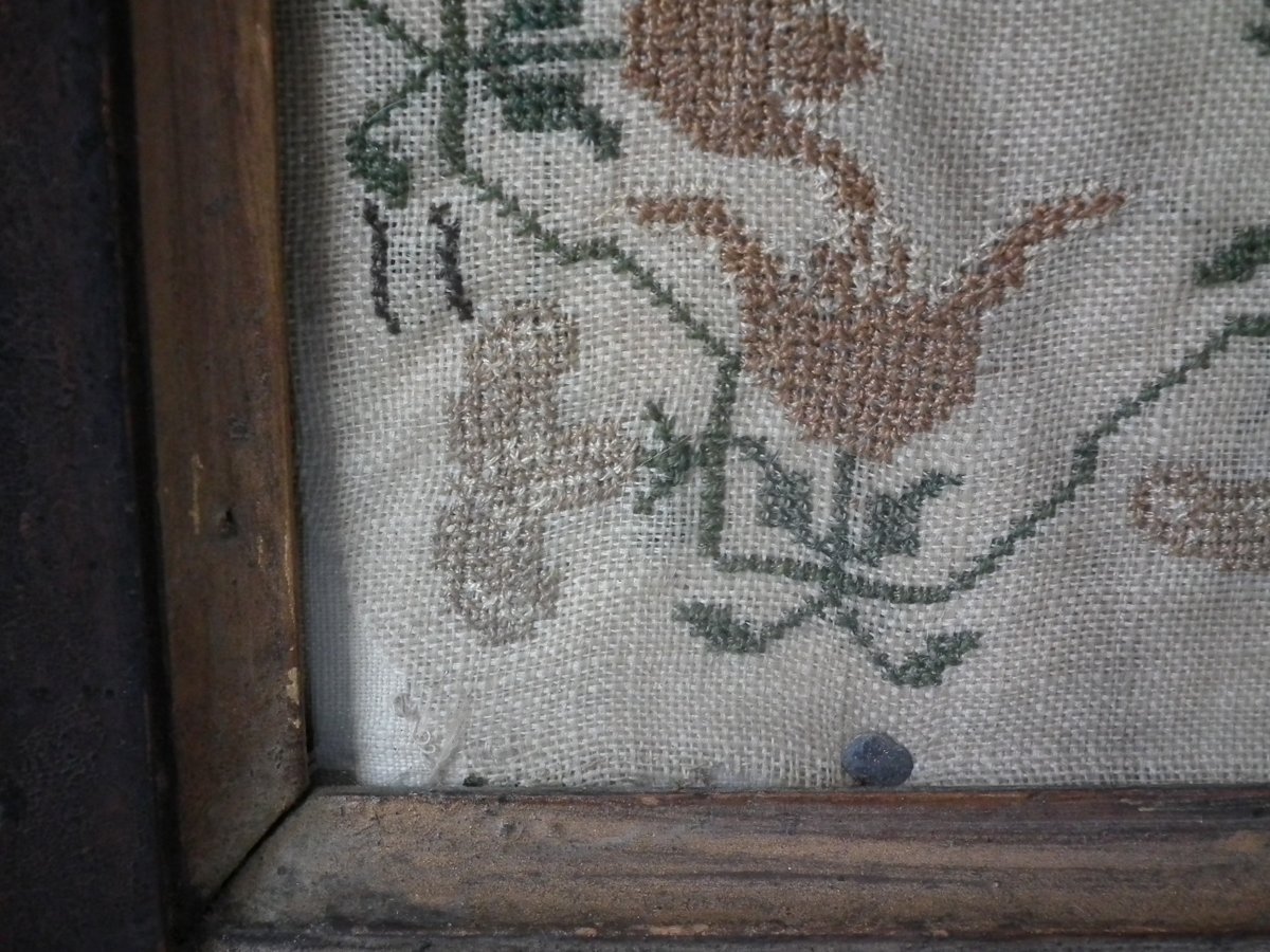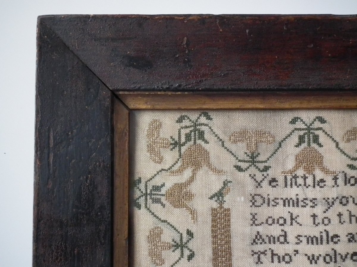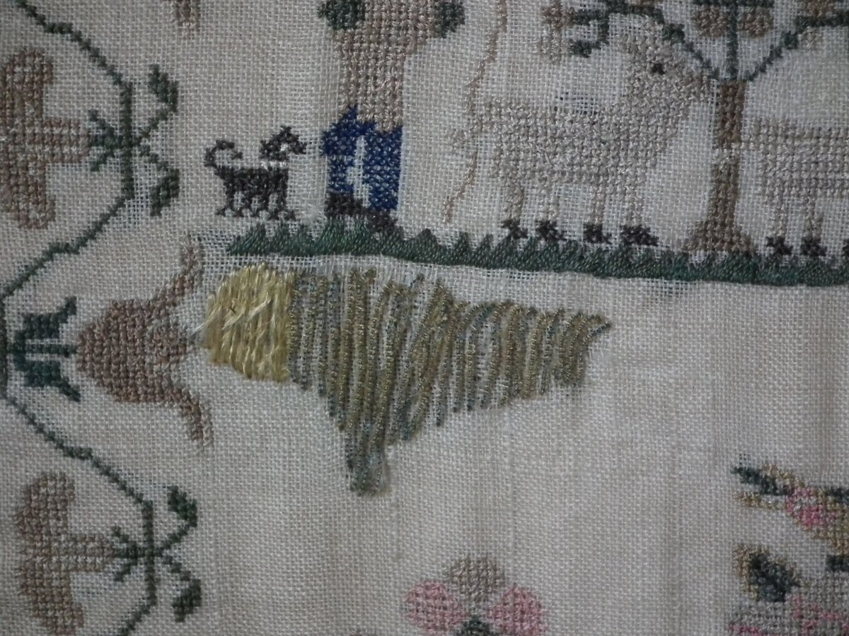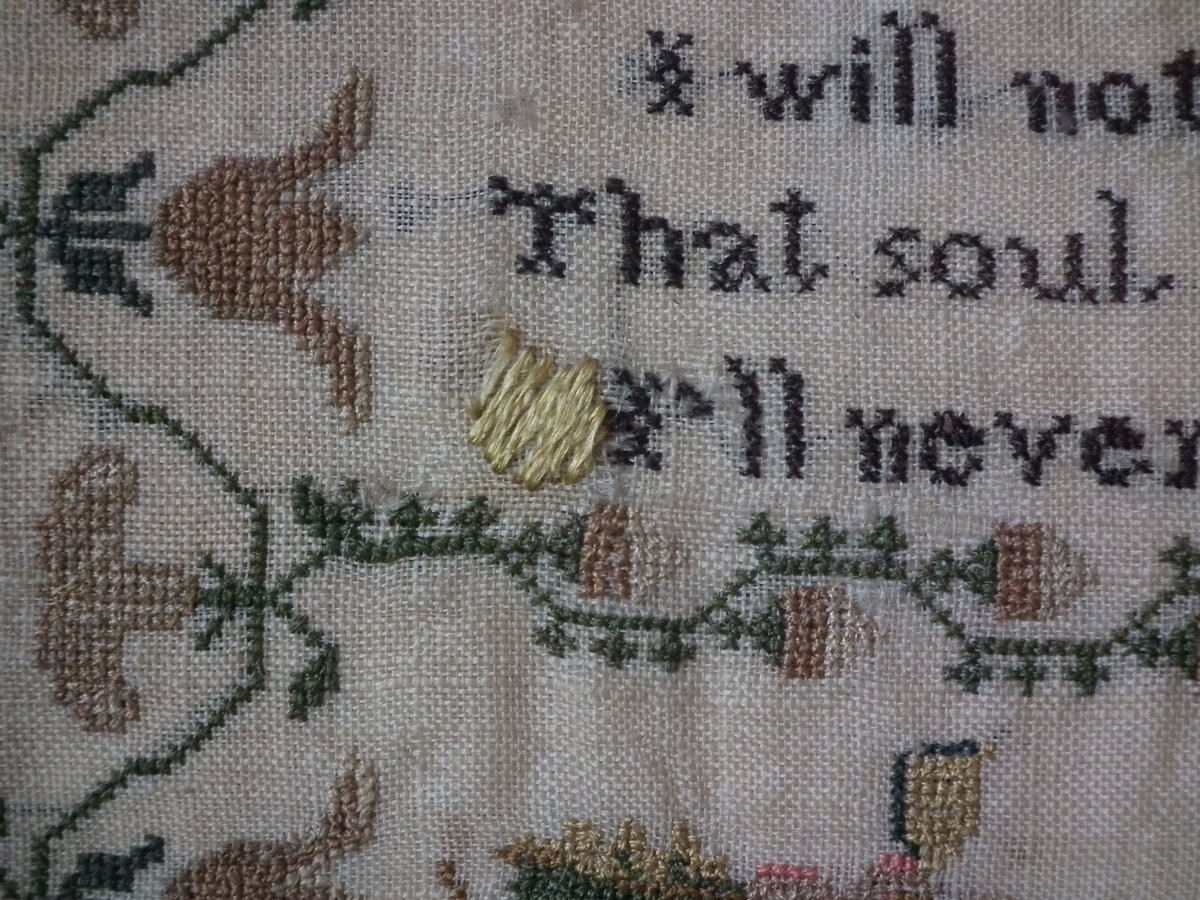The sampler is worked in silk on a linen ground, in a variety of stitches.