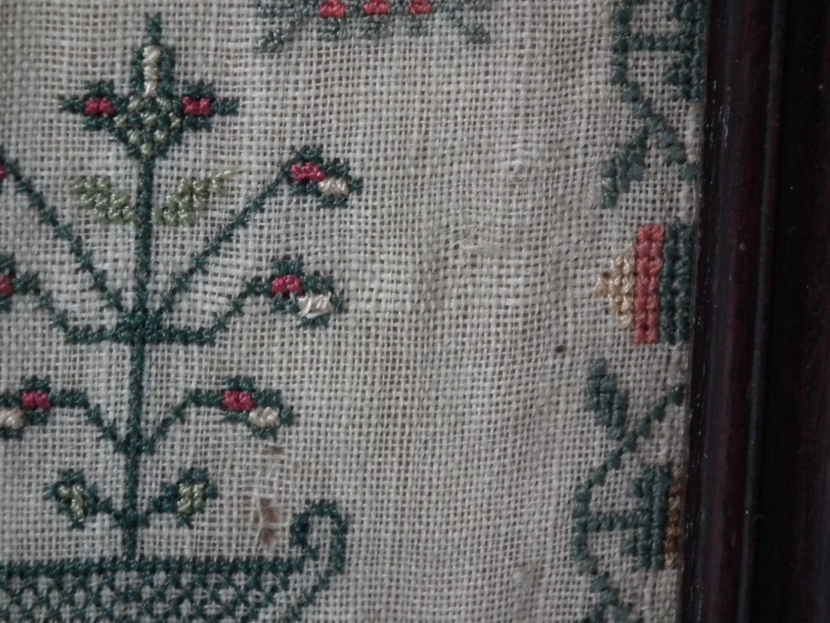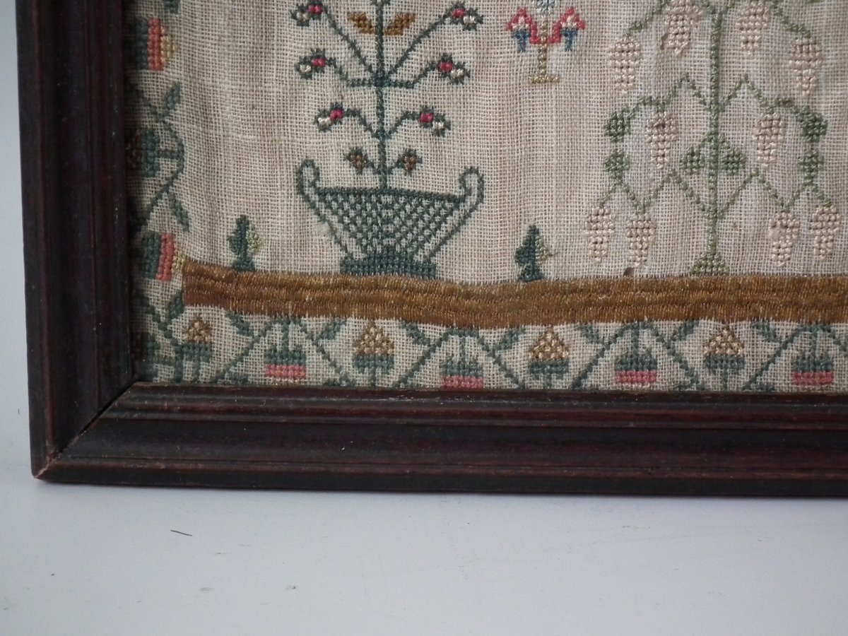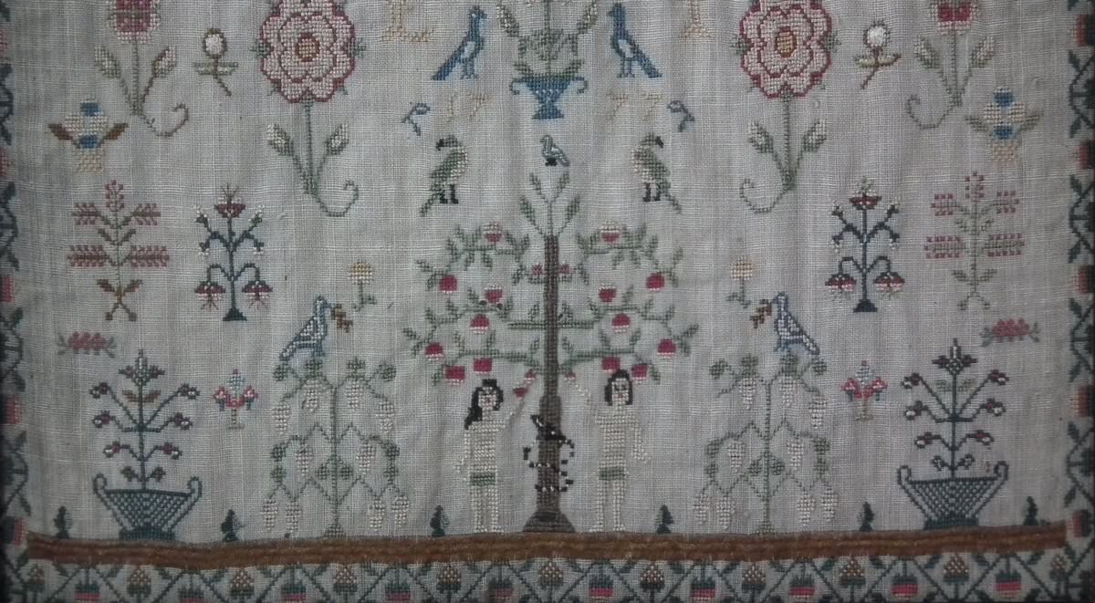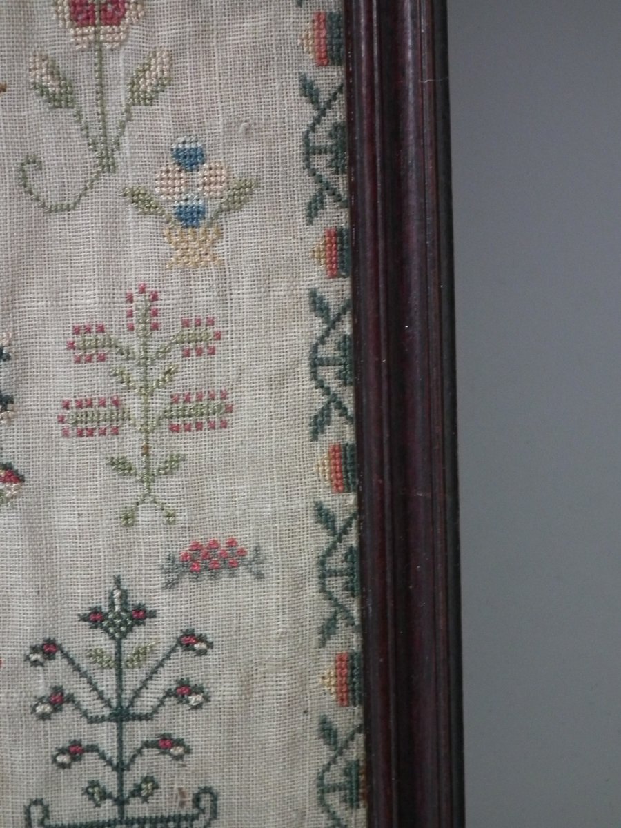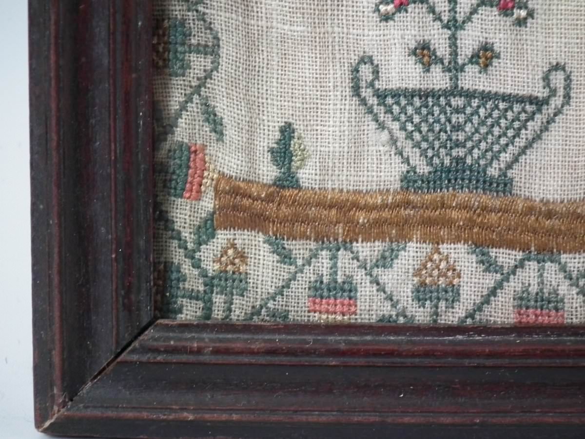 George III, dated 1777. 13.25ins high by 11.5ins wide. Antique Sampler, 1777, By LI. The sampler is worked in silk on linen ground, in a variety of stitches.