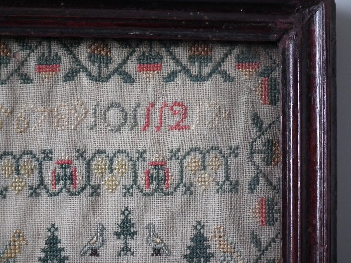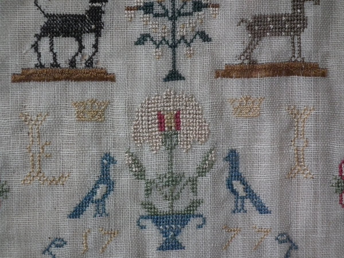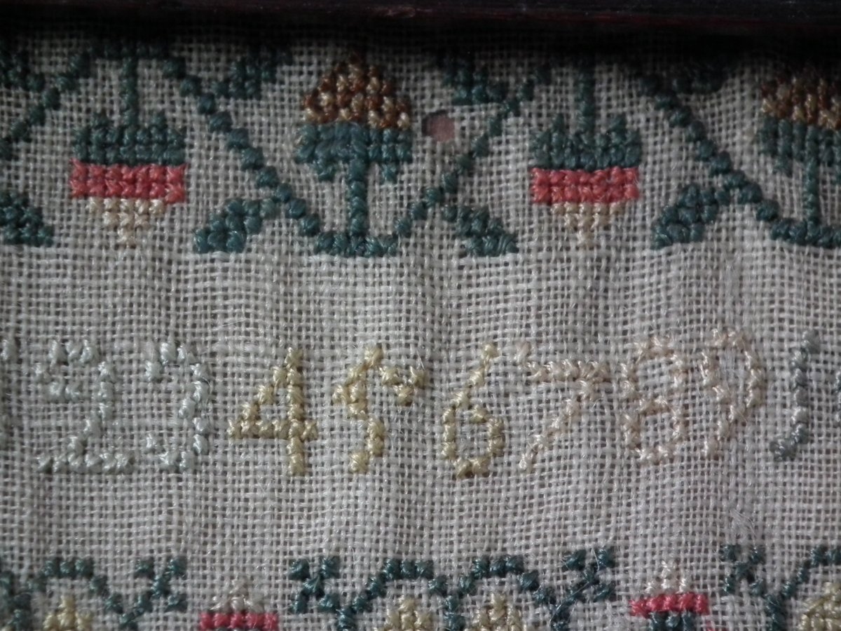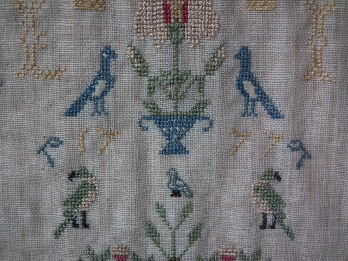 George III, dated 1777. 13.25ins high by 11.5ins wide. Antique Sampler, 1777, By LI. The sampler is worked in silk on linen ground, in a variety of stitches.