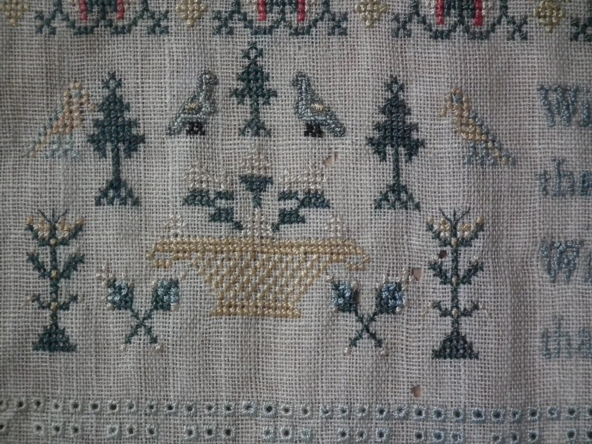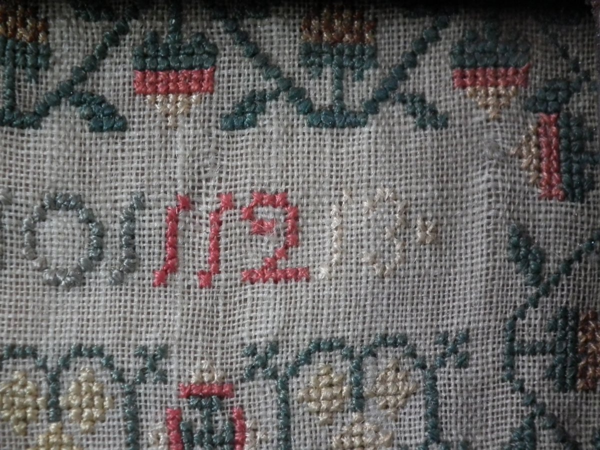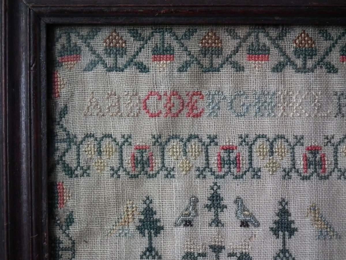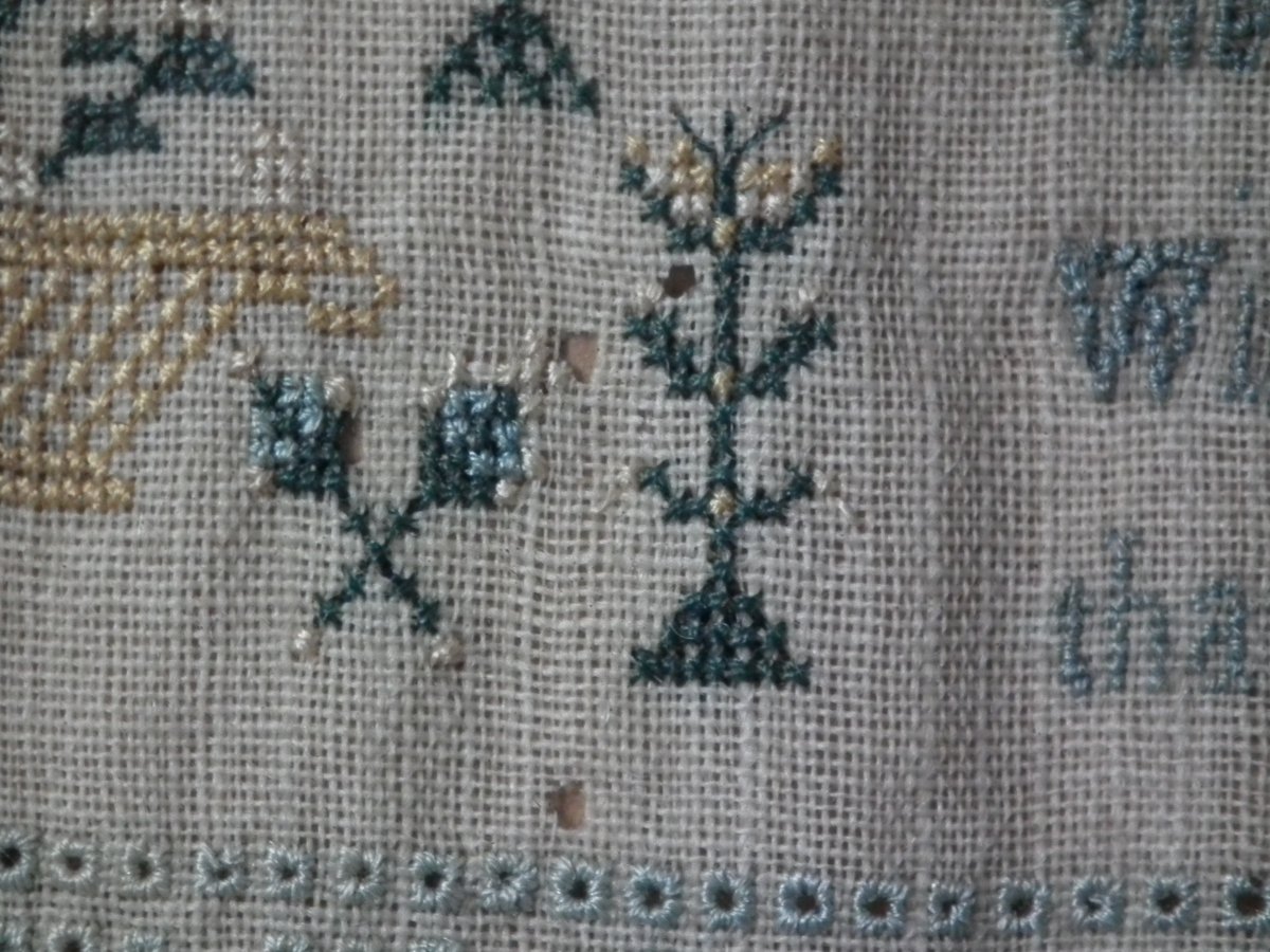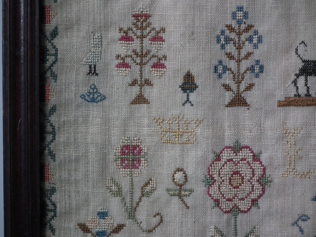 George III, dated 1777. 13.25ins high by 11.5ins wide. Antique Sampler, 1777, By LI. The sampler is worked in silk on linen ground, in a variety of stitches.