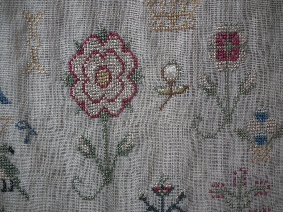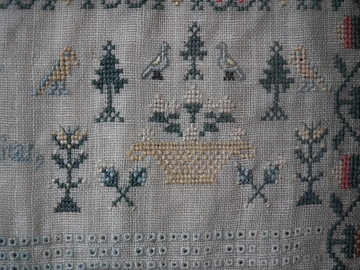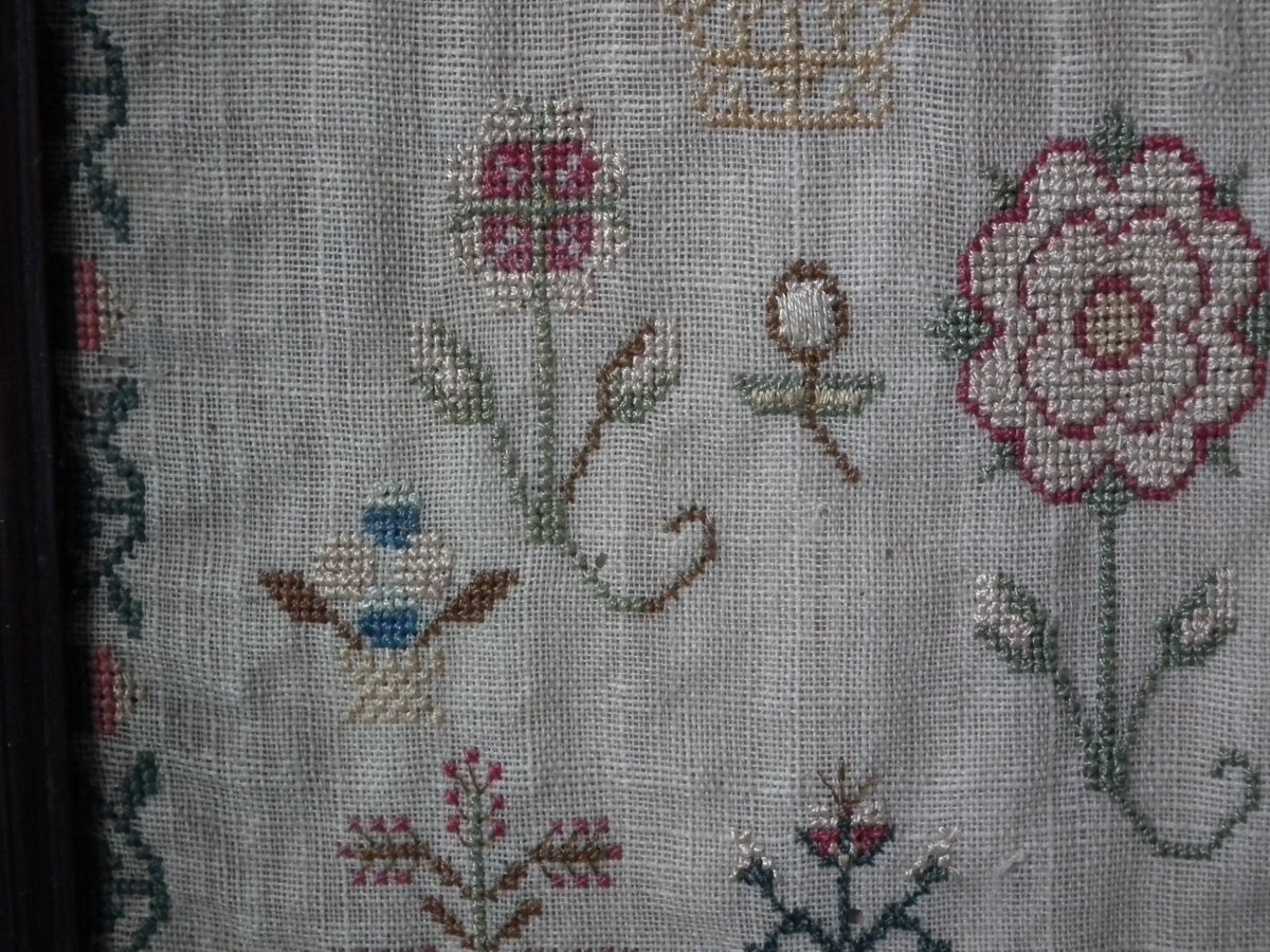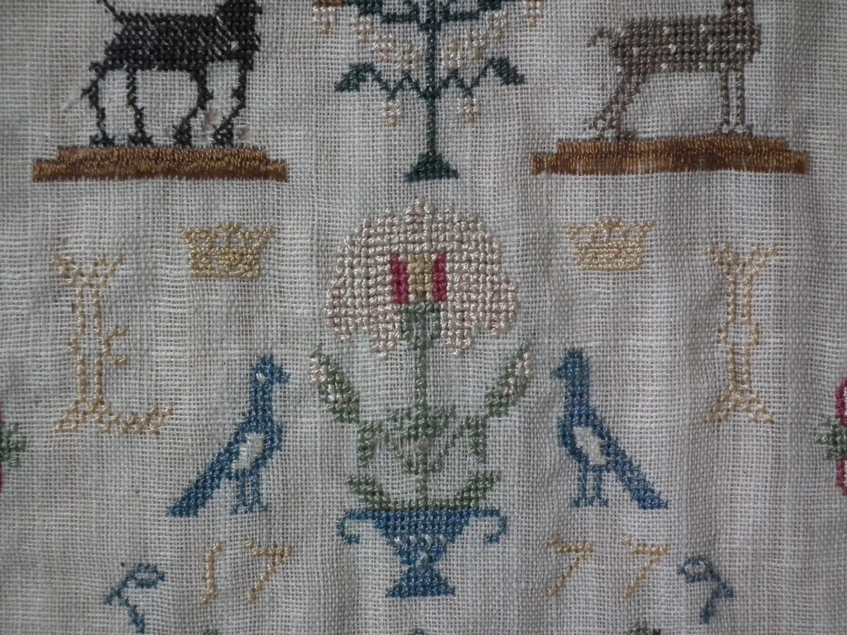 George III, dated 1777. 13.25ins high by 11.5ins wide. Antique Sampler, 1777, By LI. The sampler is worked in silk on linen ground, in a variety of stitches.