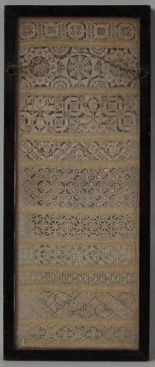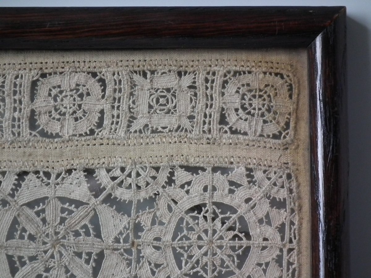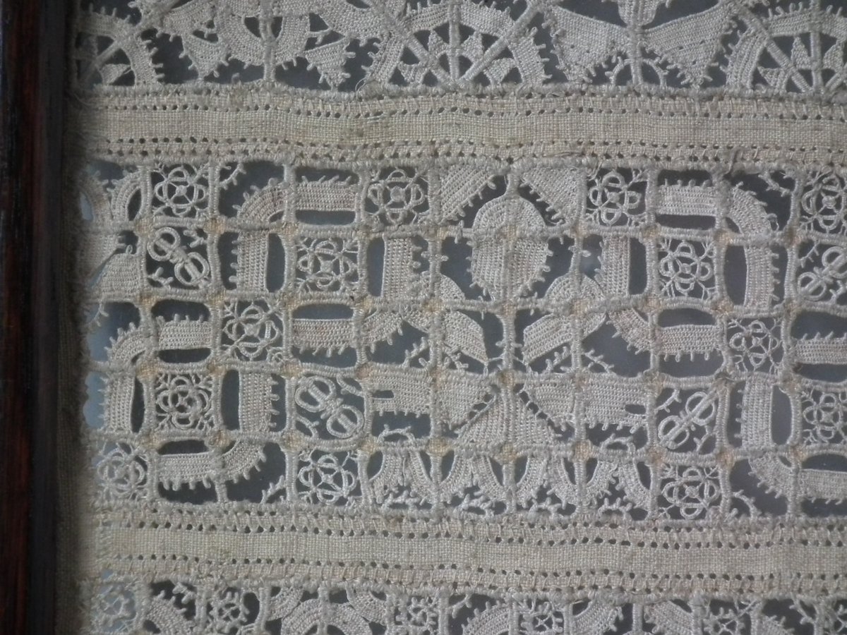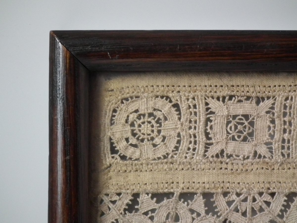 Circa 1650. 15.25 by 5.75 ins wide. Circa 1650 Whitework sampler. Framed in an old wood frame with rippled, old glass to the front and reverse - the sampler can be viewed from both sides.