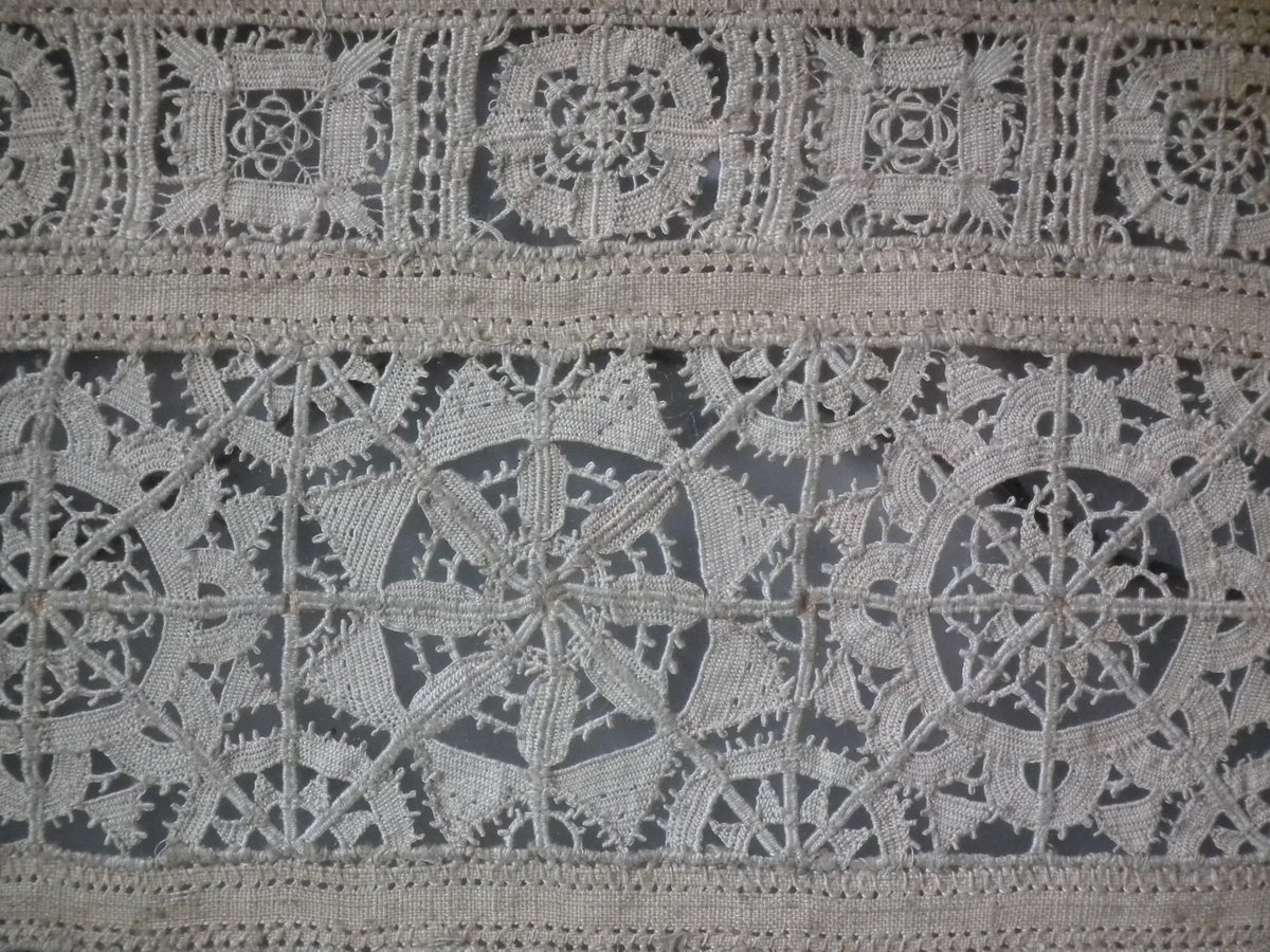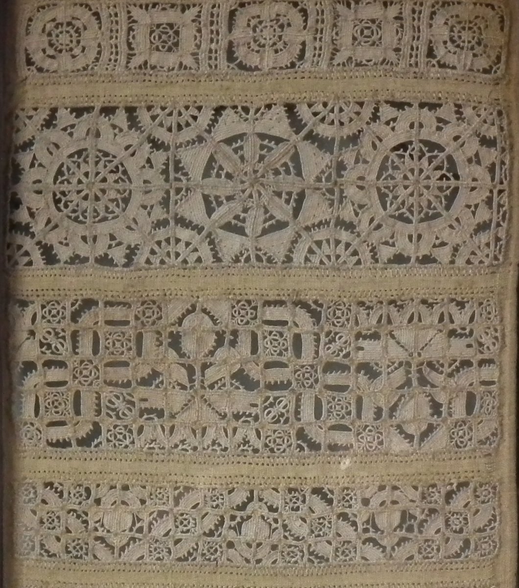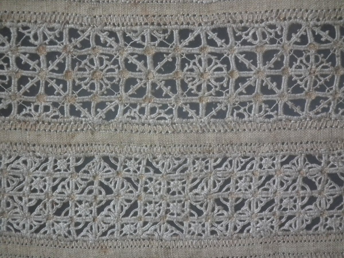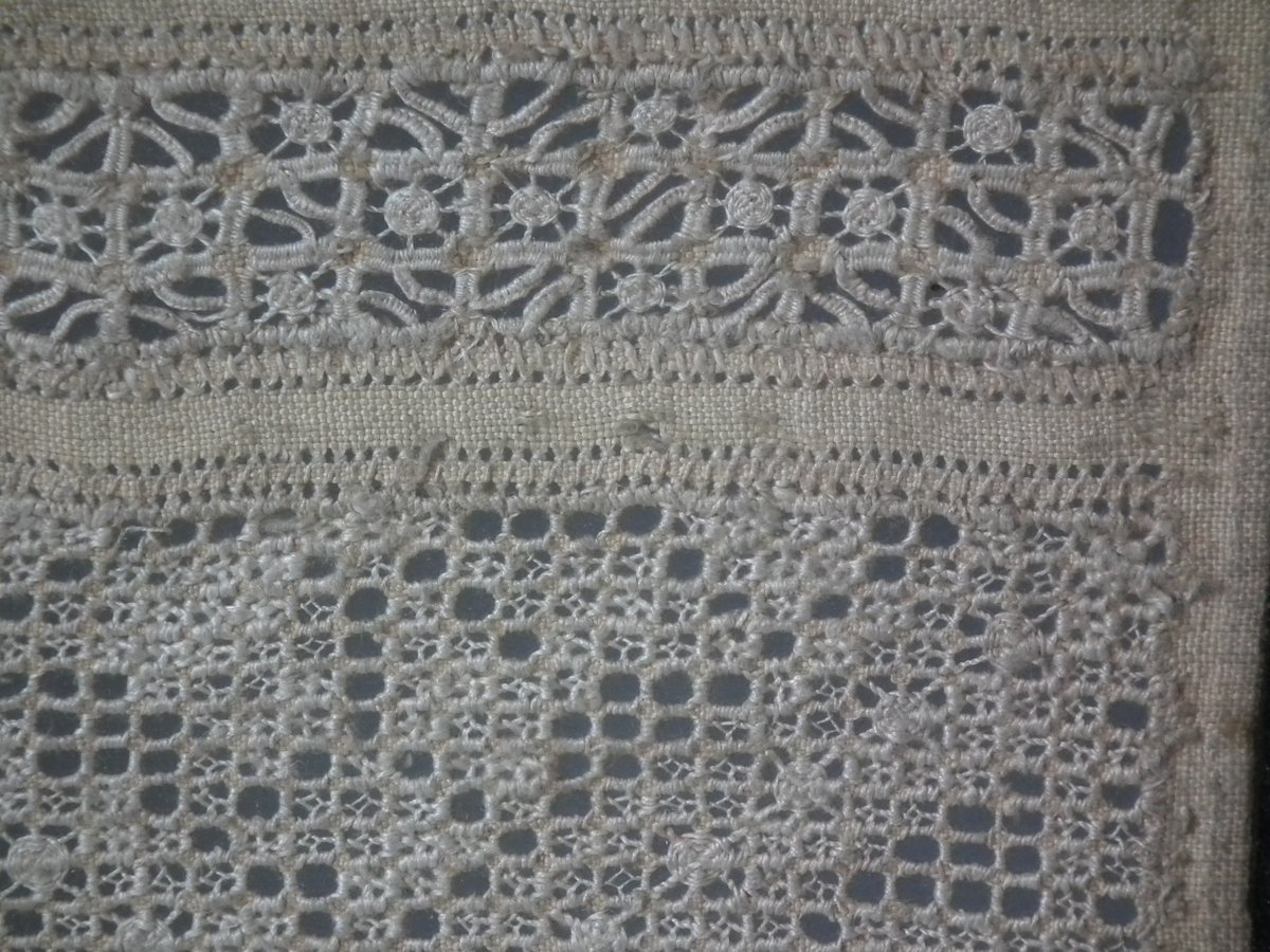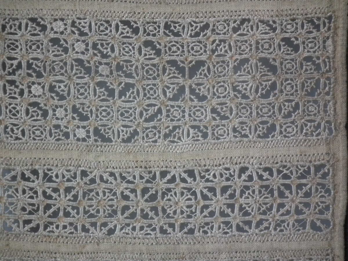 Worked in silk thread, with a variety of stitches and whitework techniques - cut and drawn work for example. Floral and geometric panels and bands.