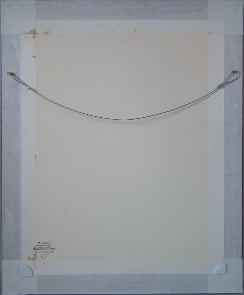 Neatly and evenly stretched. Frame in good condition, ready to hang.