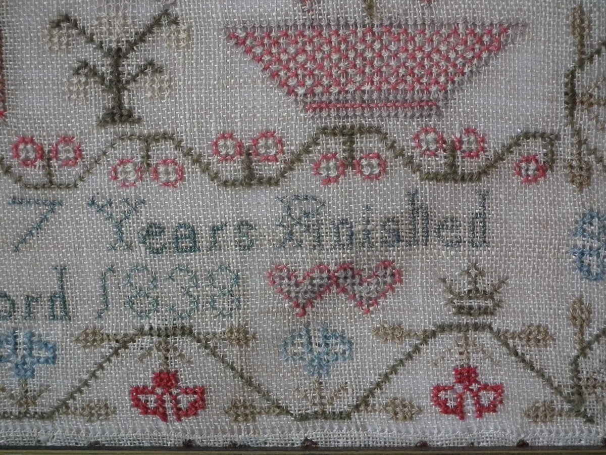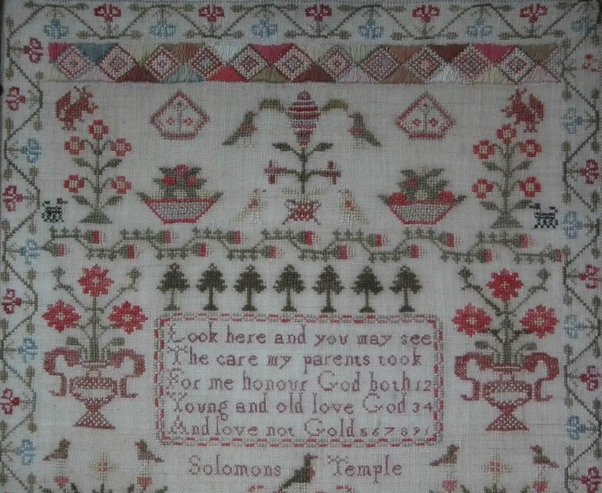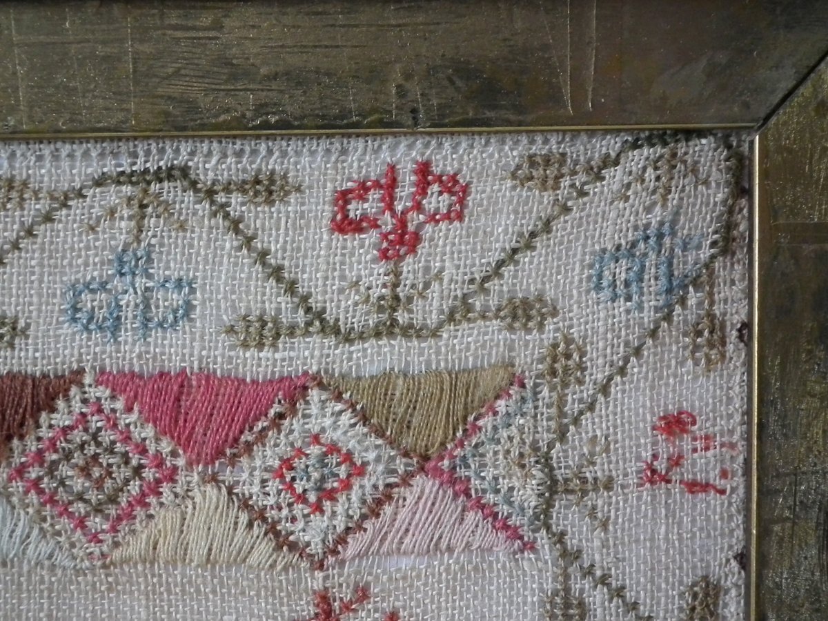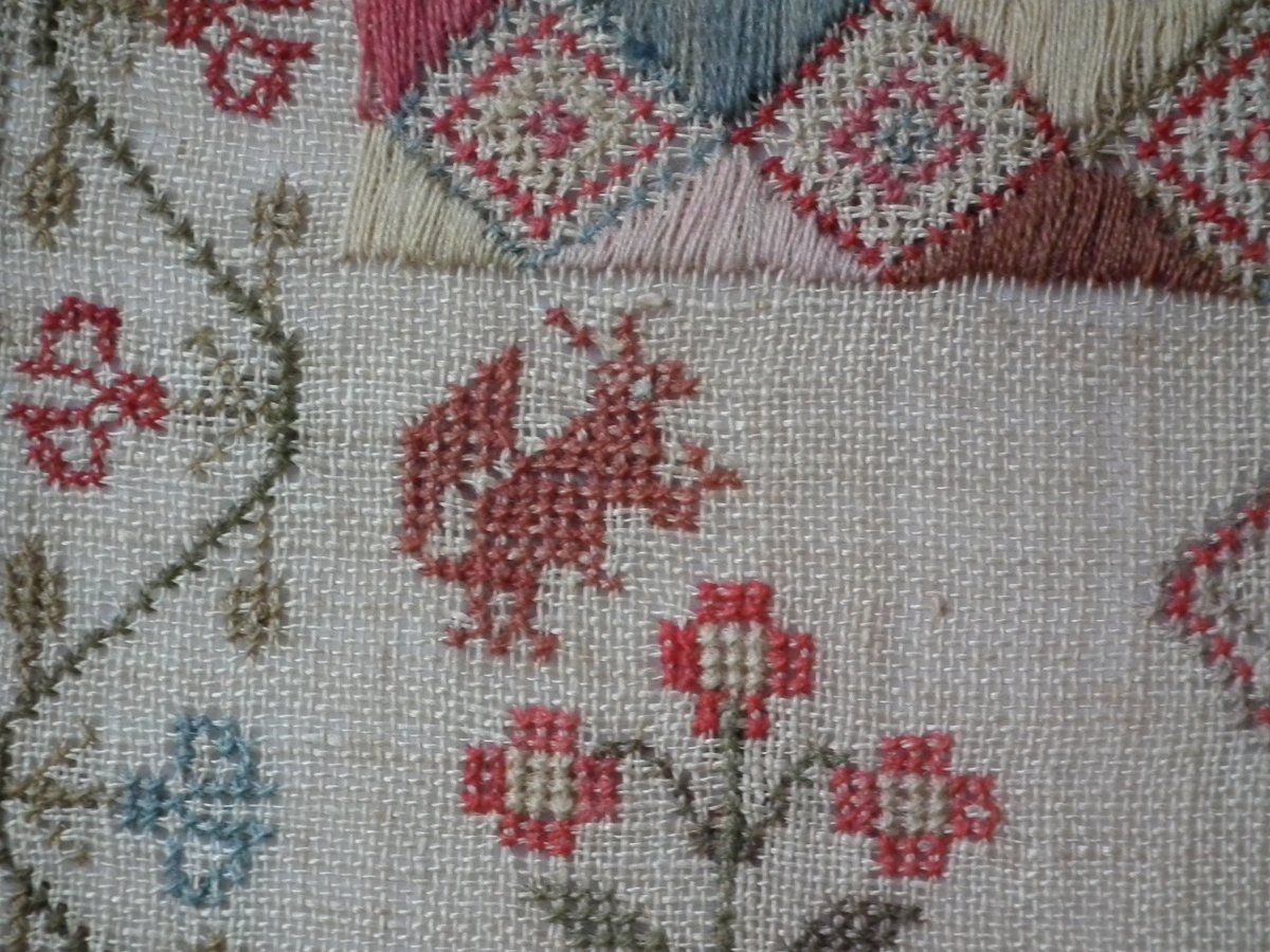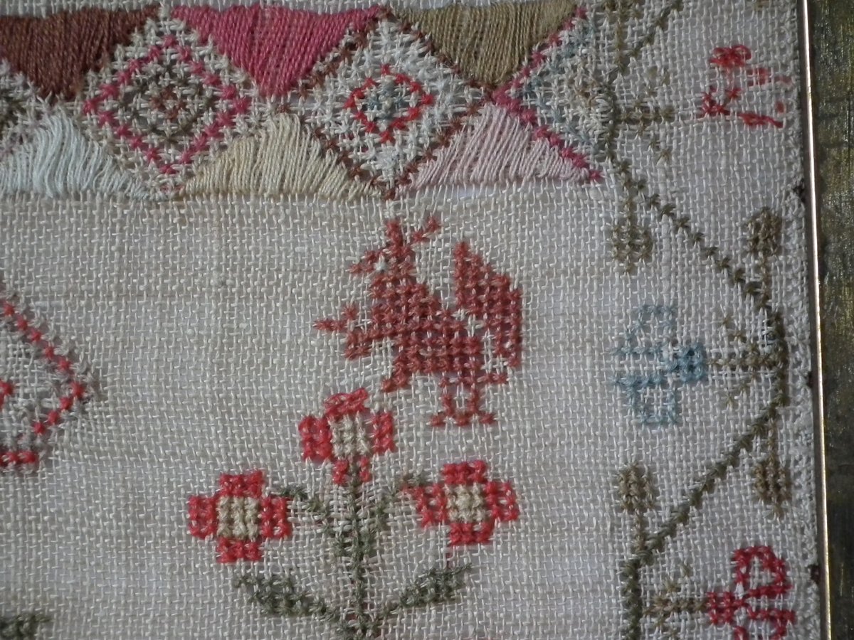 The sampler is worked in wool and silk on linen ground, in a variety of stitches.