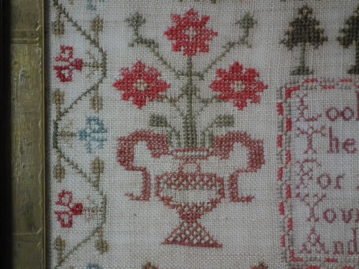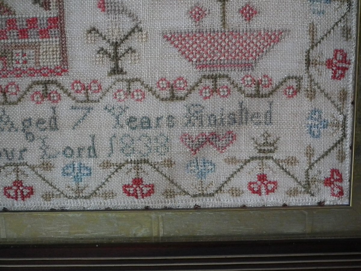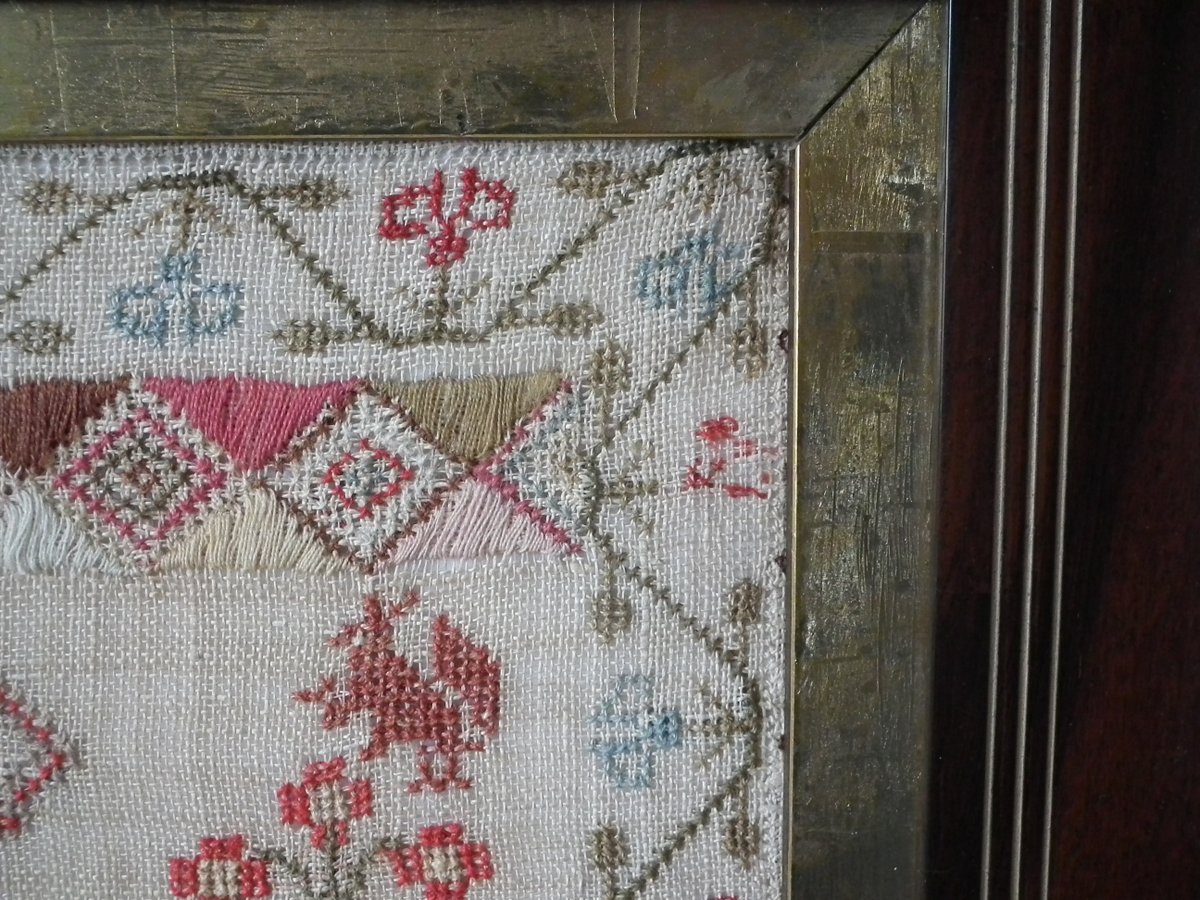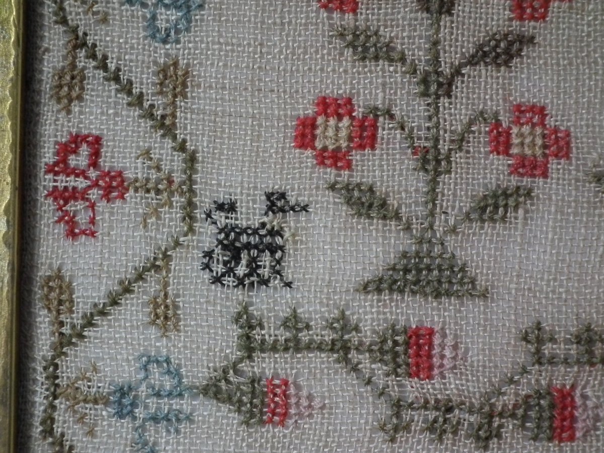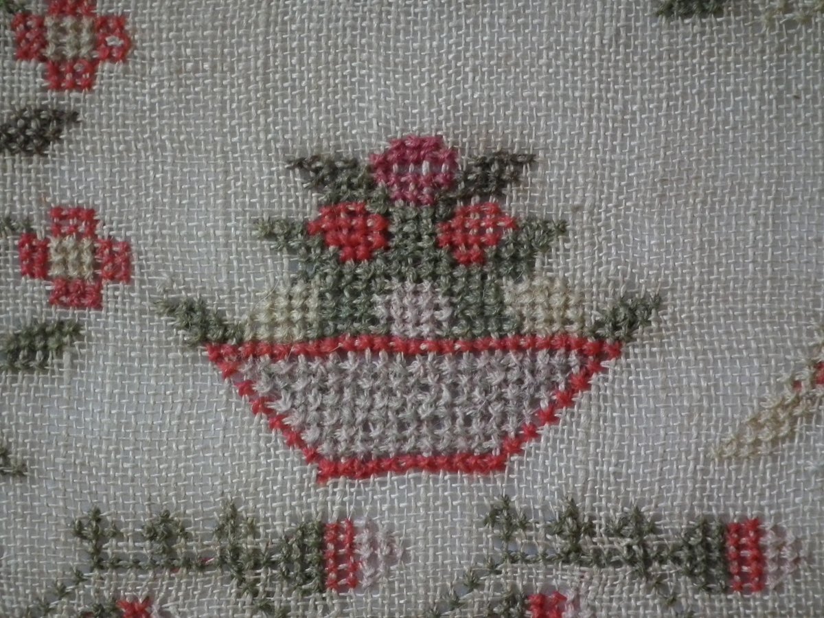 The sampler is worked in wool and silk on linen ground, in a variety of stitches.