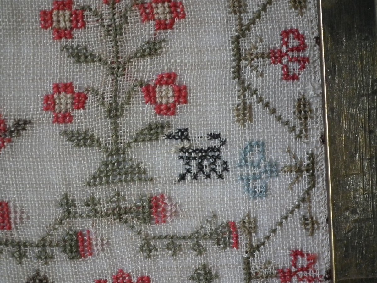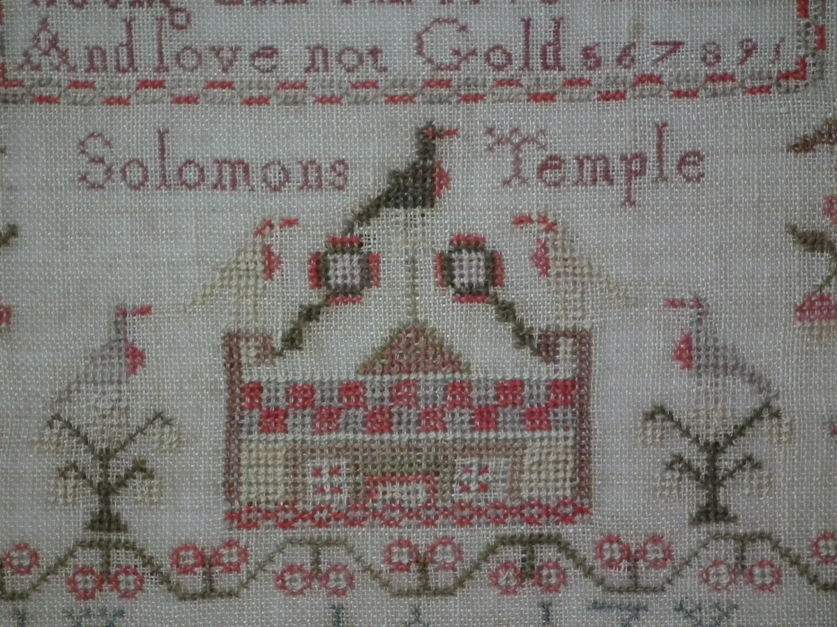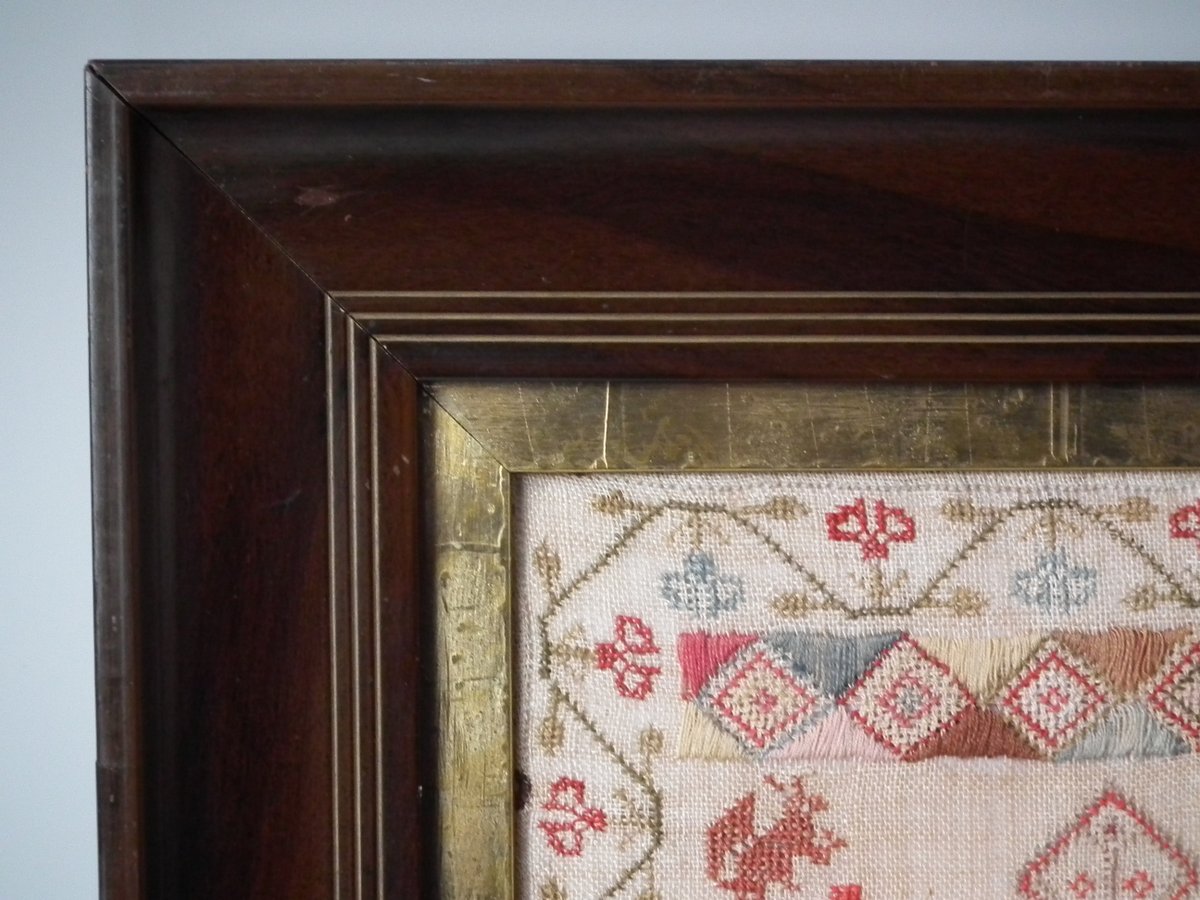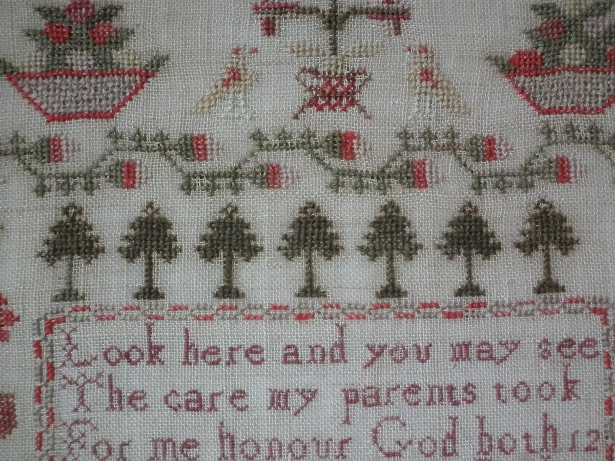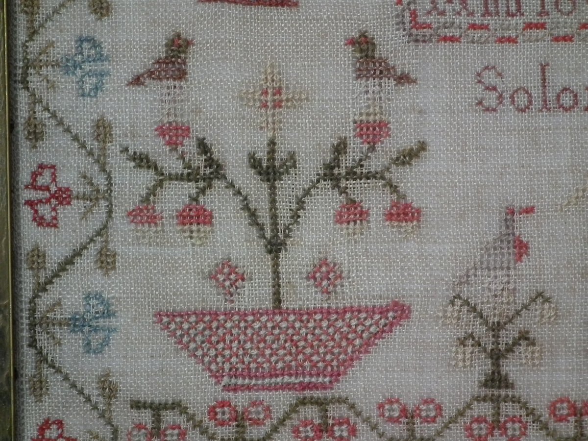 The sampler is worked in wool and silk on linen ground, in a variety of stitches.