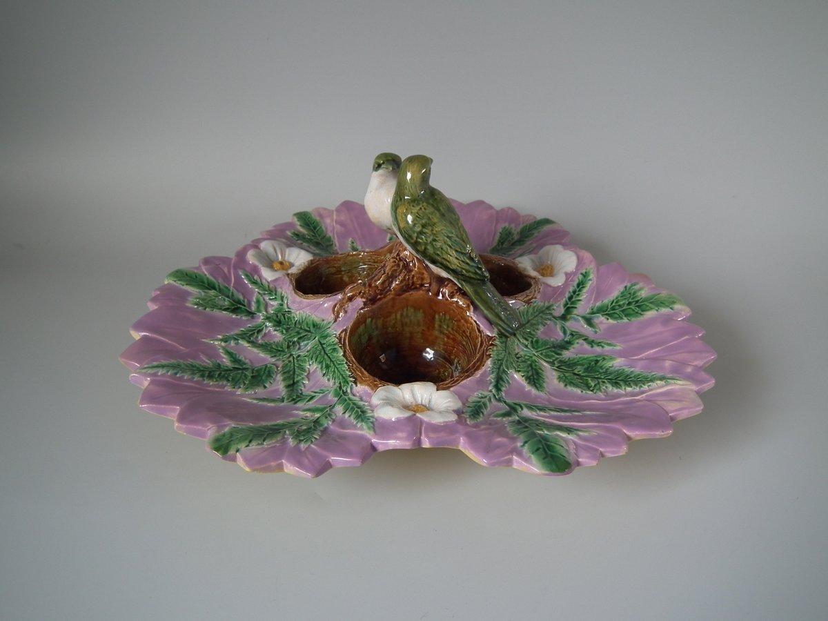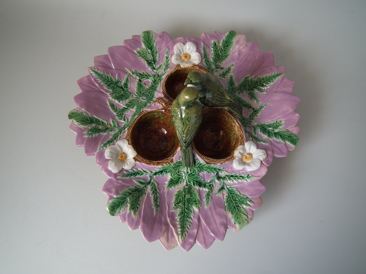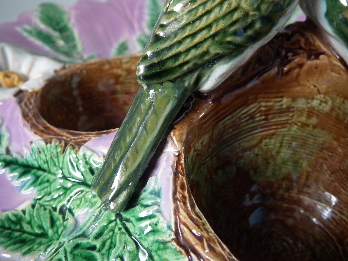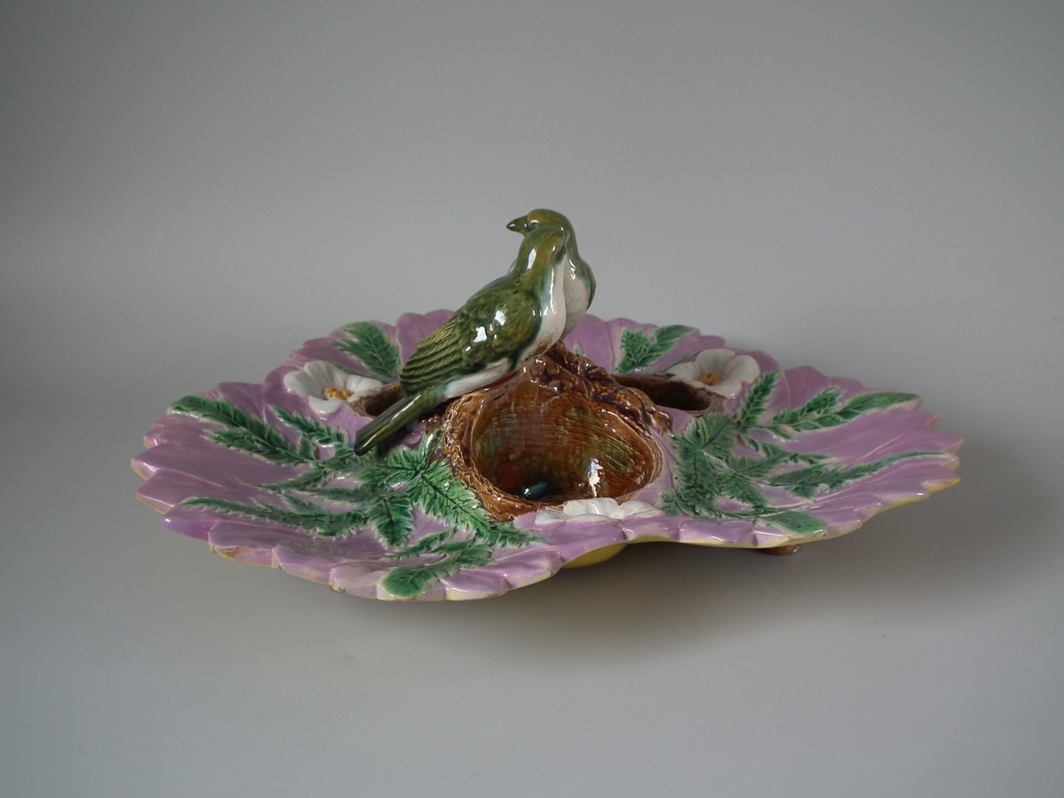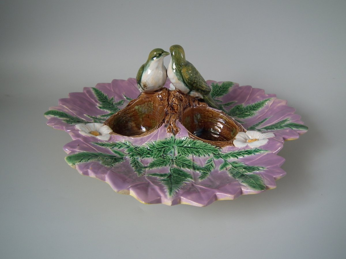 Victorian, circa 1880. 5.1ins high, 12.2ins wide, 12.2ins depth. Unidentified English Majolica strawberry server which features two birds perched on a trio of nests.