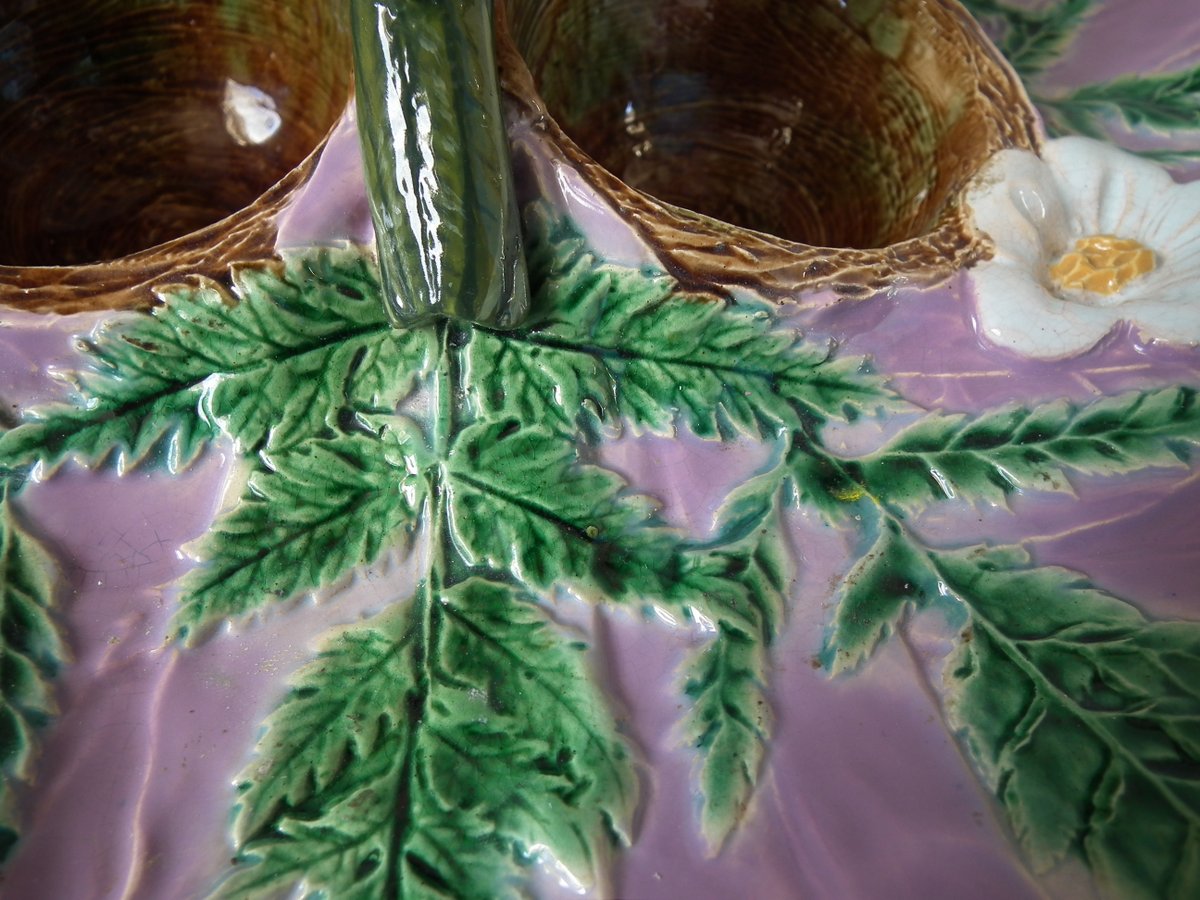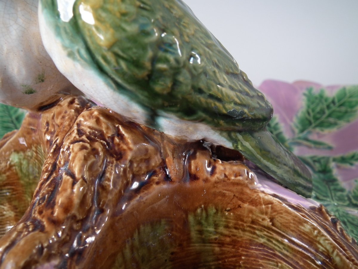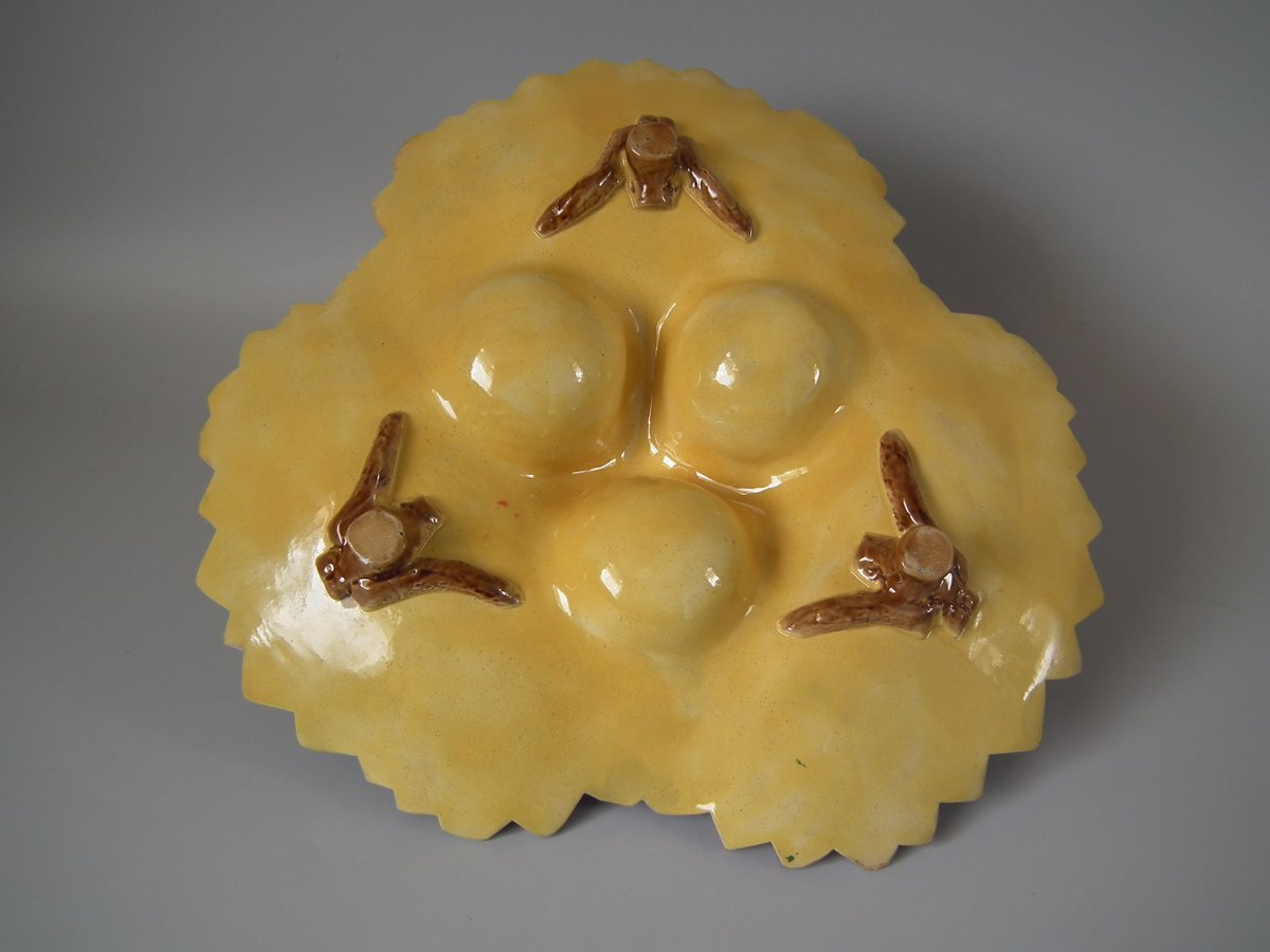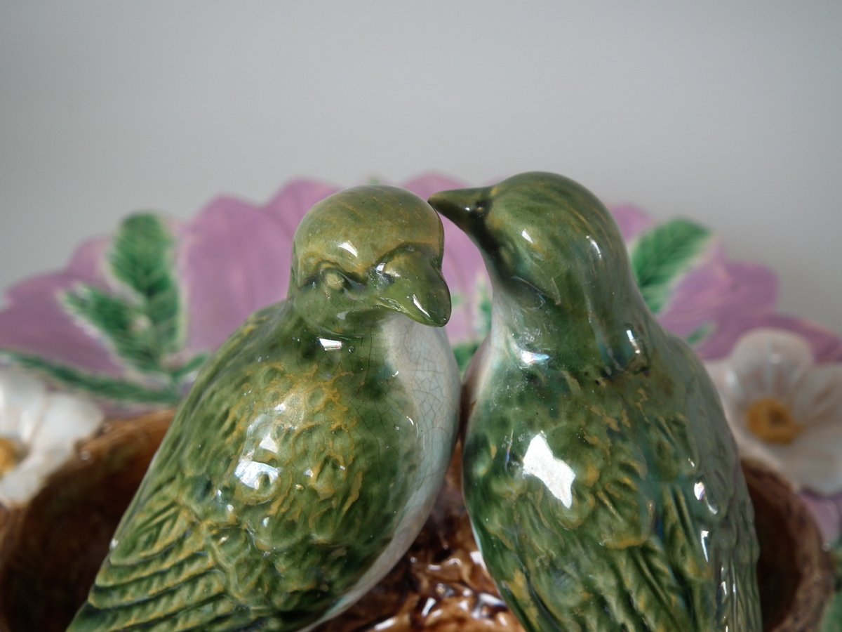 Victorian, circa 1880. 5.1ins high, 12.2ins wide, 12.2ins depth. Unidentified English Majolica strawberry server which features two birds perched on a trio of nests.