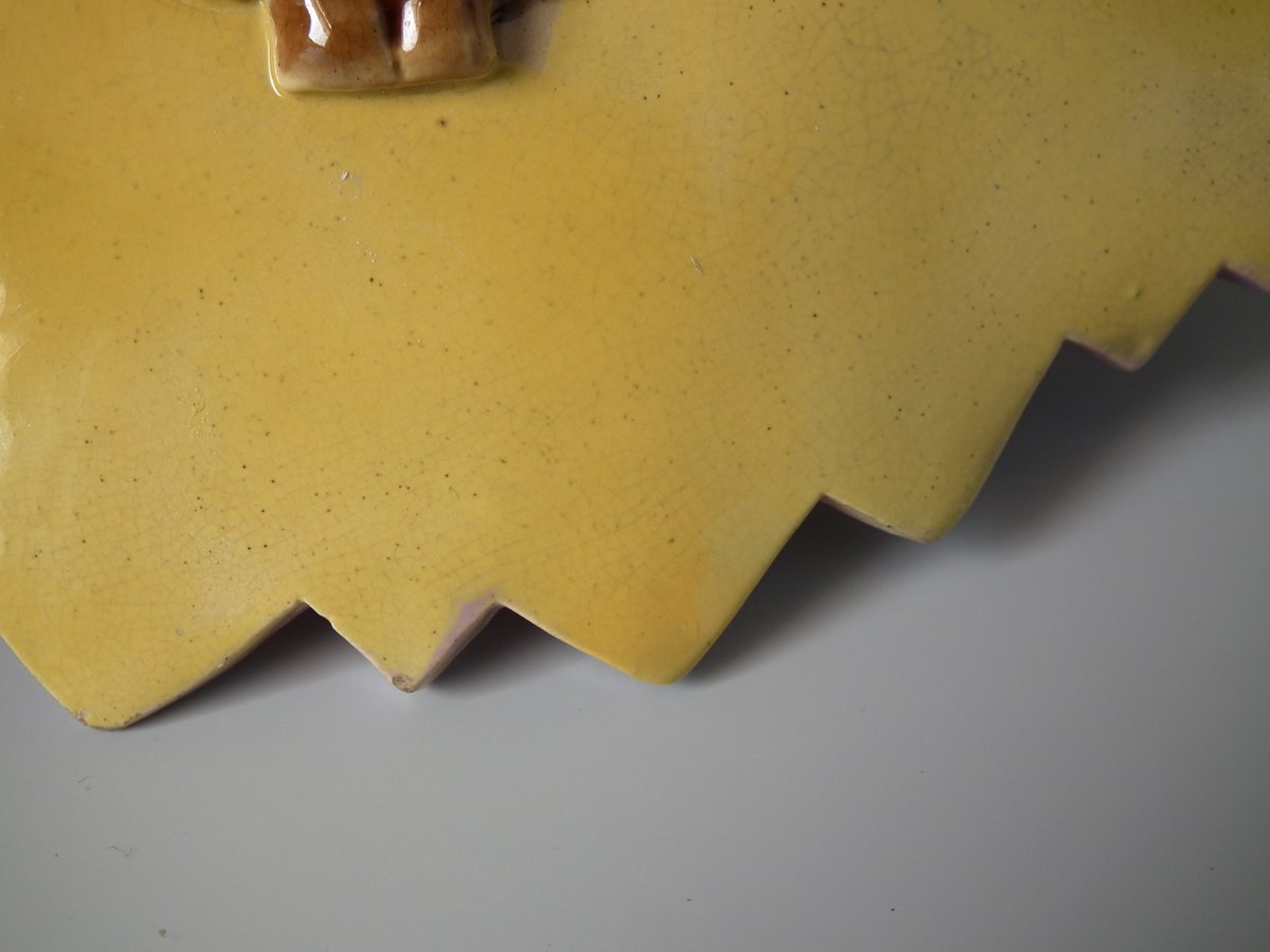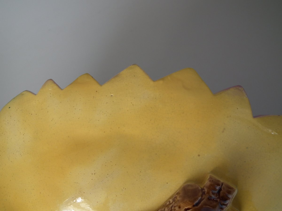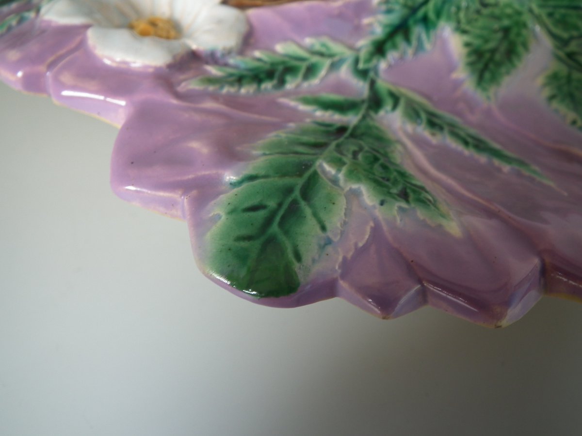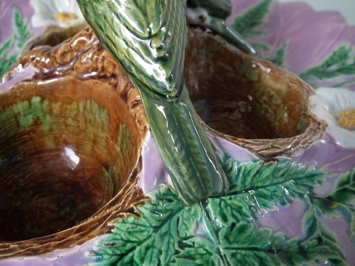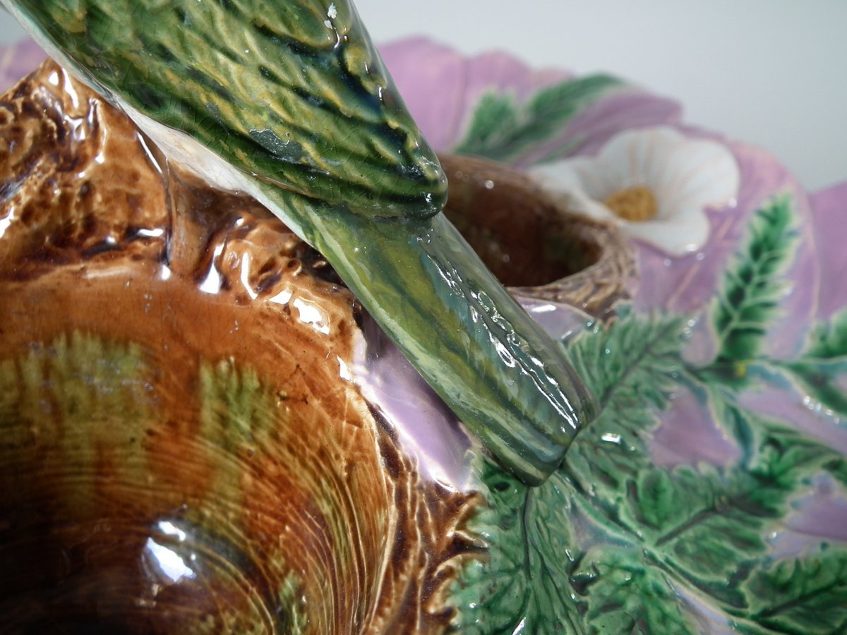 Victorian, circa 1880. 5.1ins high, 12.2ins wide, 12.2ins depth. Unidentified English Majolica strawberry server which features two birds perched on a trio of nests.