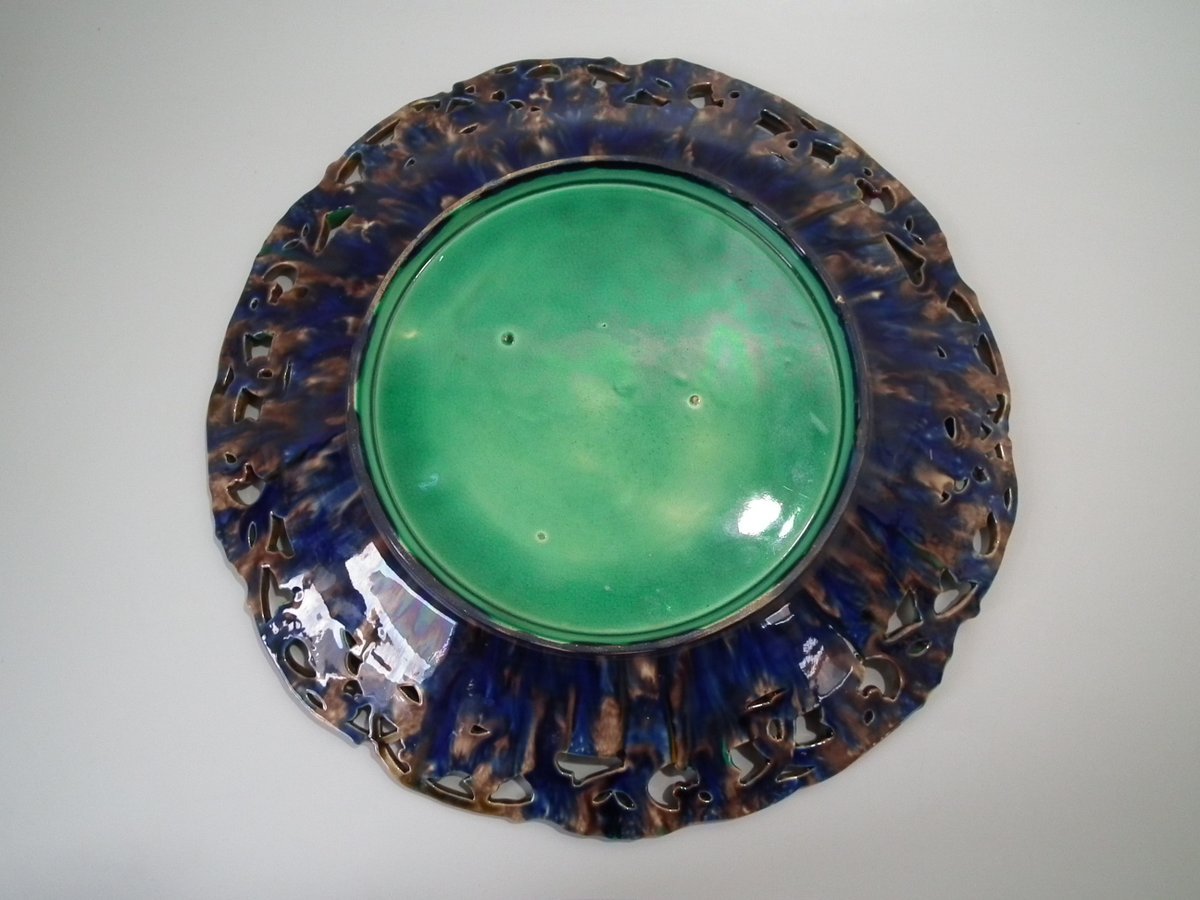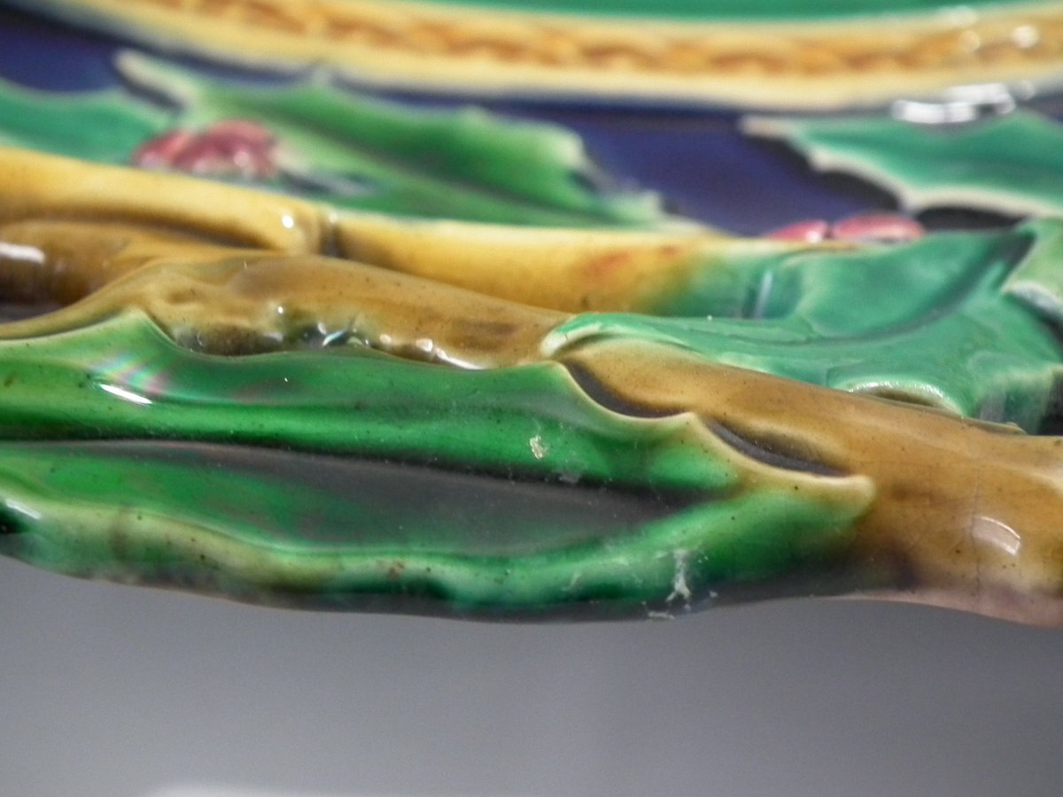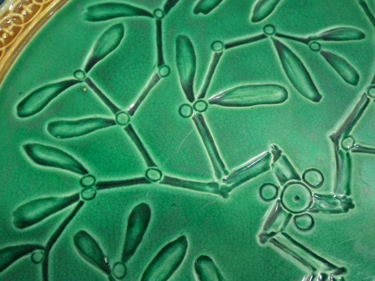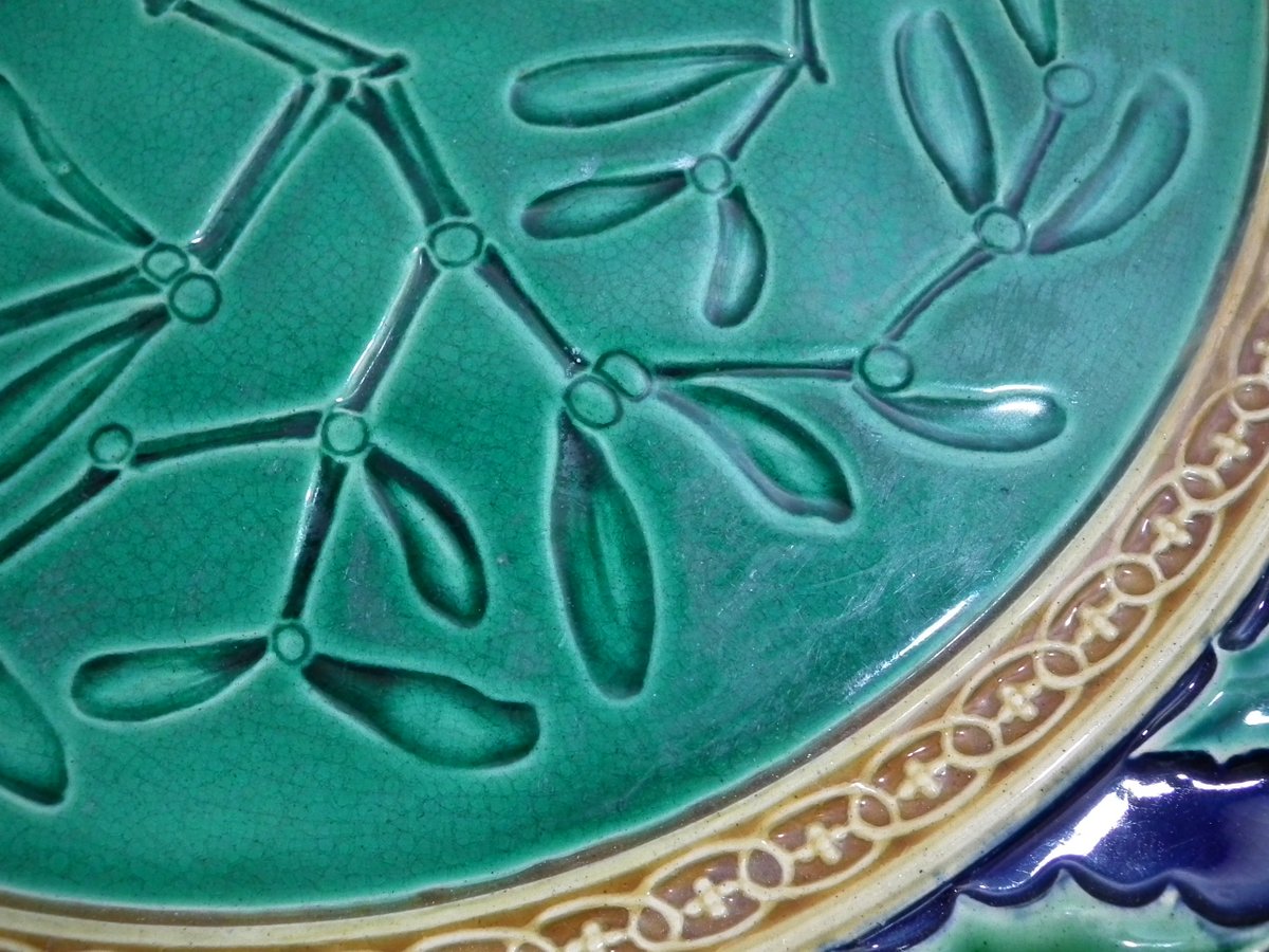 Victorian, circa 1870. 15.1ins high, 15.1ins wide, 1.9ins depth. Minton Majolica platter which features a reticulated border of holly. Mistletoe intaglio effect to the centre.