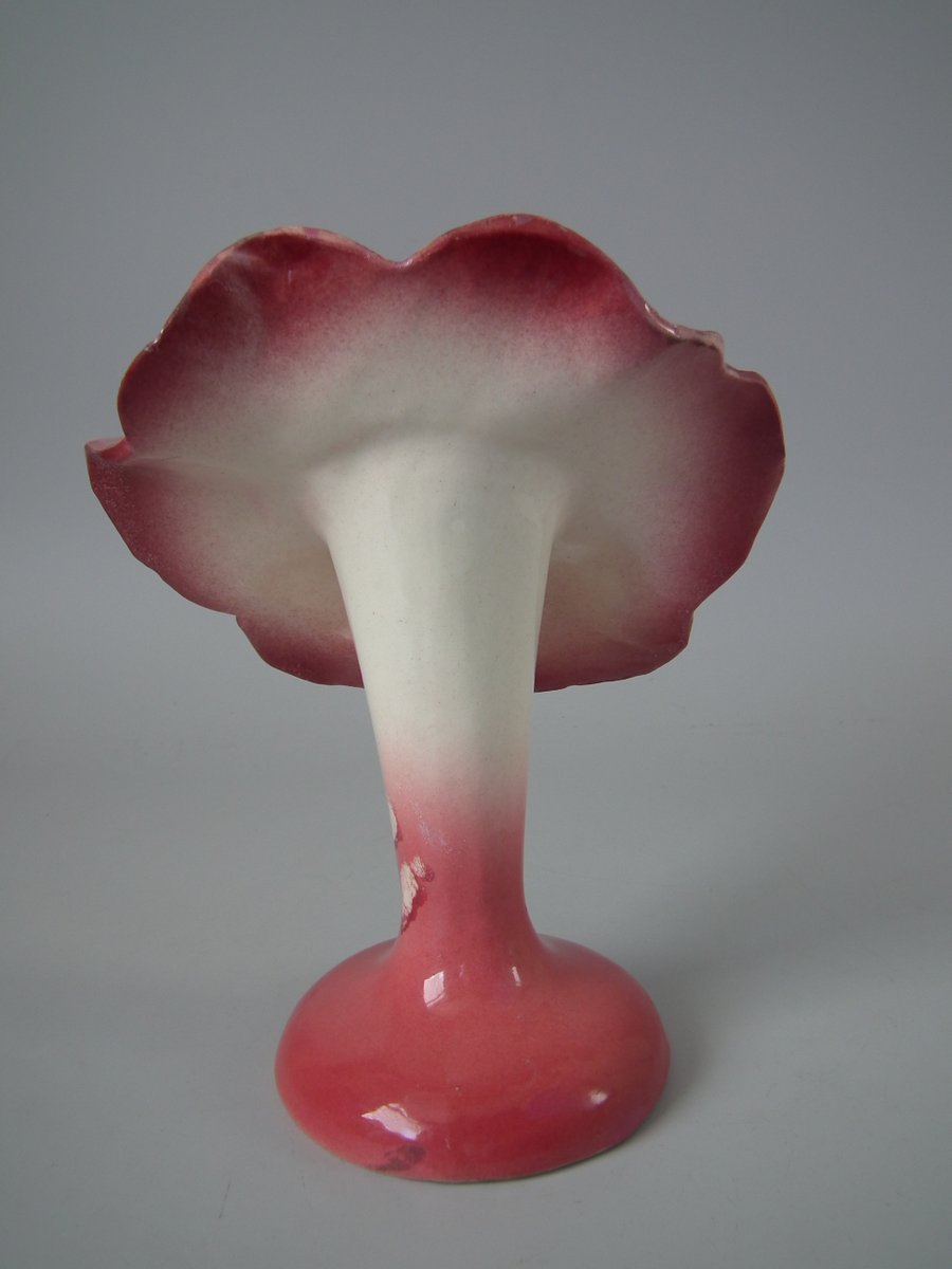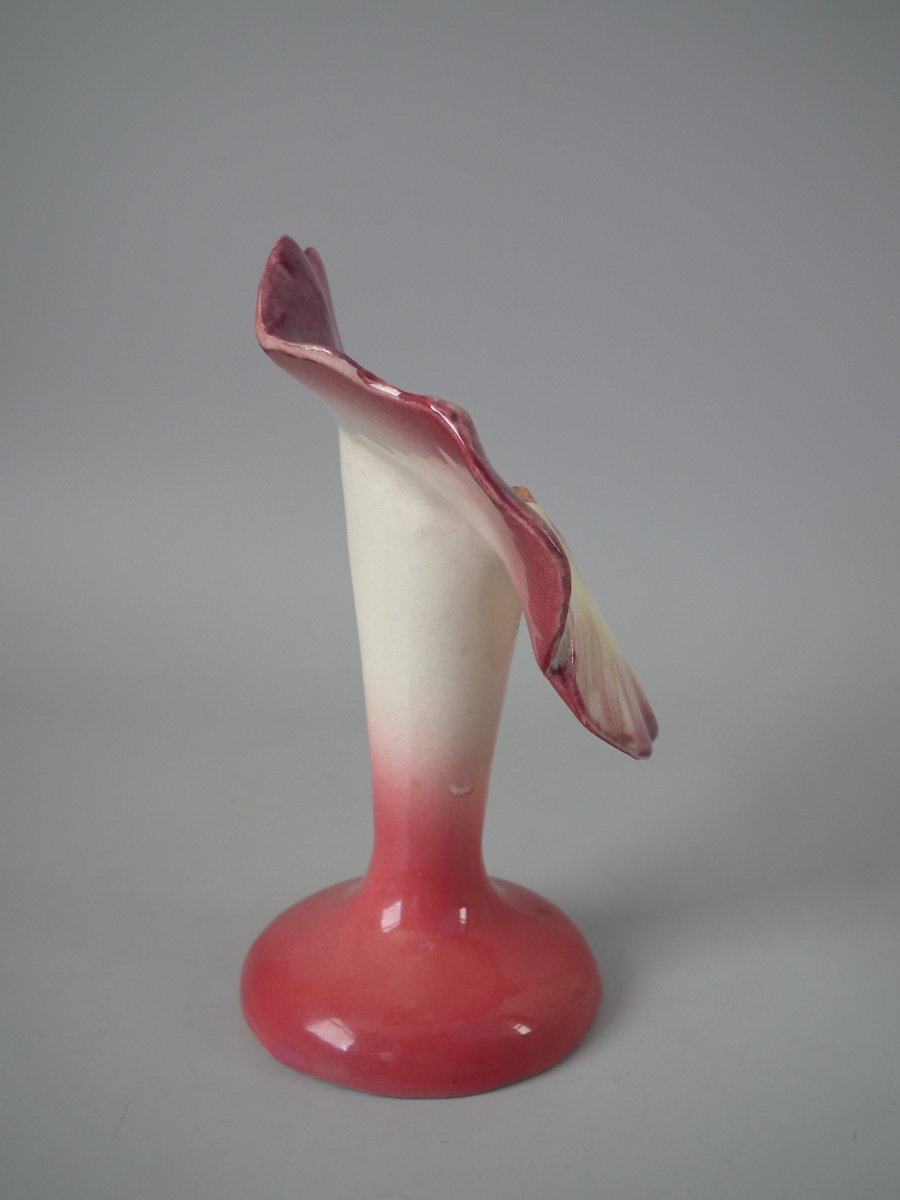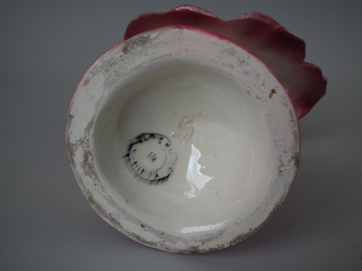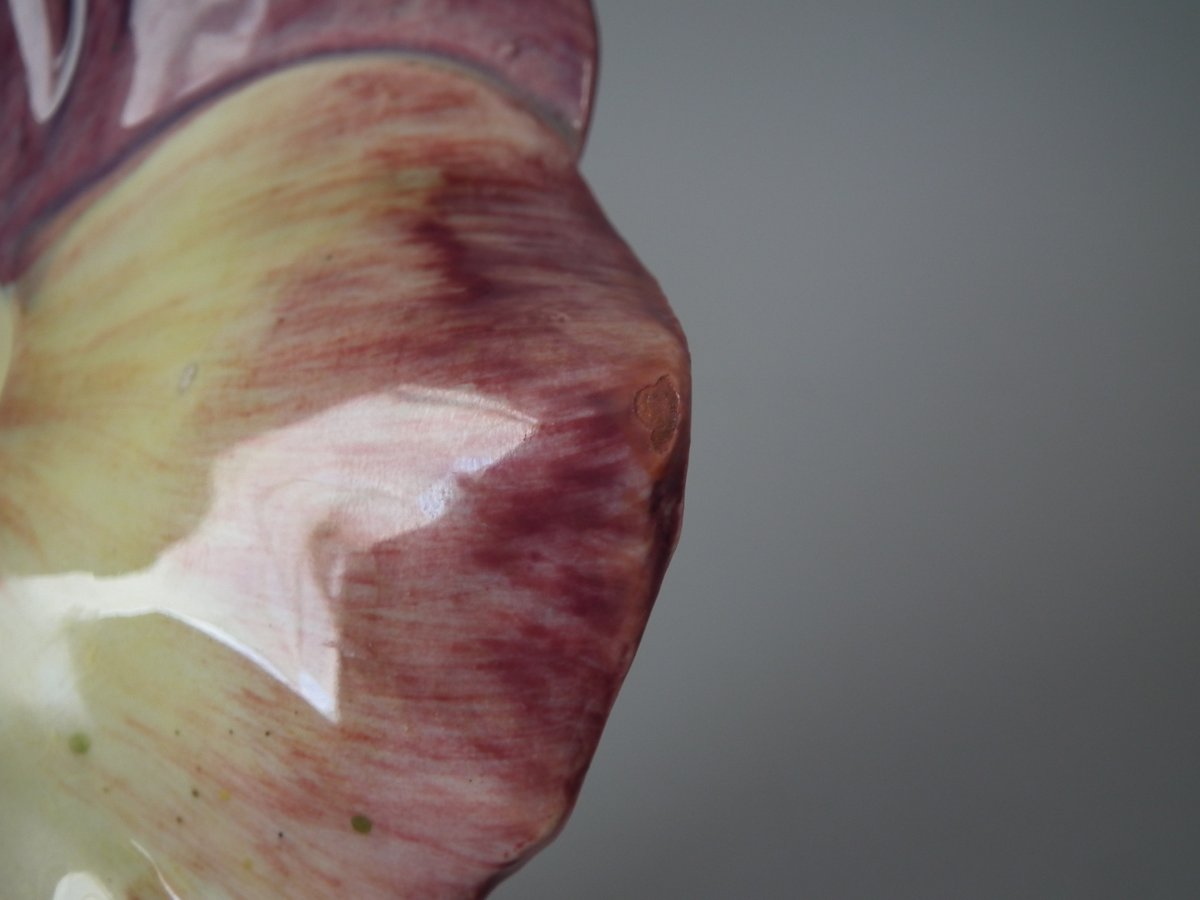 Circa 1900. 7.9ins high, 6.5ins wide, 3.9ins depth. Delphin Massier Majolica posy holder which features a flower (pansy) with the center hollowed out to form the vase. Colouration: pink, purple, cream, are predominant.