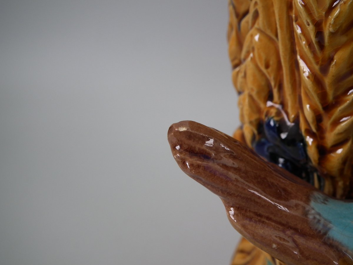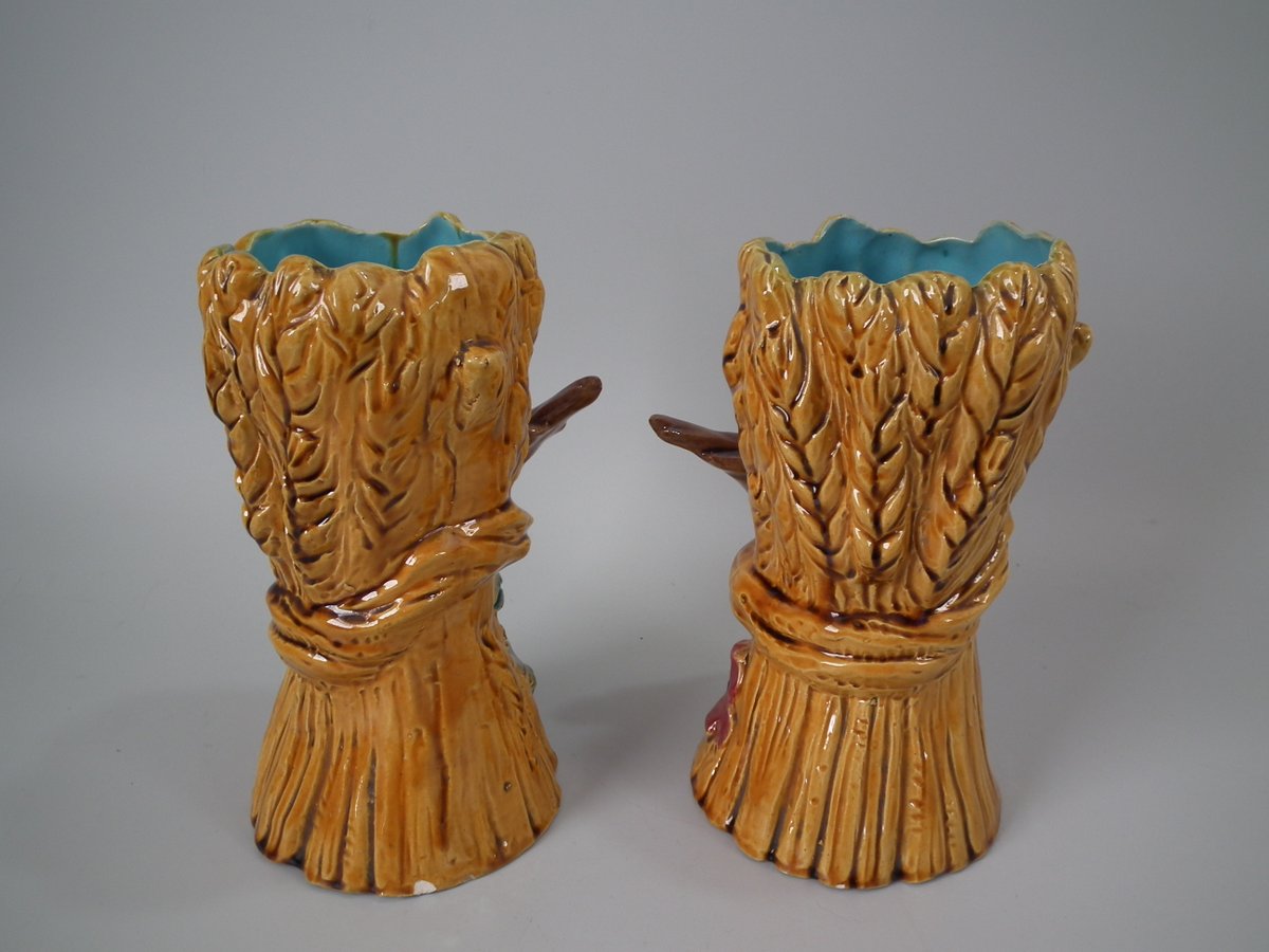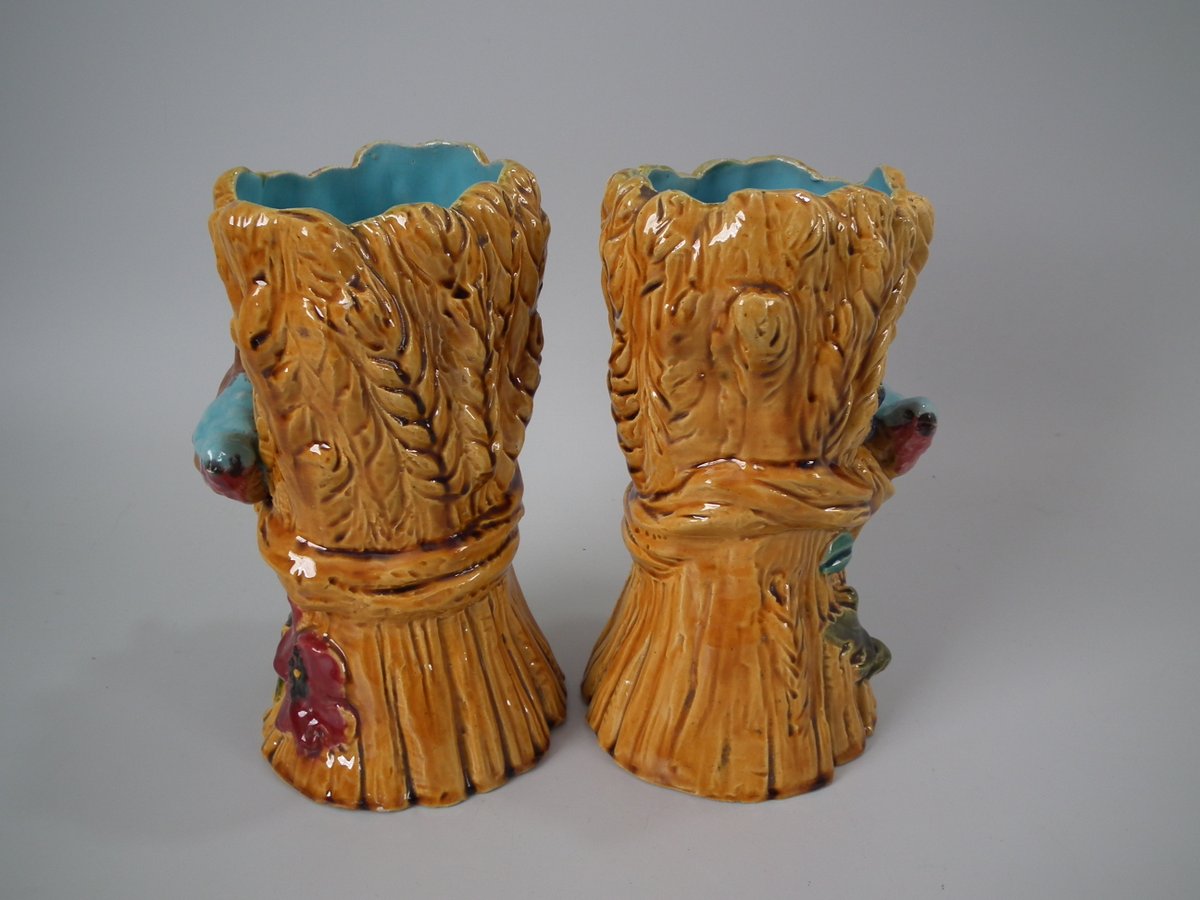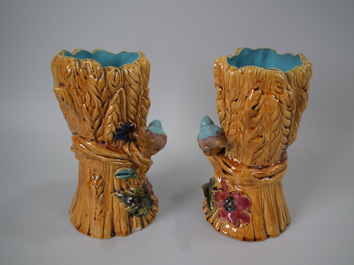 Victorian, circa 1880. Tallest is 8.3ins high, 4.7ins wide, 4.7ins depth. Pair of Majolica vases which feature a bird, perched on a wheatsheaf, with flowers.