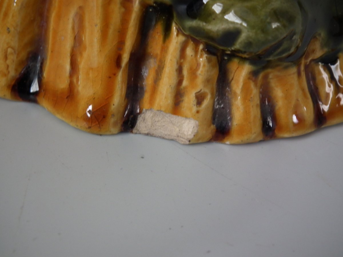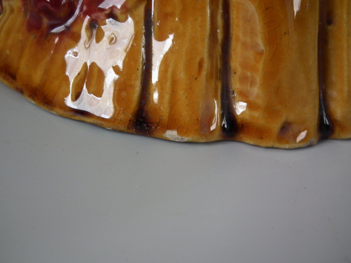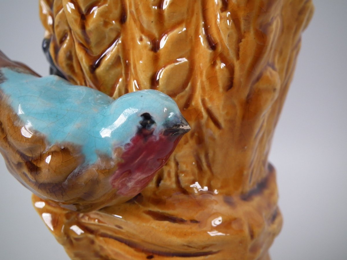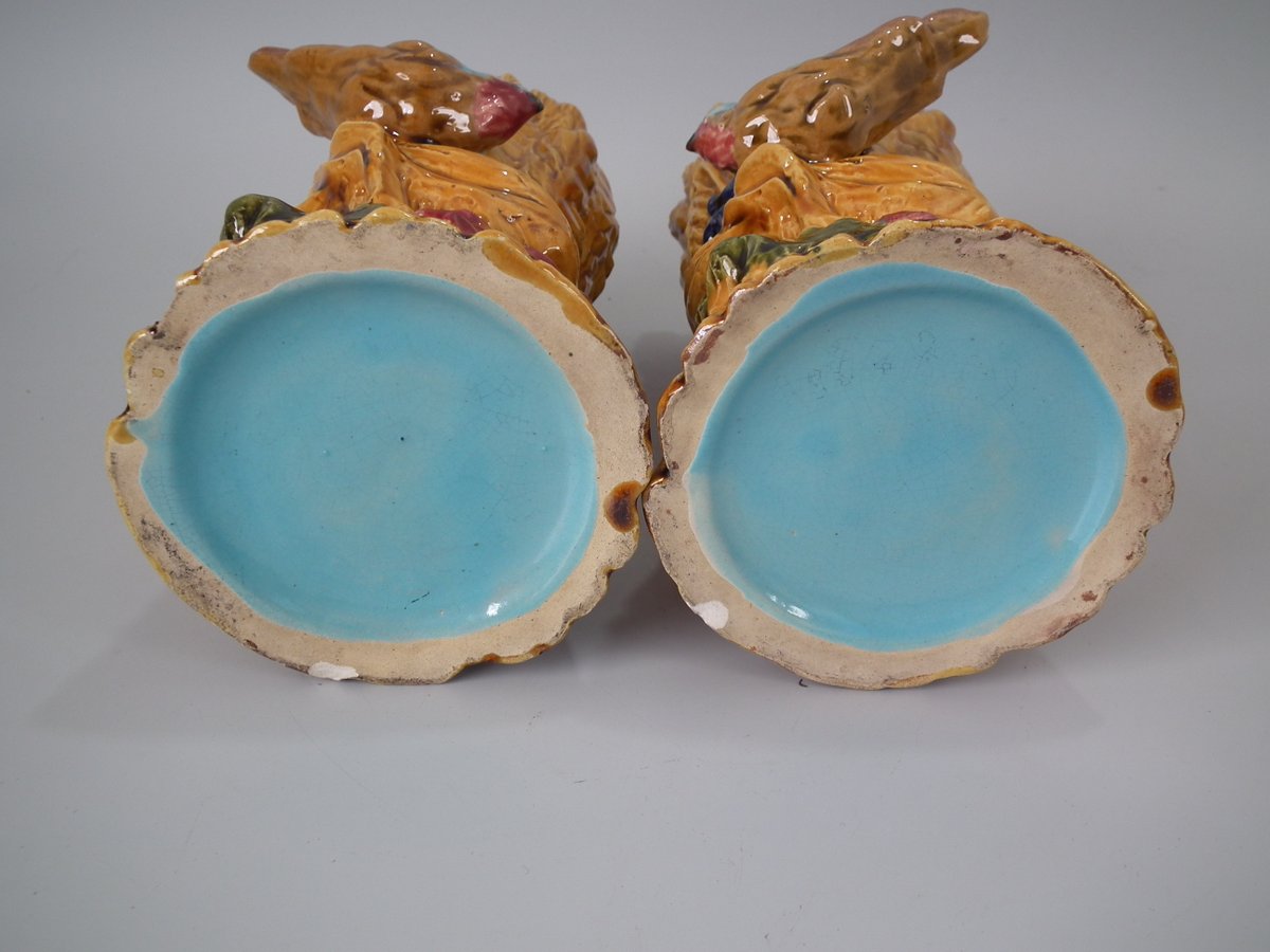 Victorian, circa 1880. Tallest is 8.3ins high, 4.7ins wide, 4.7ins depth. Pair of Majolica vases which feature a bird, perched on a wheatsheaf, with flowers.