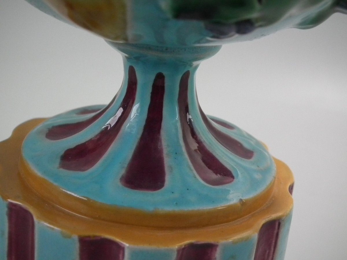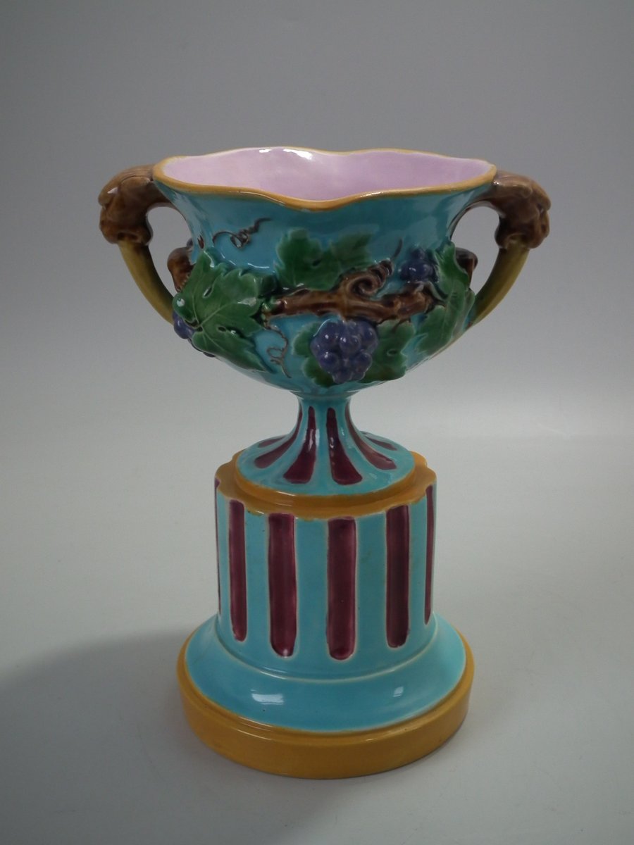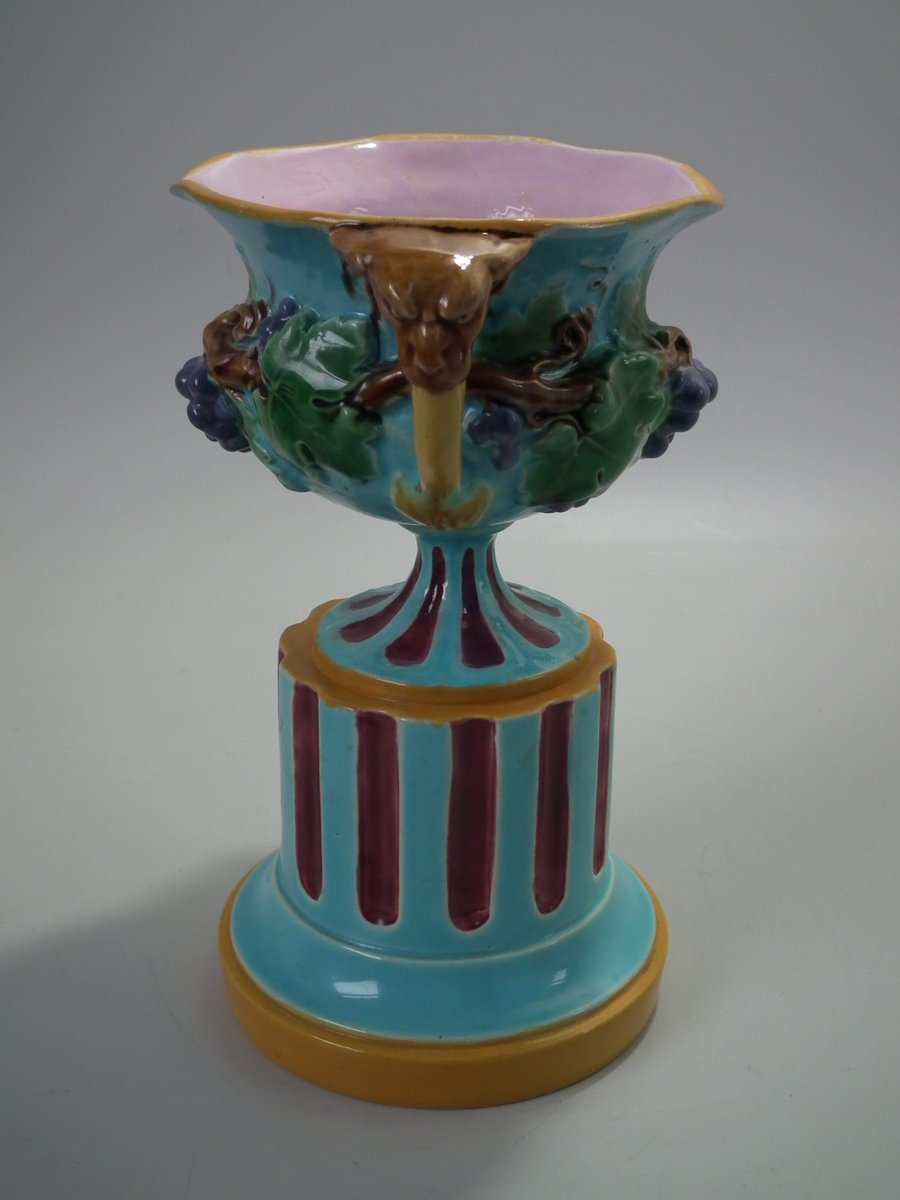Victorian, circa 1872. 8.5ins high, 6.3ins wide, 4.9ins depth. Minton Majolica vase which features grapes and vine leaves, two lion head handles and a (fixed) pedestal base.