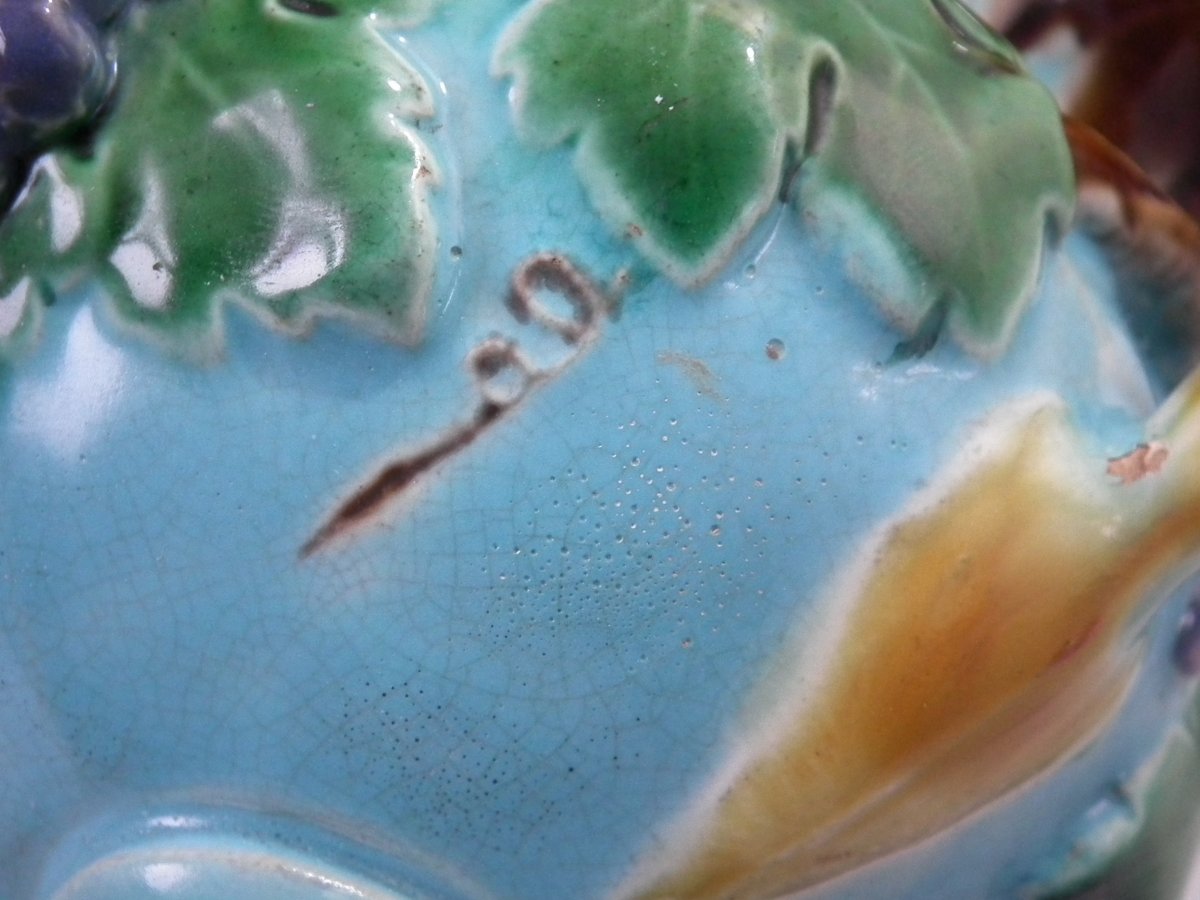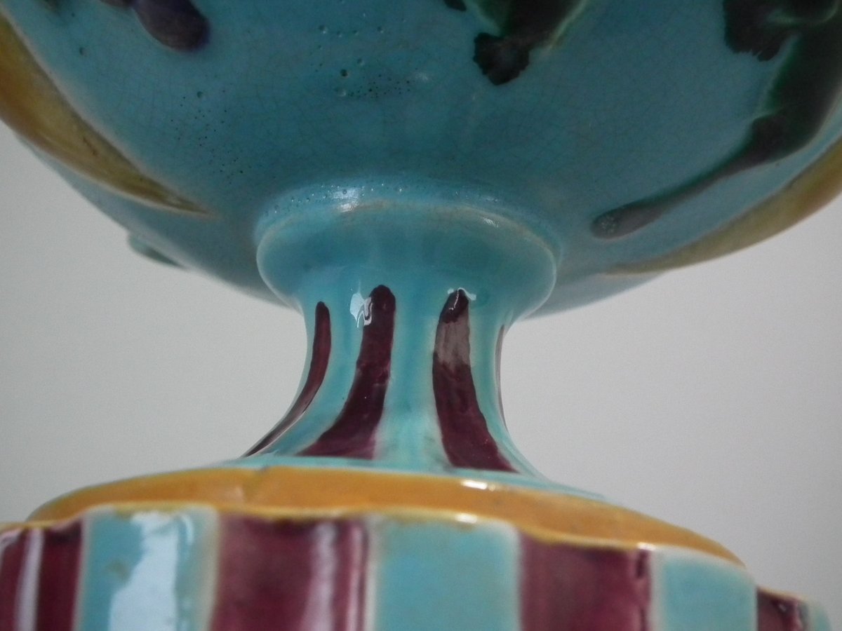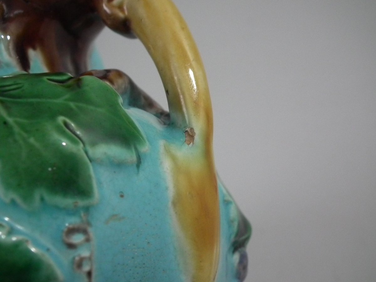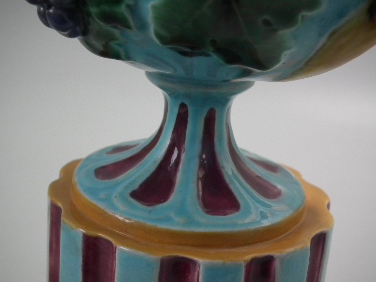 Victorian, circa 1872. 8.5ins high, 6.3ins wide, 4.9ins depth. Minton Majolica vase which features grapes and vine leaves, two lion head handles and a (fixed) pedestal base.