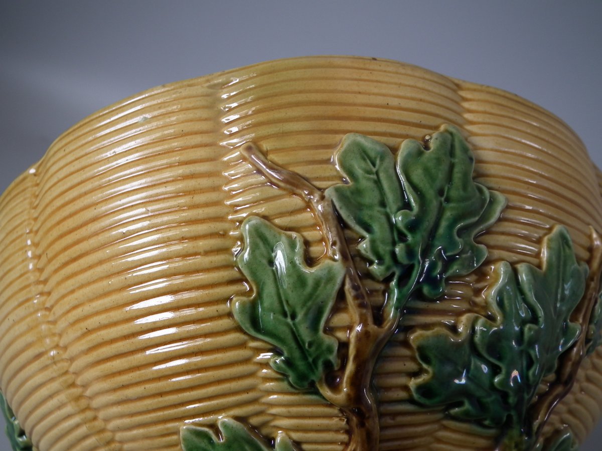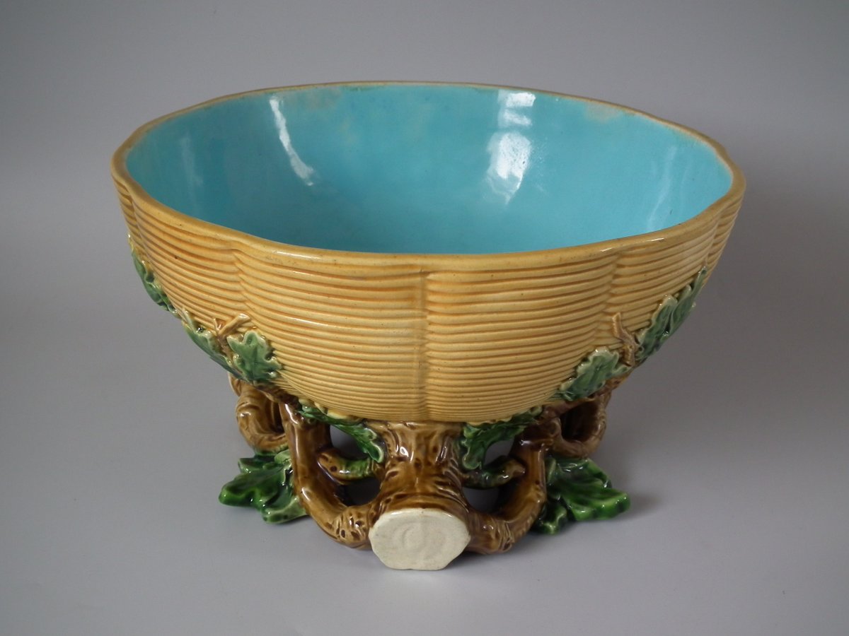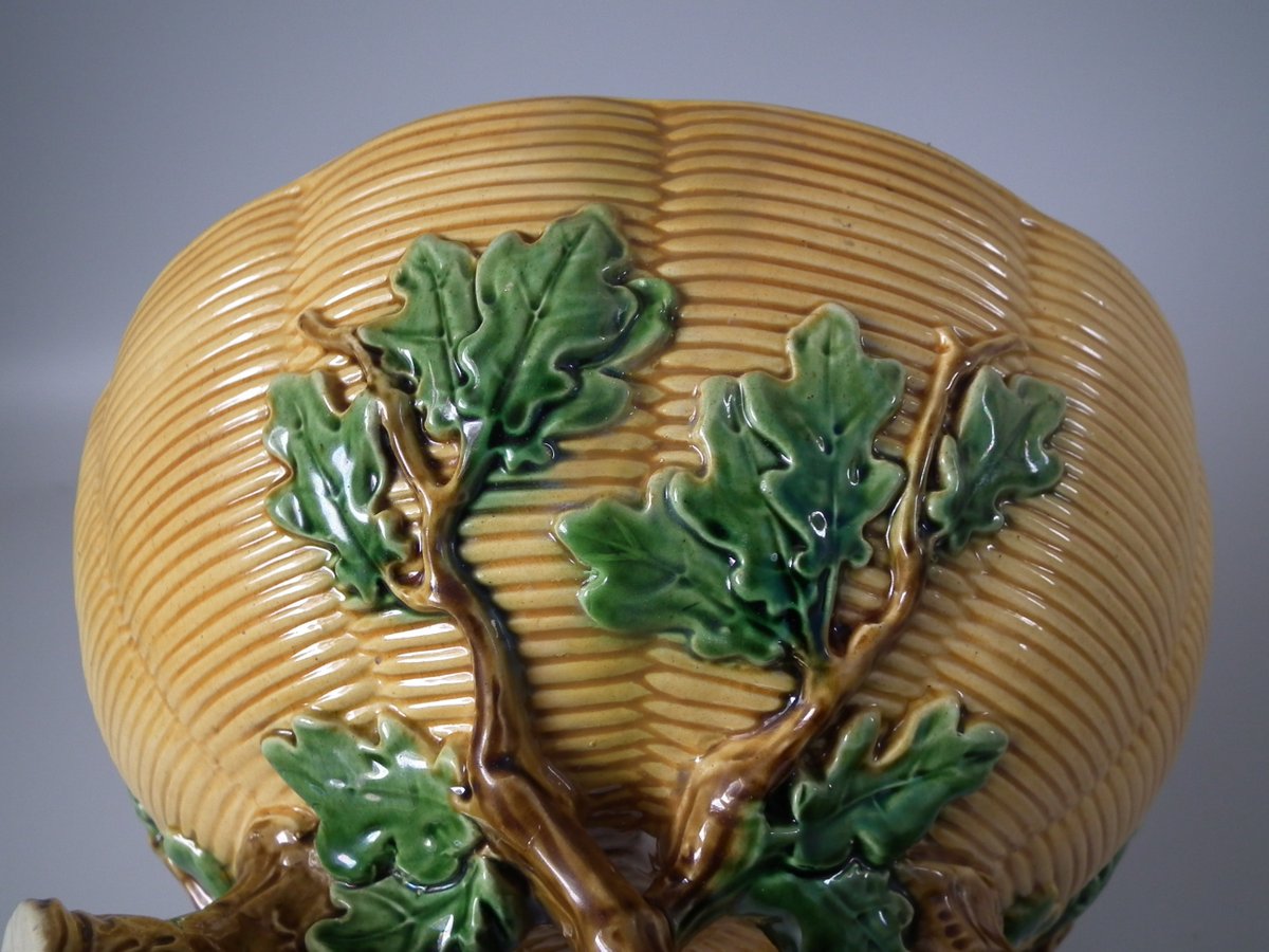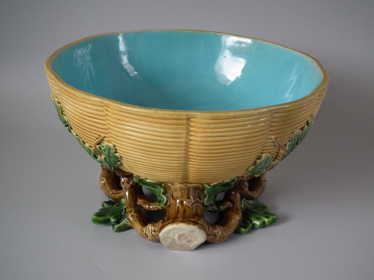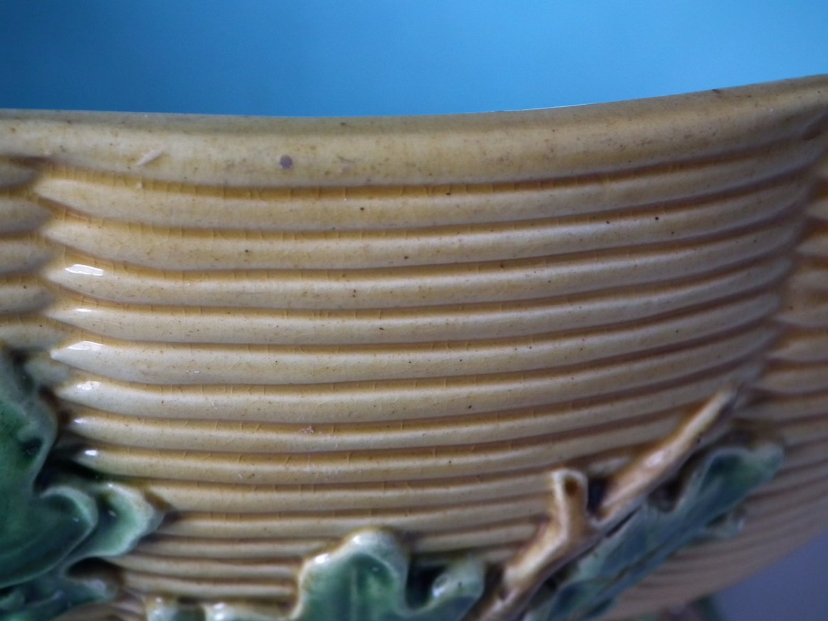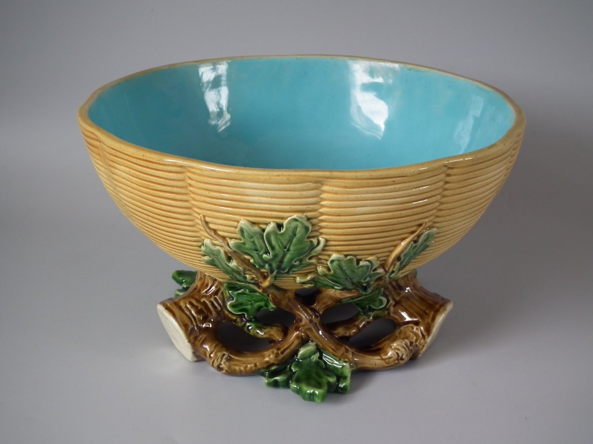 Victorian, circa 1876. 5.5ins high, 9.4ins wide, 9.4ins depth. Minton Majolica bowl which features leafy oak branches supporting a basketweave bowl.