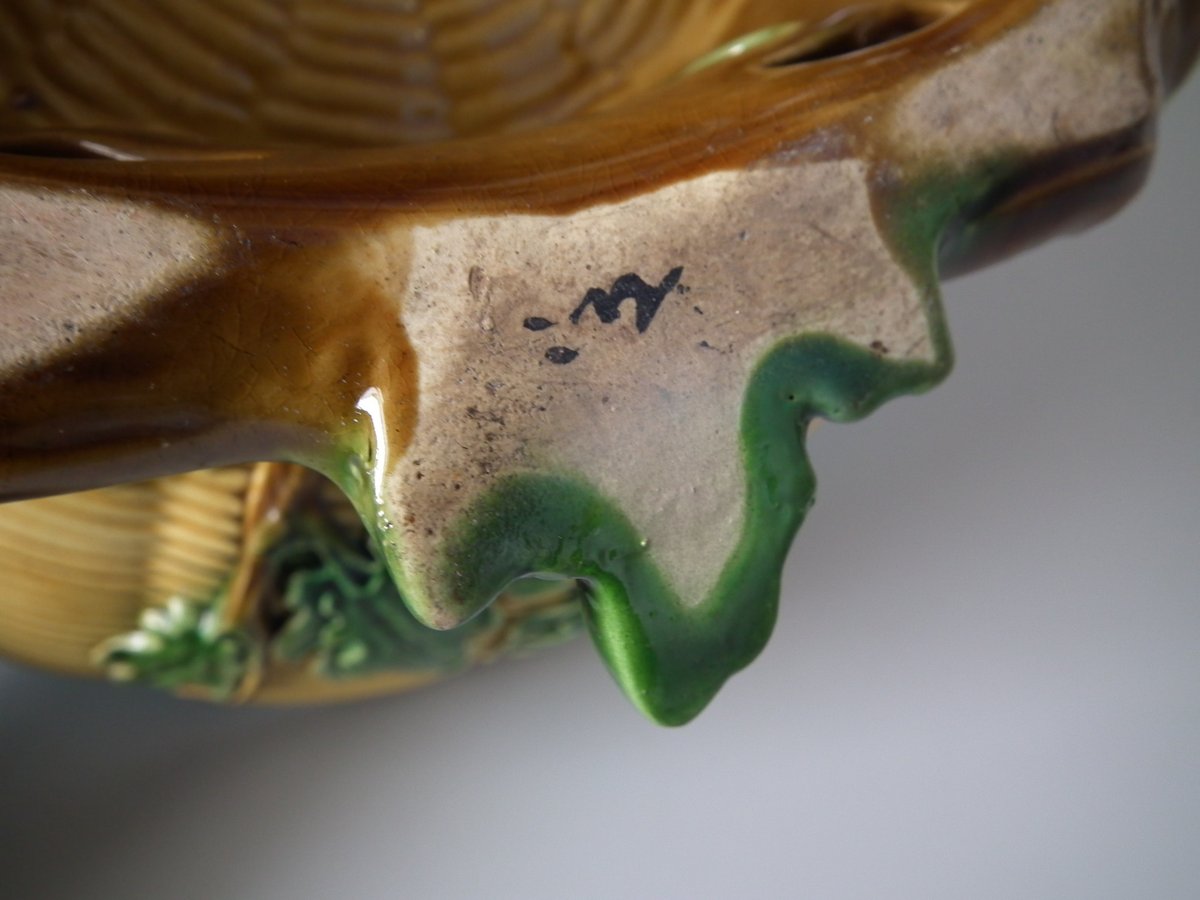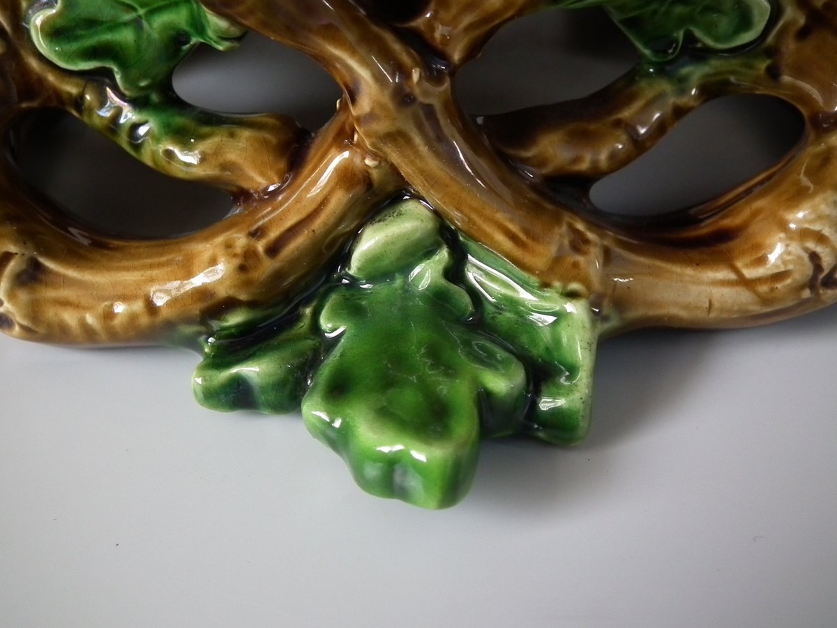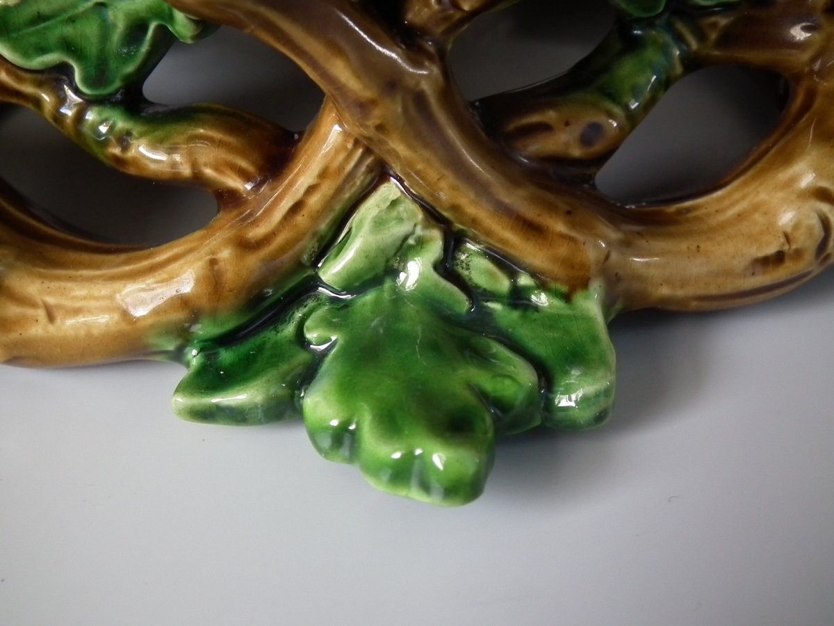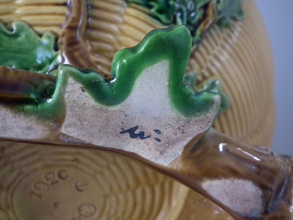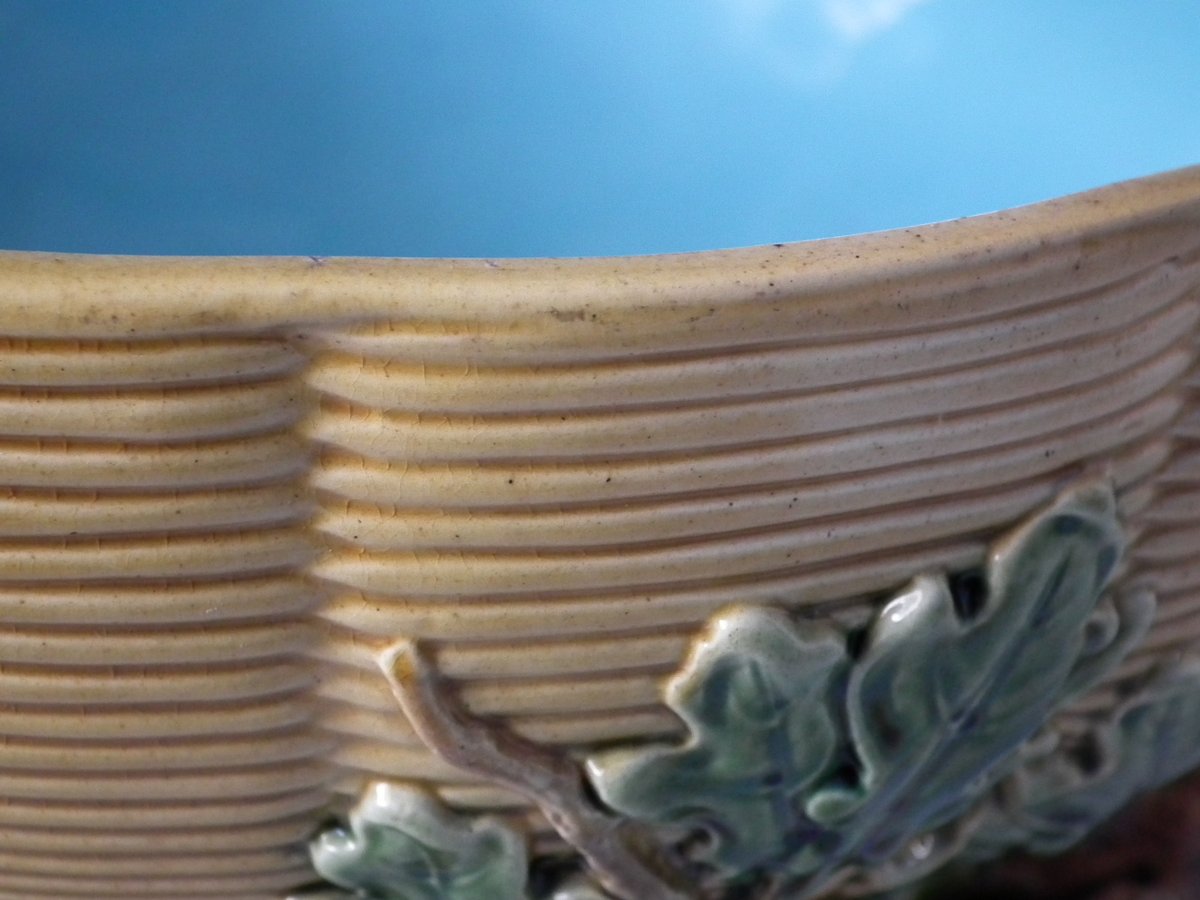 Victorian, circa 1876. 5.5ins high, 9.4ins wide, 9.4ins depth. Minton Majolica bowl which features leafy oak branches supporting a basketweave bowl.