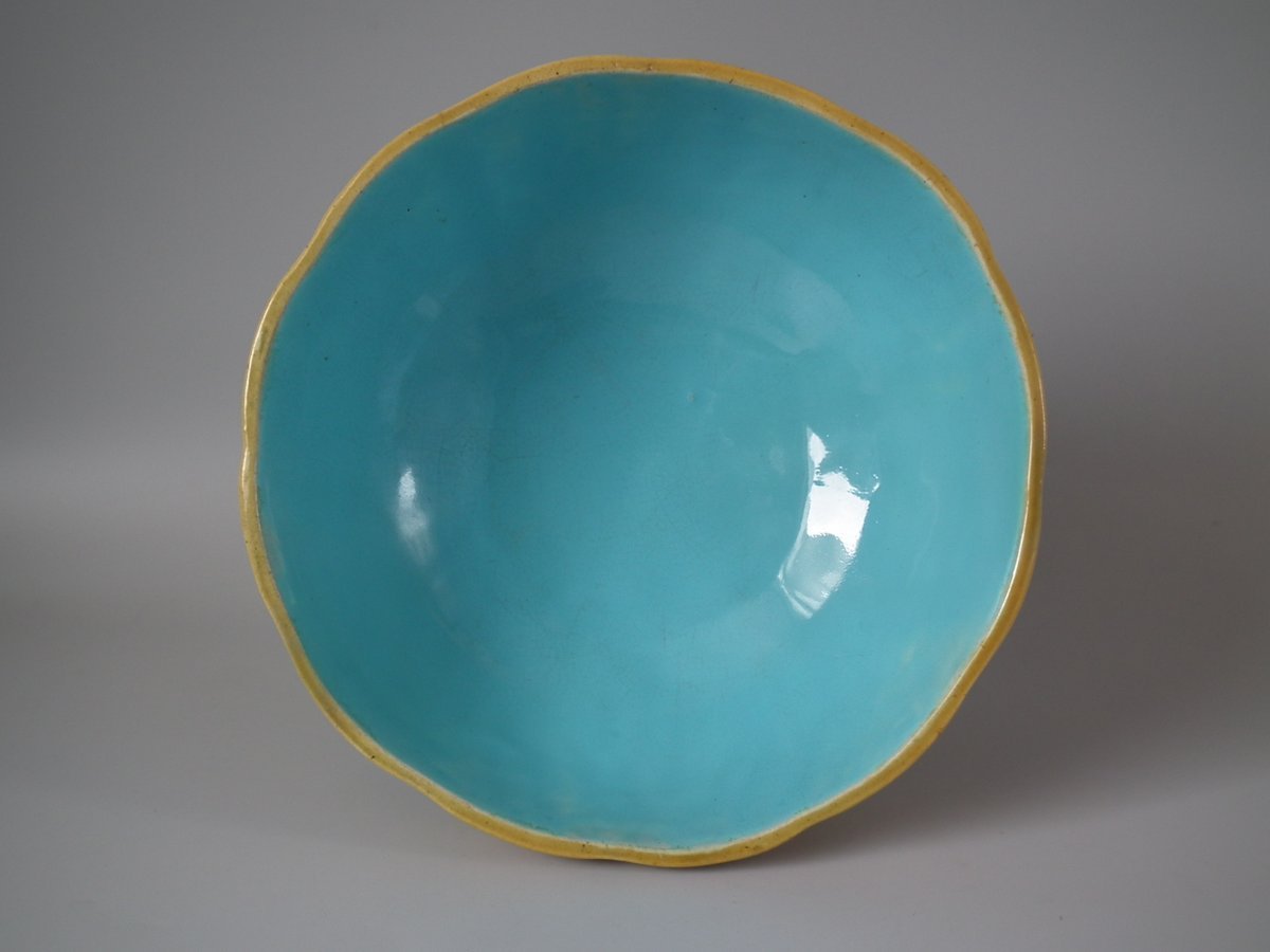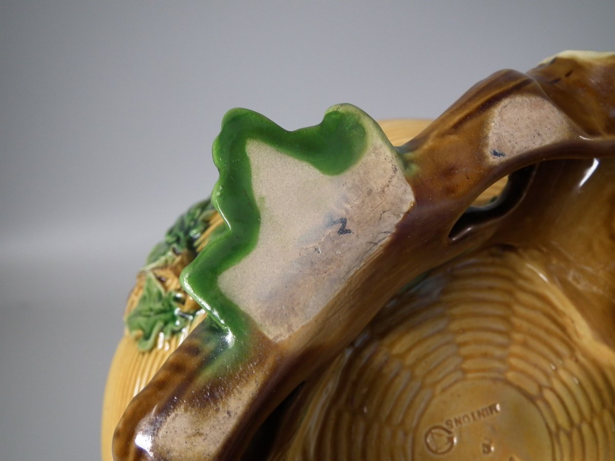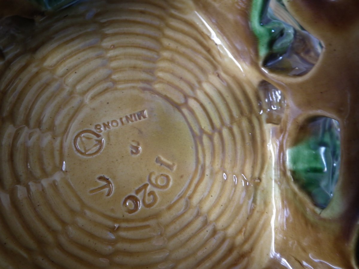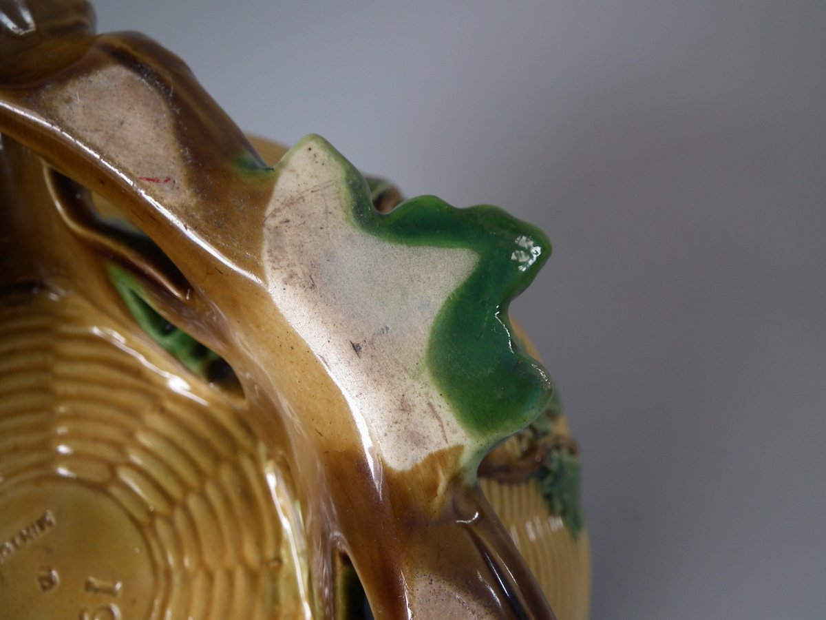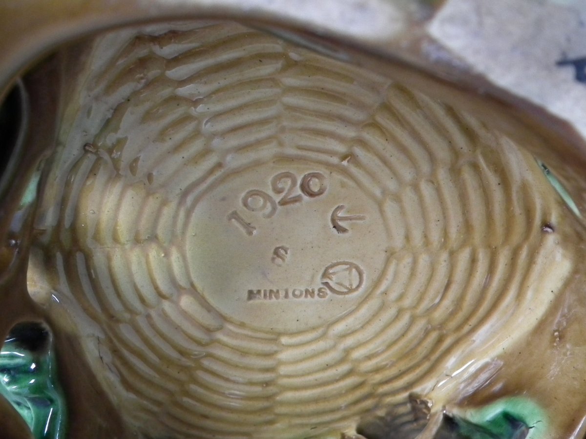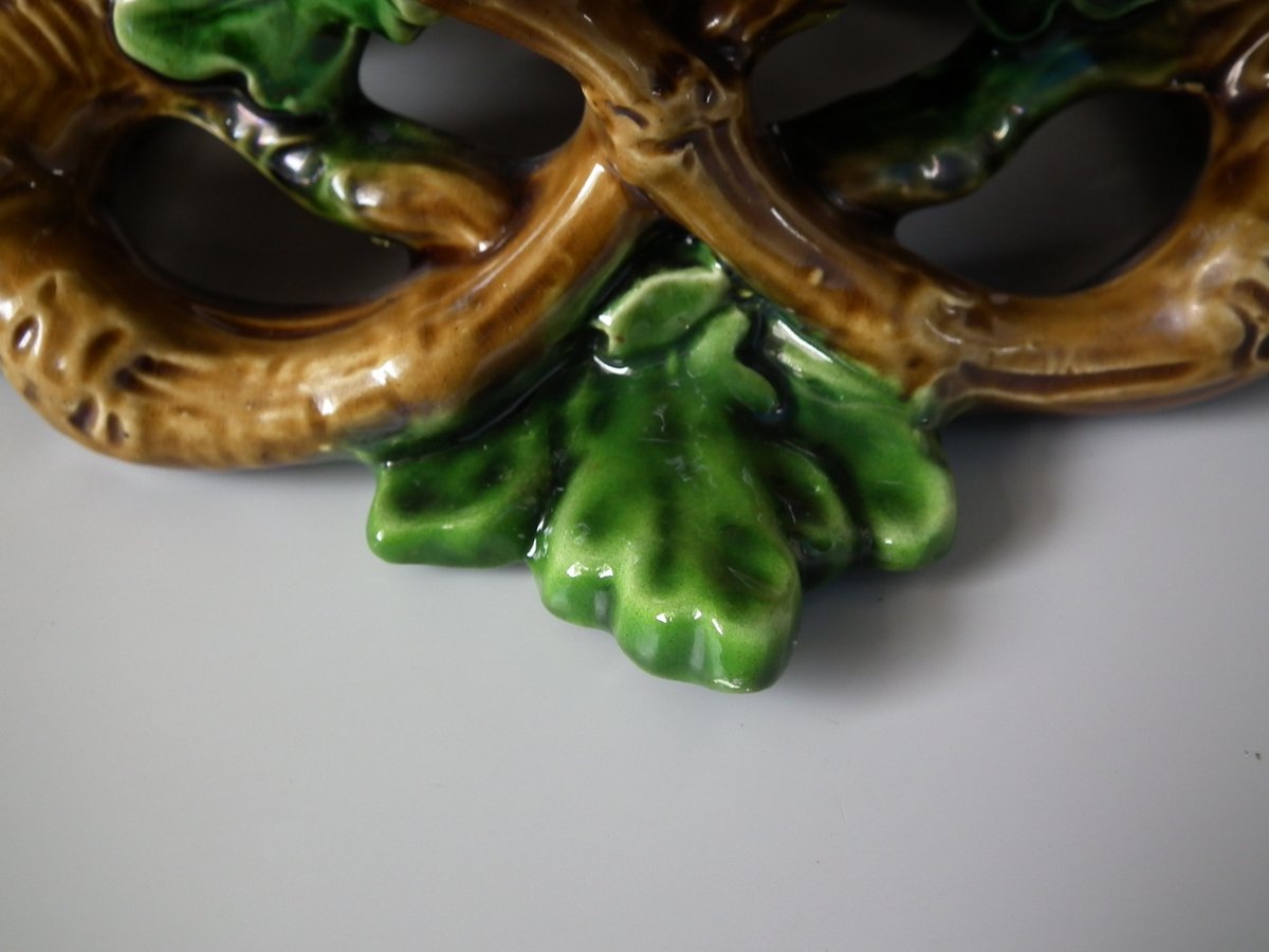 Victorian, circa 1876. 5.5ins high, 9.4ins wide, 9.4ins depth. Minton Majolica bowl which features leafy oak branches supporting a basketweave bowl.