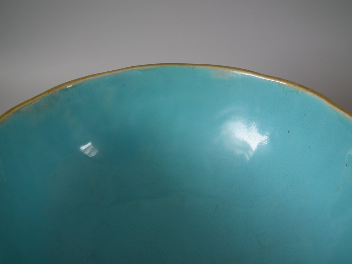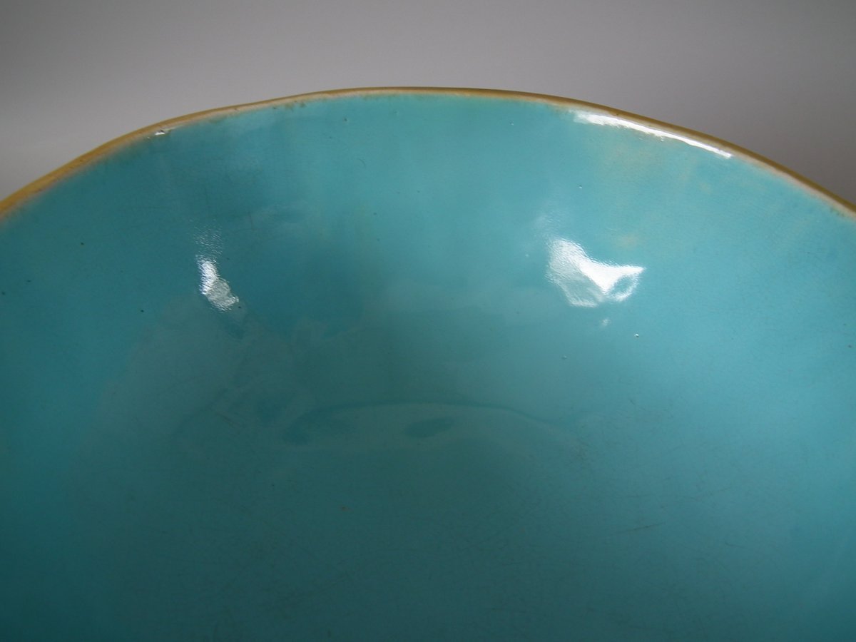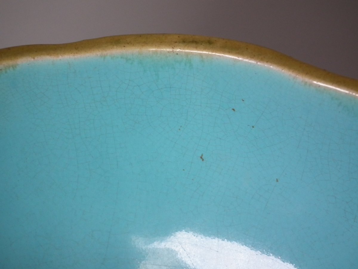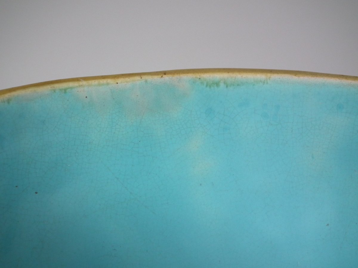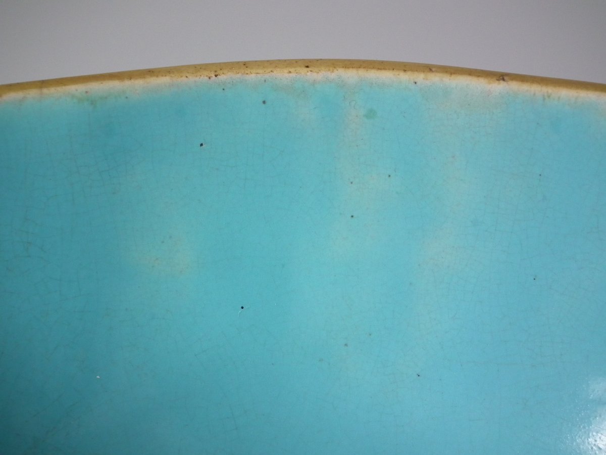 KILN EFFECTS: thin glaze application to turquoise glaze in places.