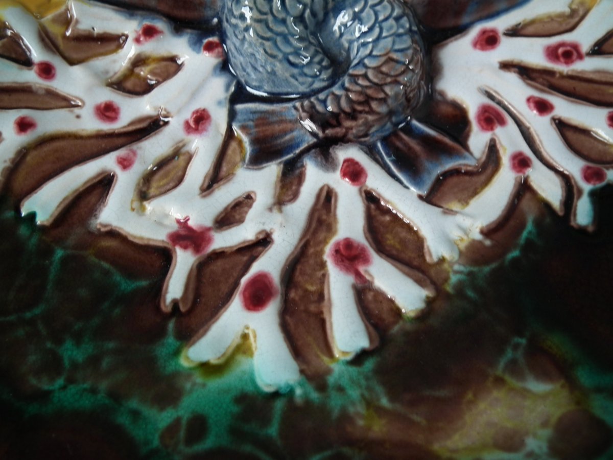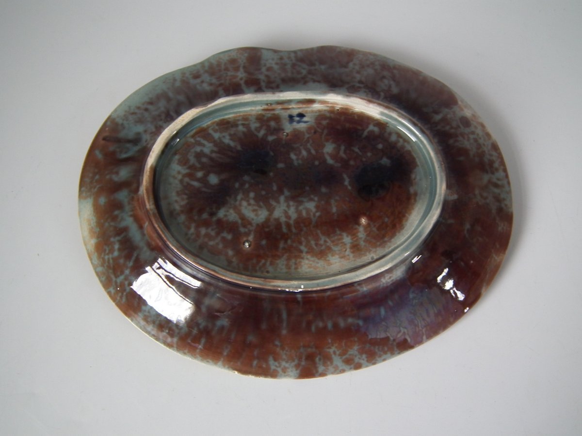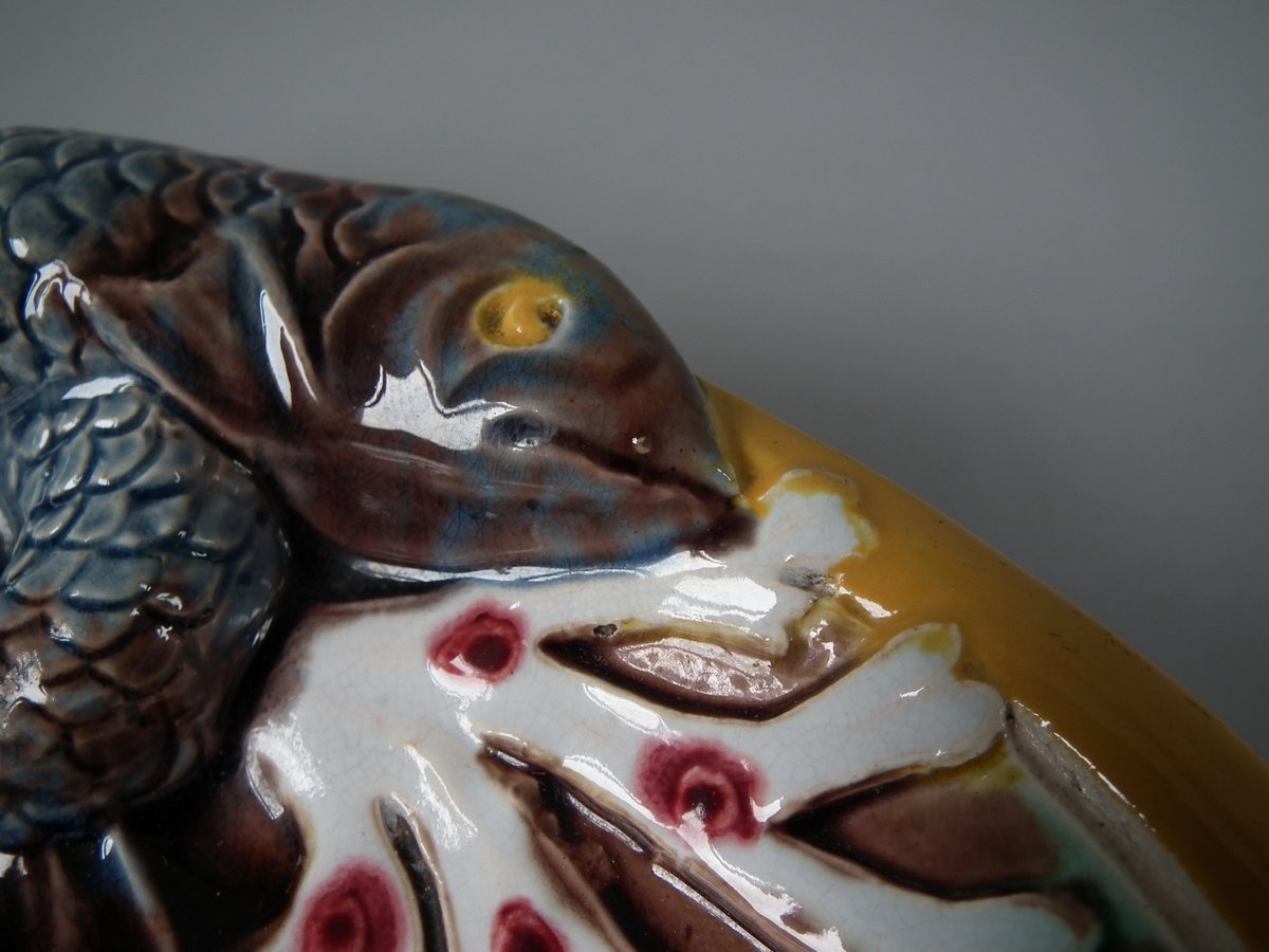 Victorian, circa 1870. 1.4ins high, 8.1ins wide, 2.6ins depth. Holdcroft Majolica serving dish which features two entwined fish and coral.