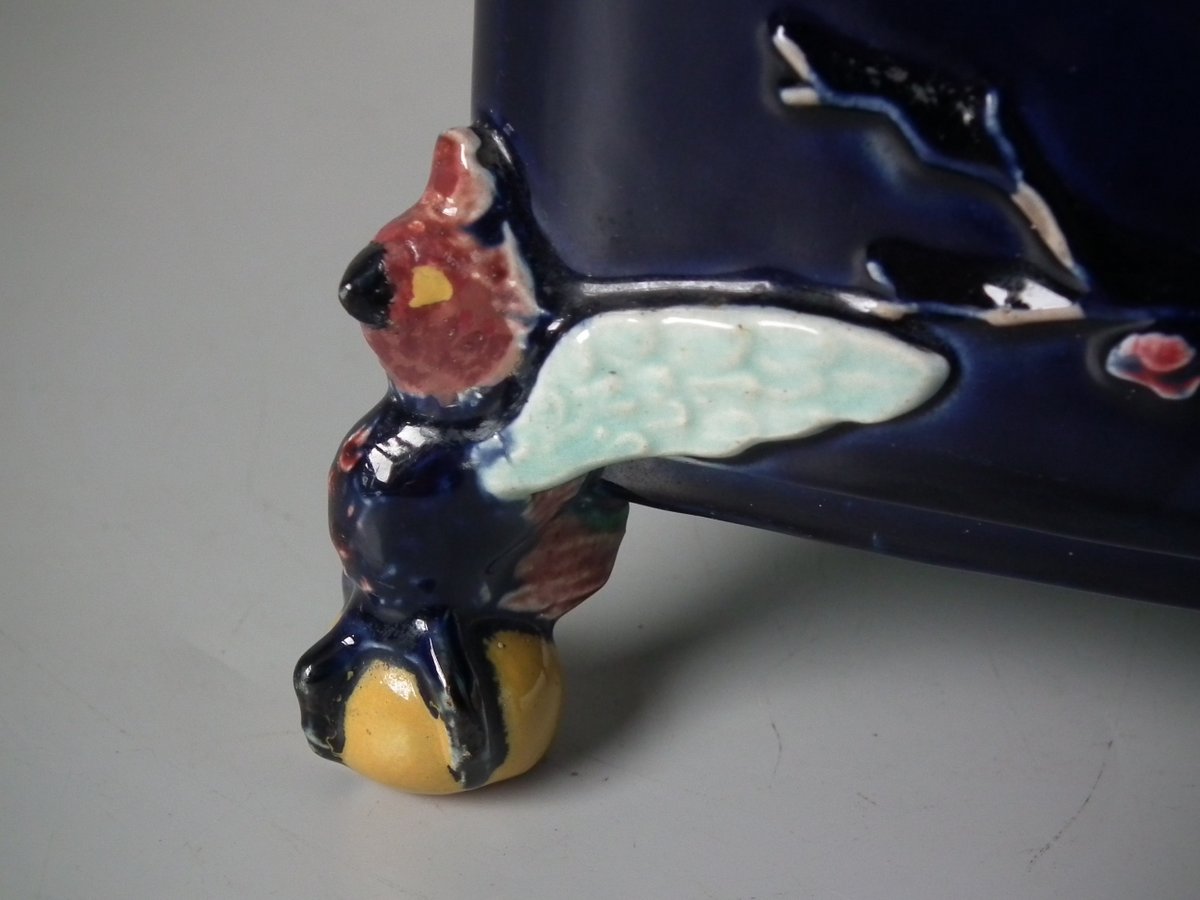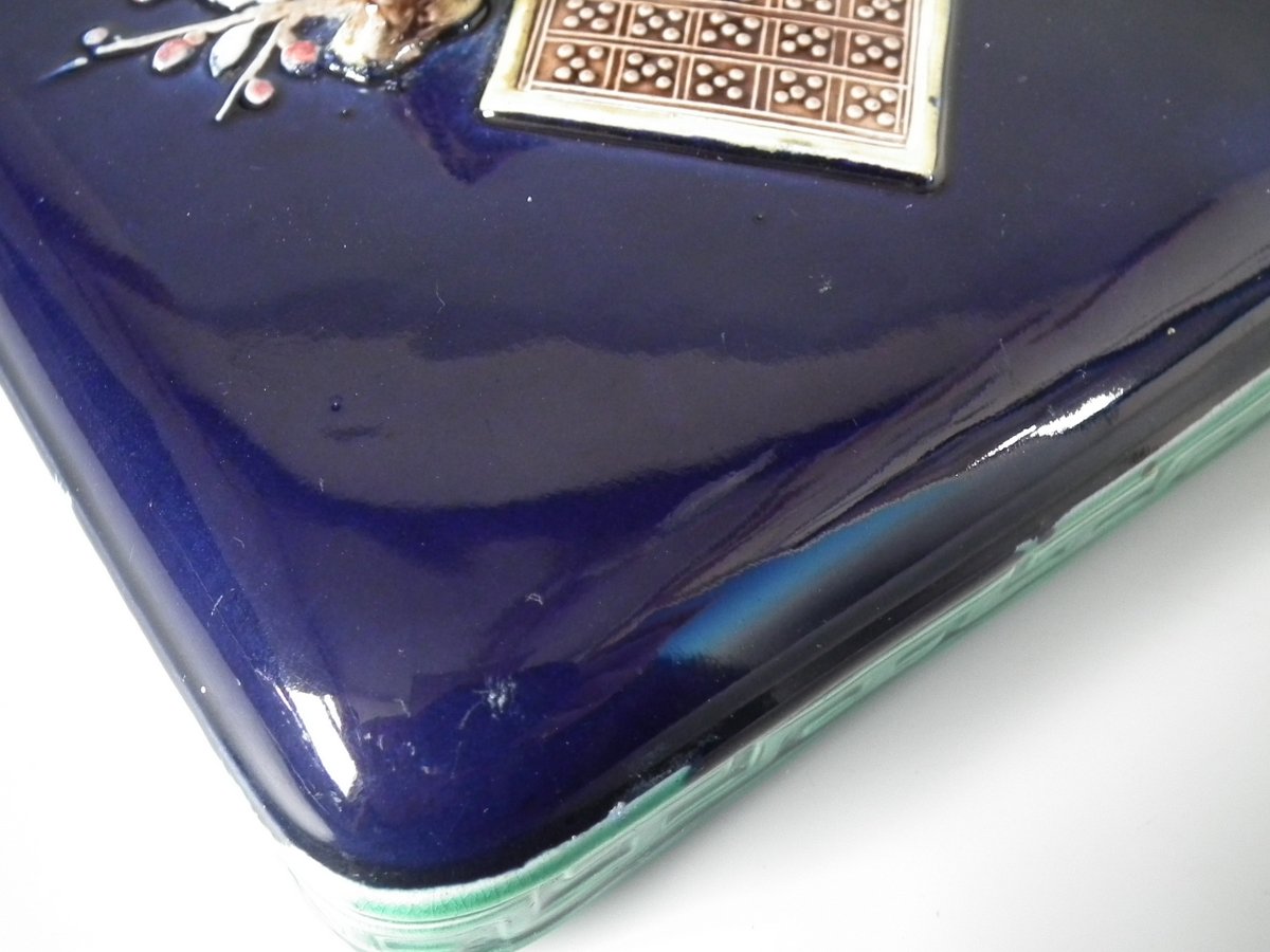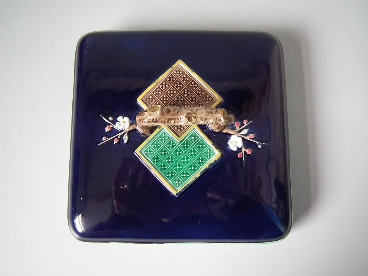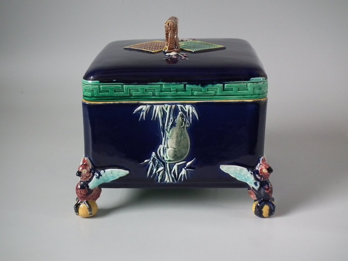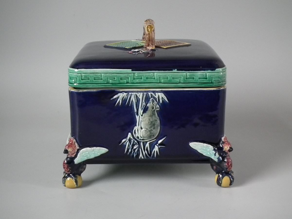 Victorian, circa 1880. 6.9ins high, 6.9ins wide, 6.3ins depth. Holdcroft Majolica box and cover which features birds, tree rats on bamboo, blossom and parrot feet.