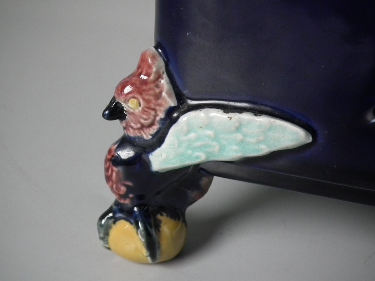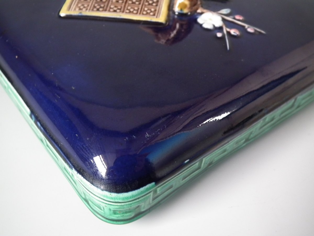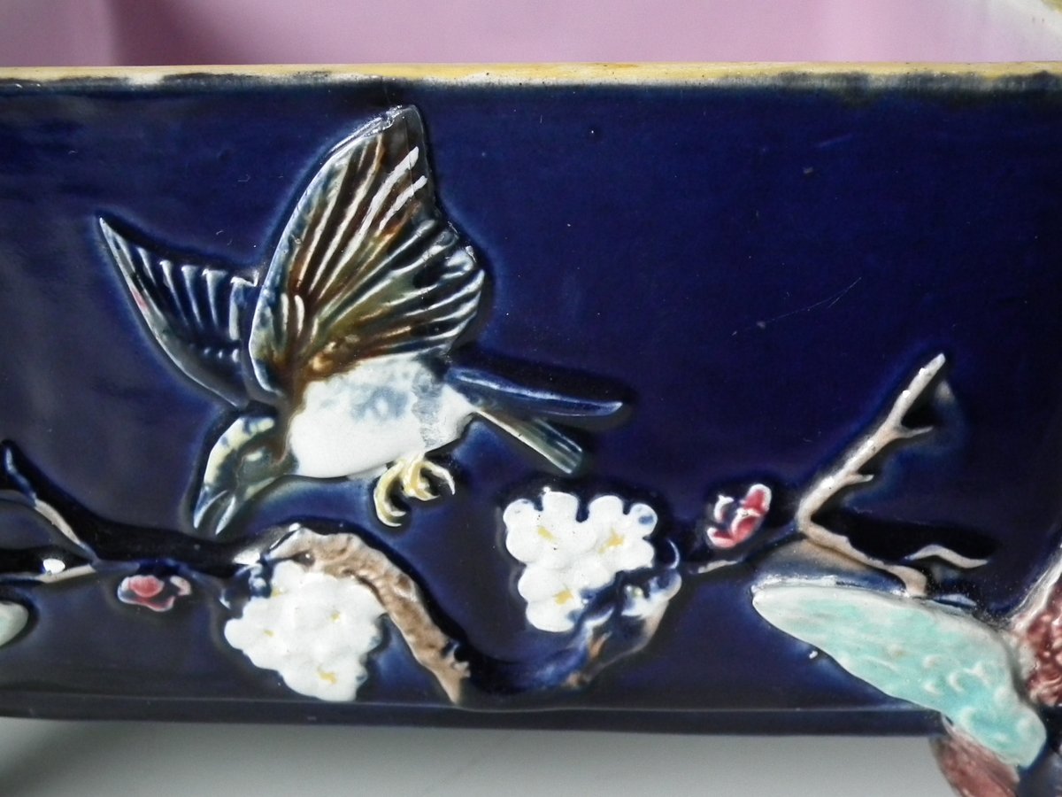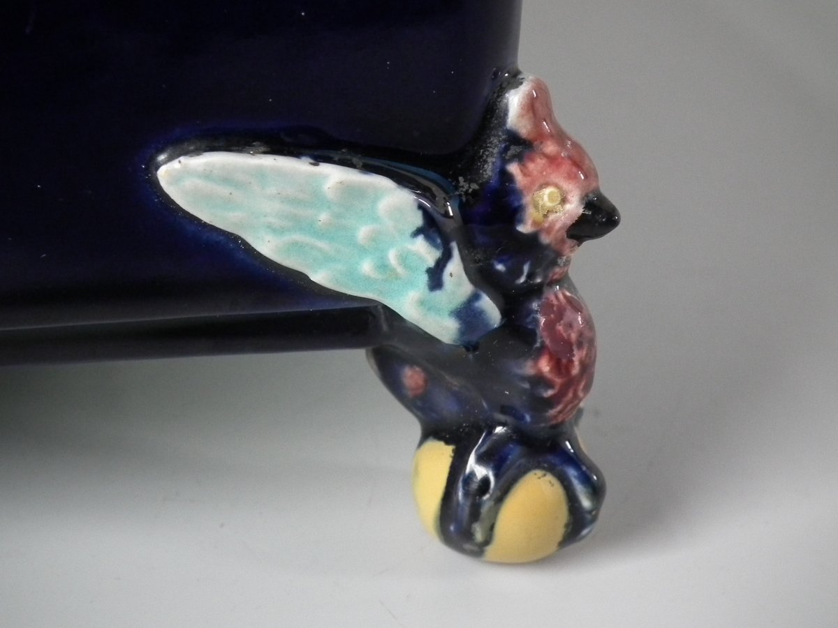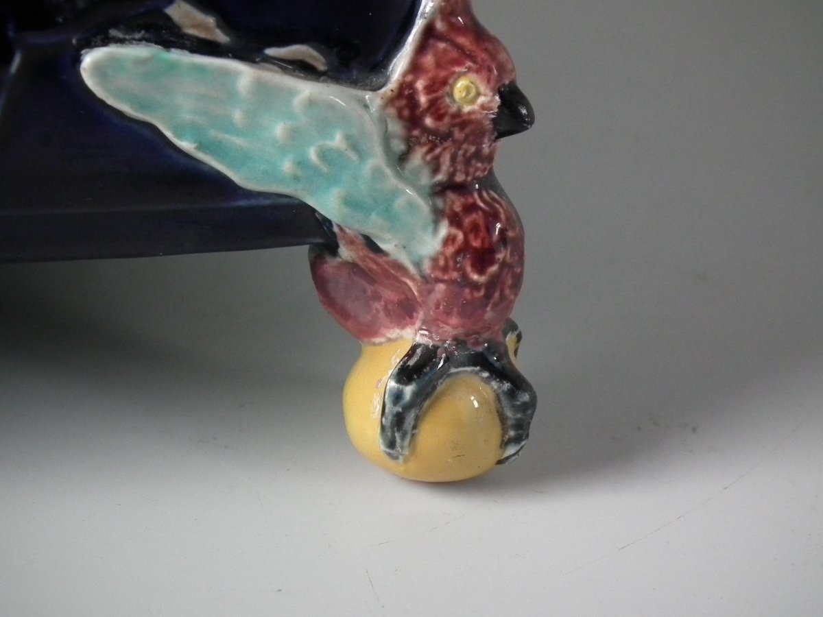 Victorian, circa 1880. 6.9ins high, 6.9ins wide, 6.3ins depth. Holdcroft Majolica box and cover which features birds, tree rats on bamboo, blossom and parrot feet.