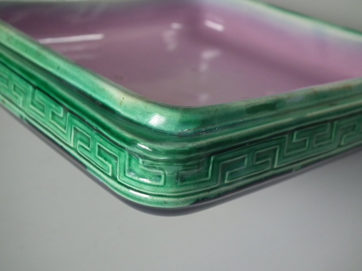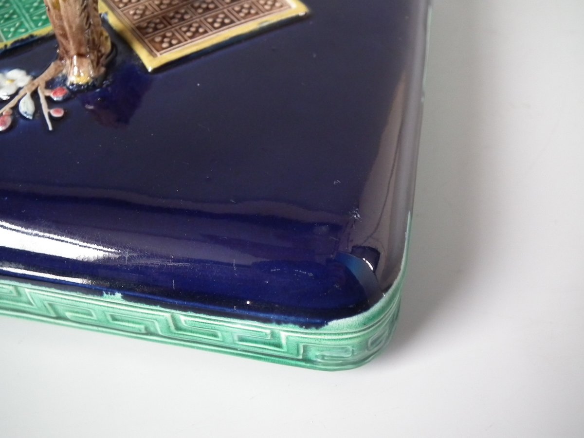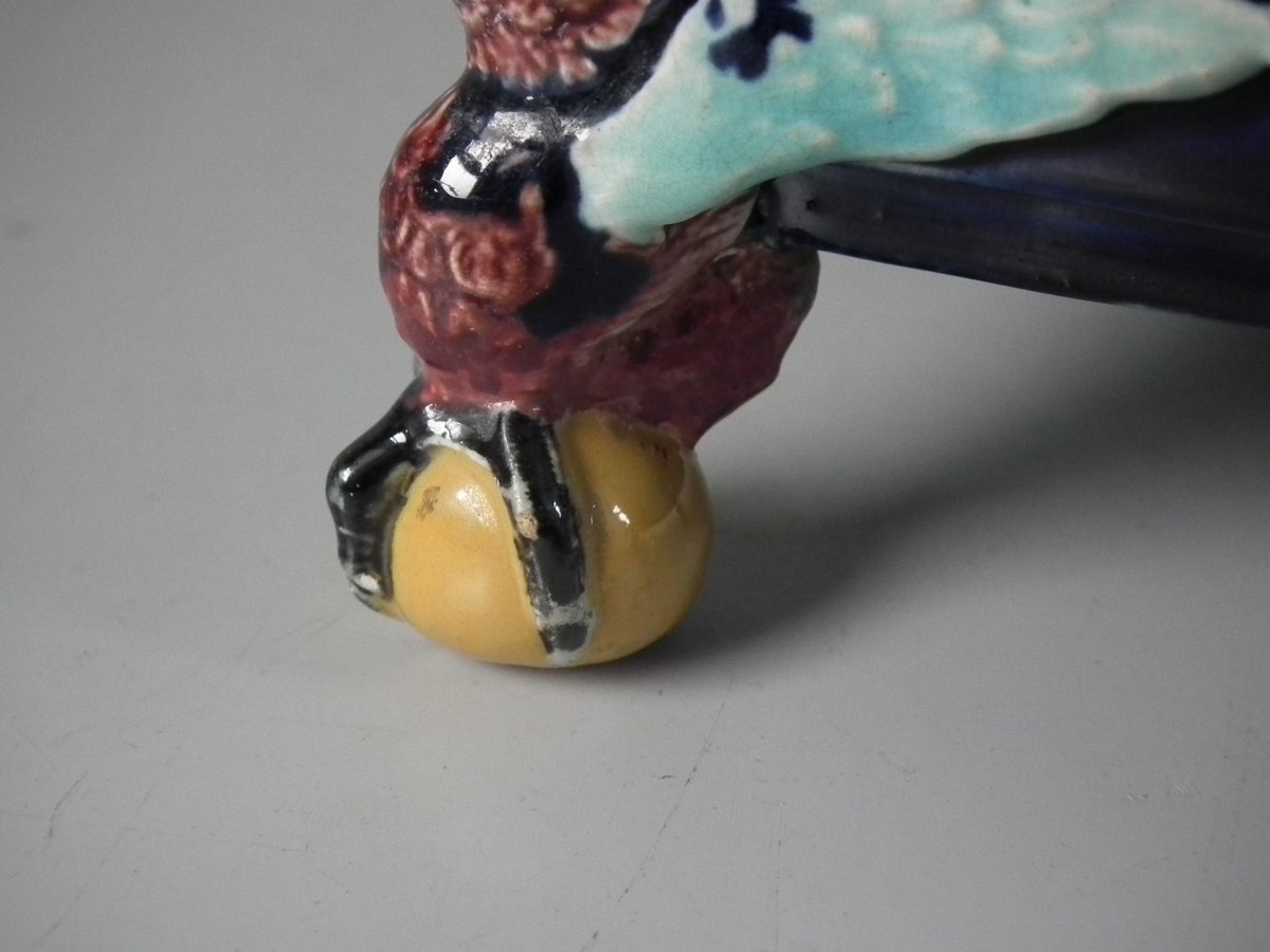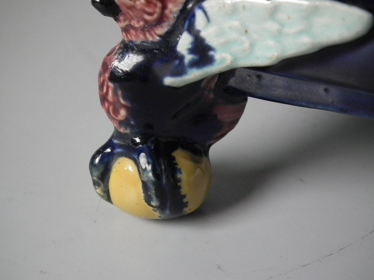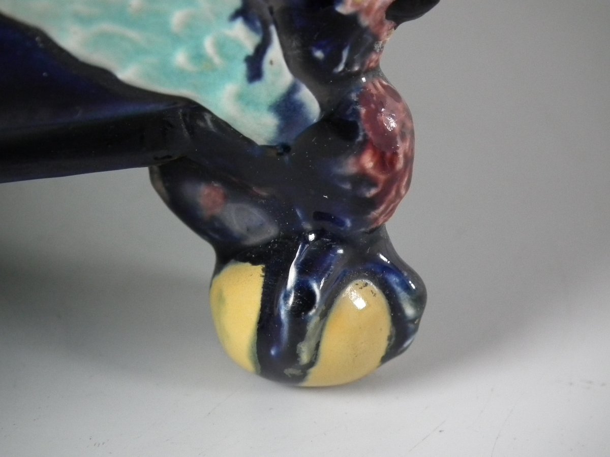 Victorian, circa 1880. 6.9ins high, 6.9ins wide, 6.3ins depth. Holdcroft Majolica box and cover which features birds, tree rats on bamboo, blossom and parrot feet.