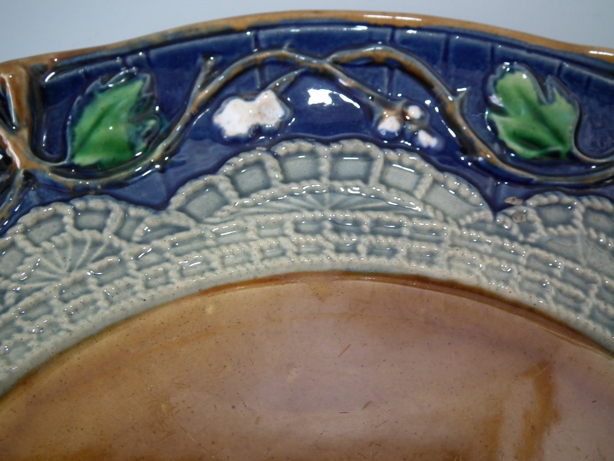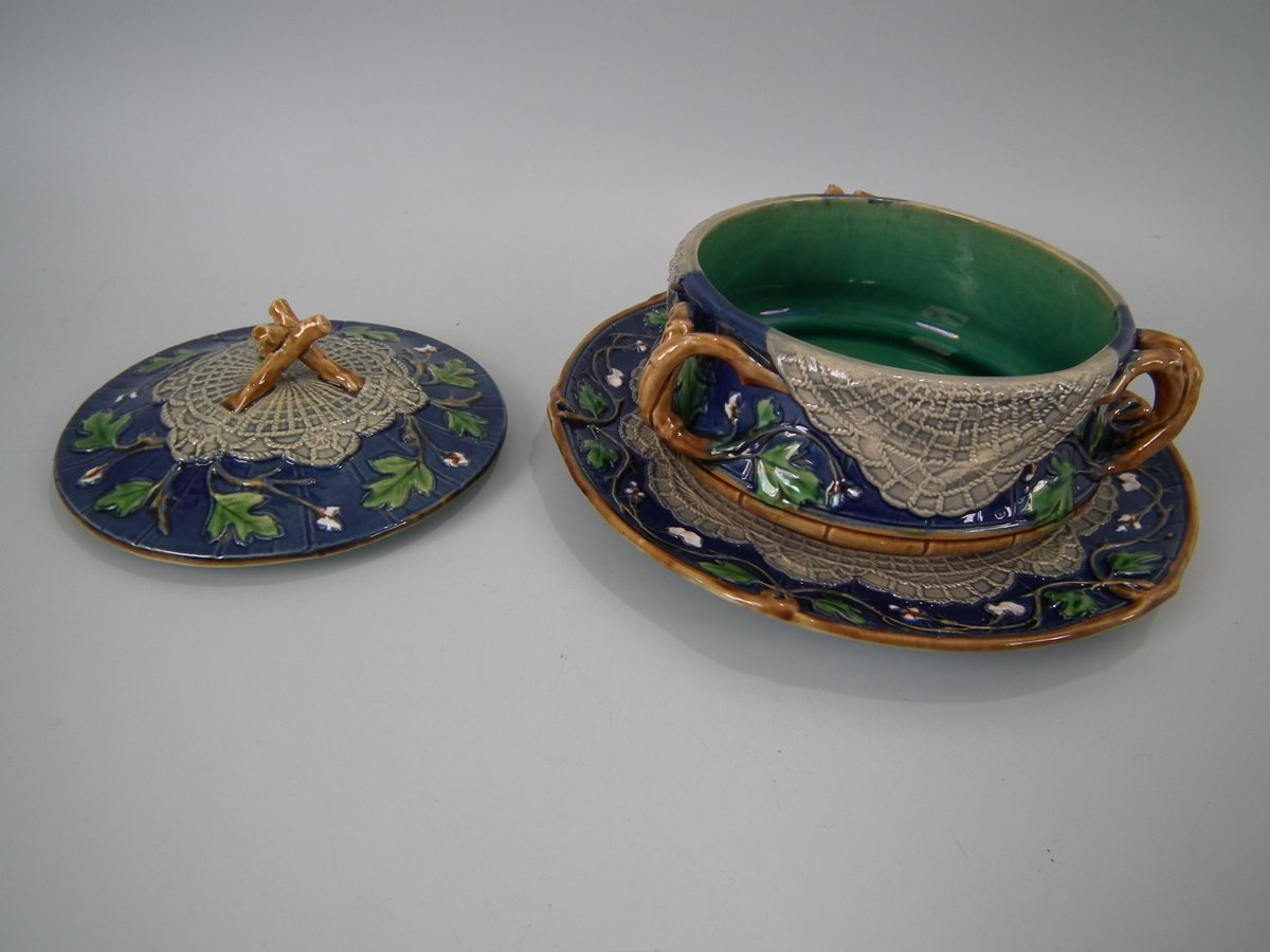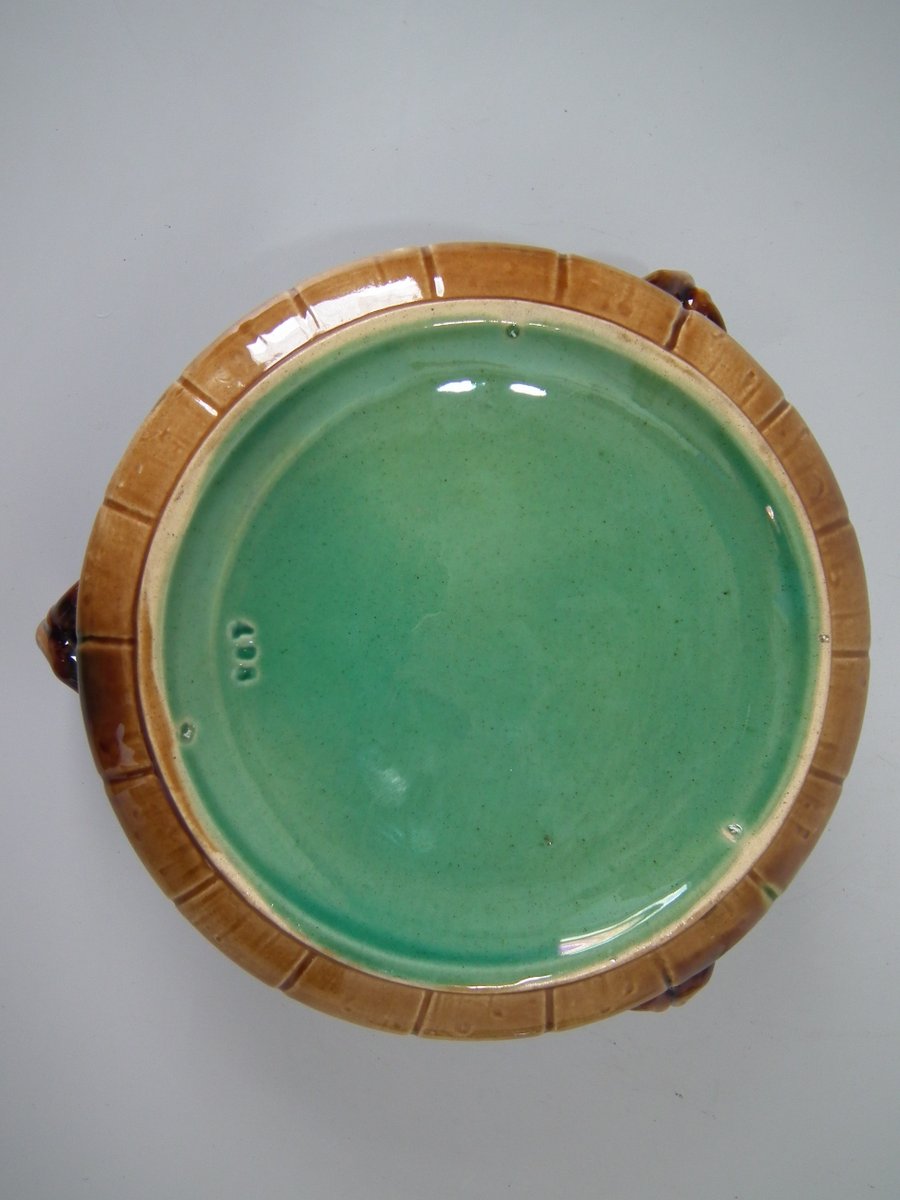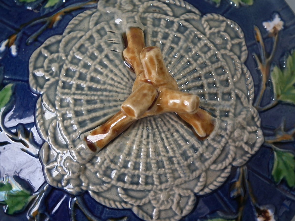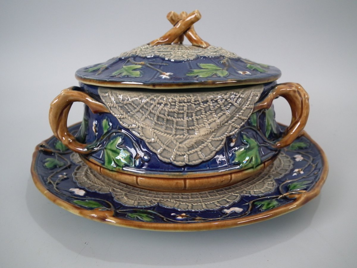Victorian, circa 1859. 4.7ins high, 8.3ins wide, 8.3ins depth. Minton Majolica dish with cover which features leaves and blossom. Crochet lace. Twig handles.