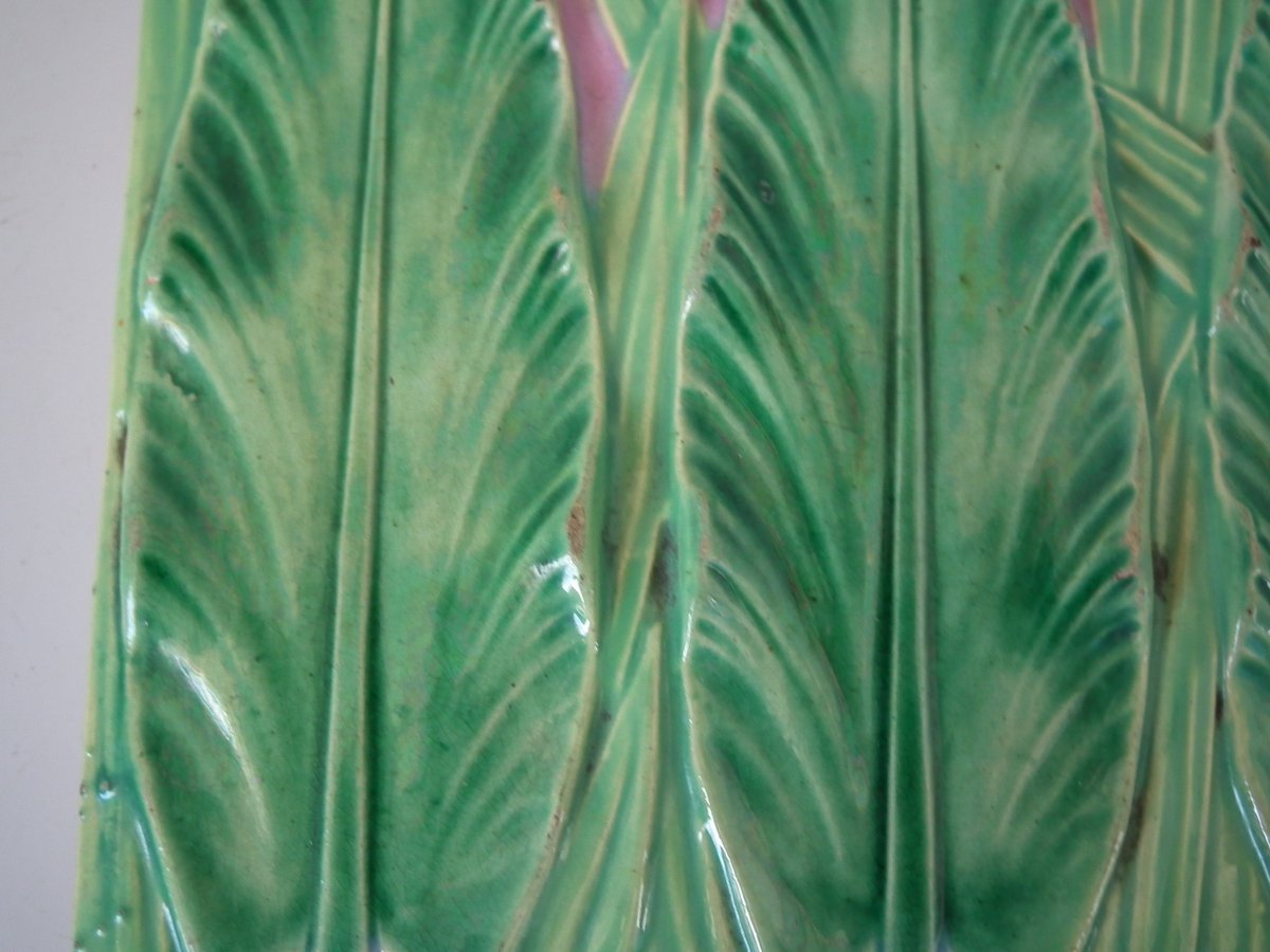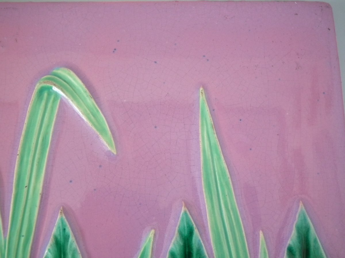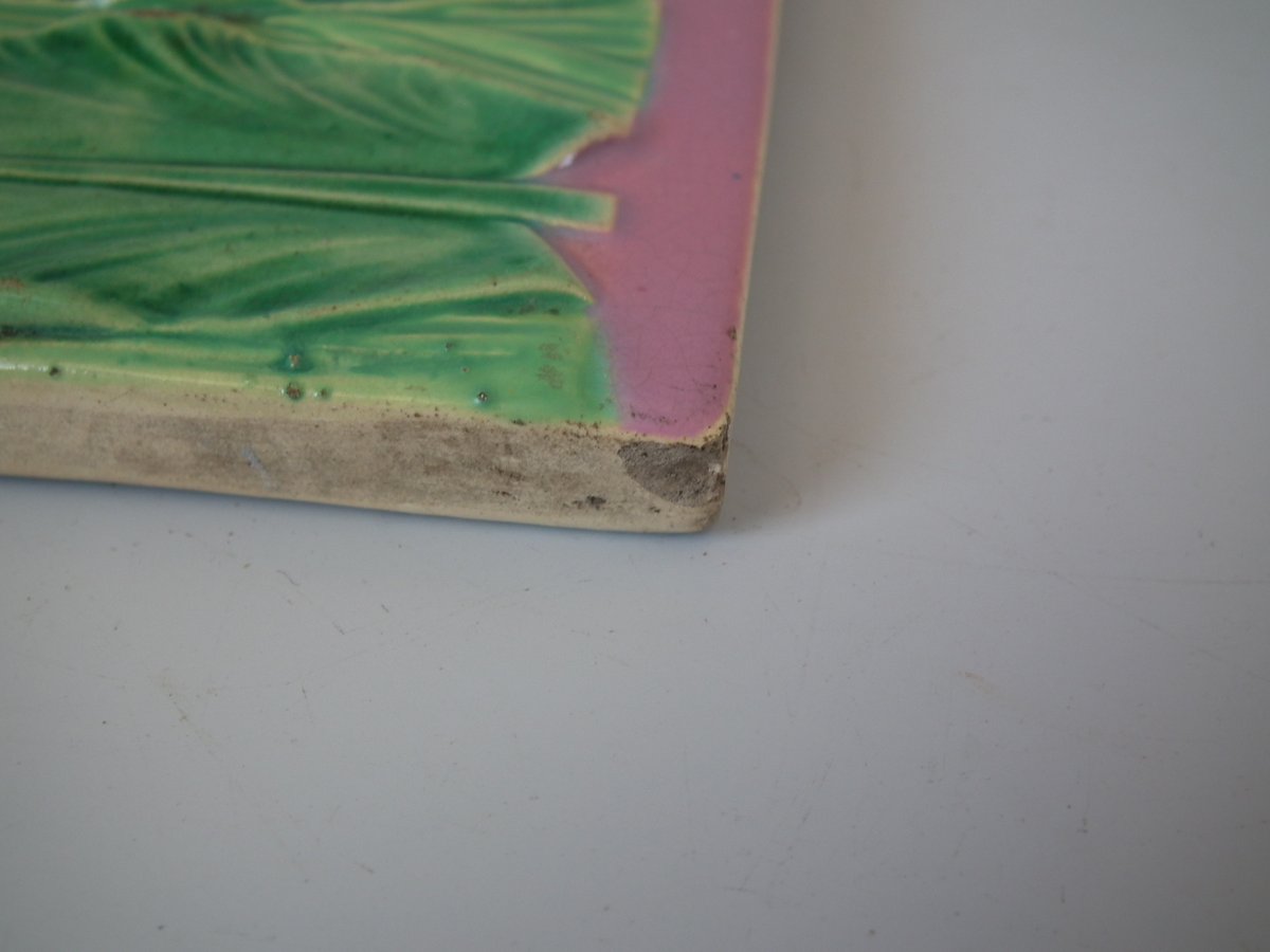 Victorian, circa 1870. 8.1ins high, 7.9ins wide, 0.4ins depth. George Jones Majolica tile which features leaves.