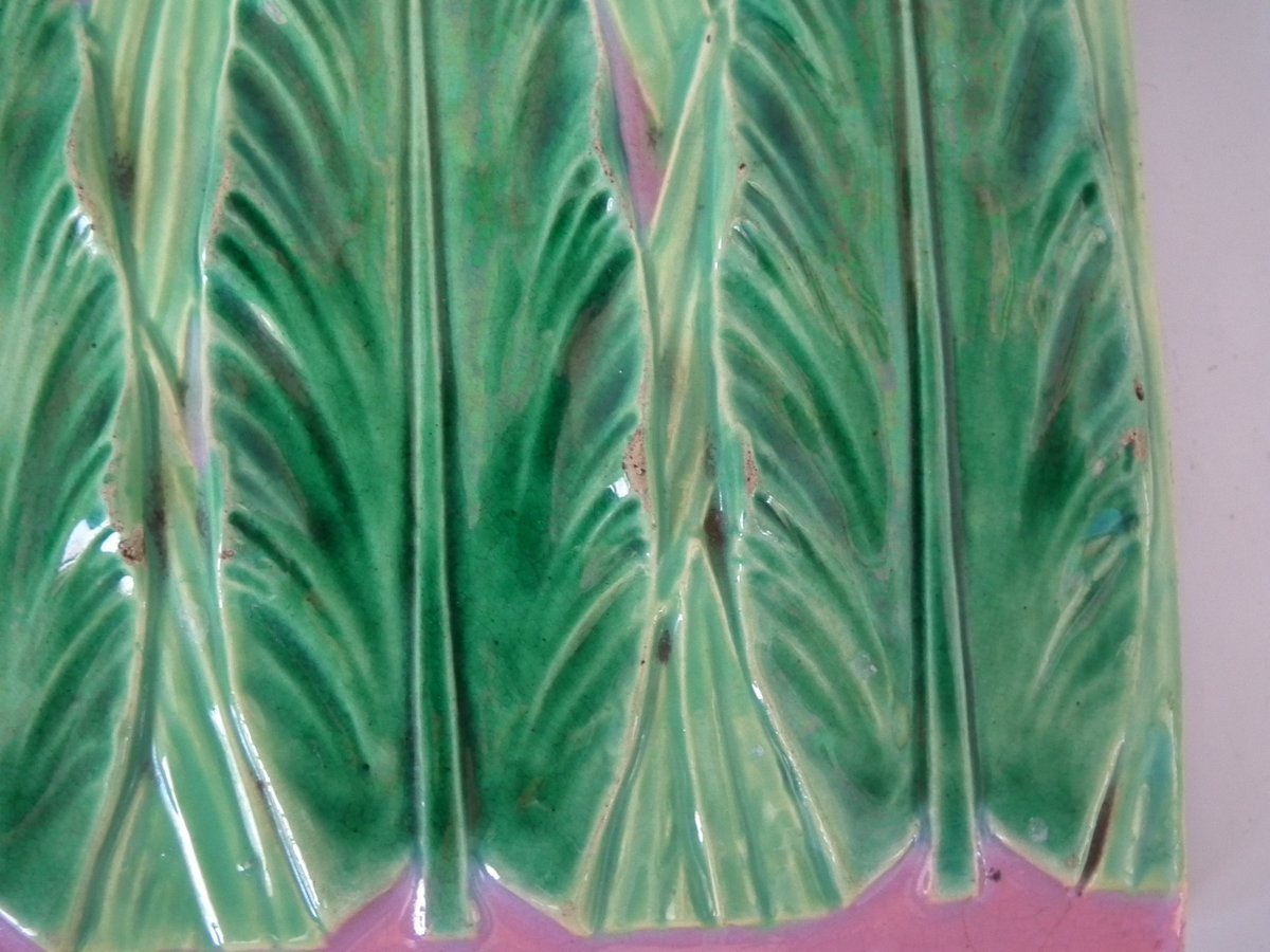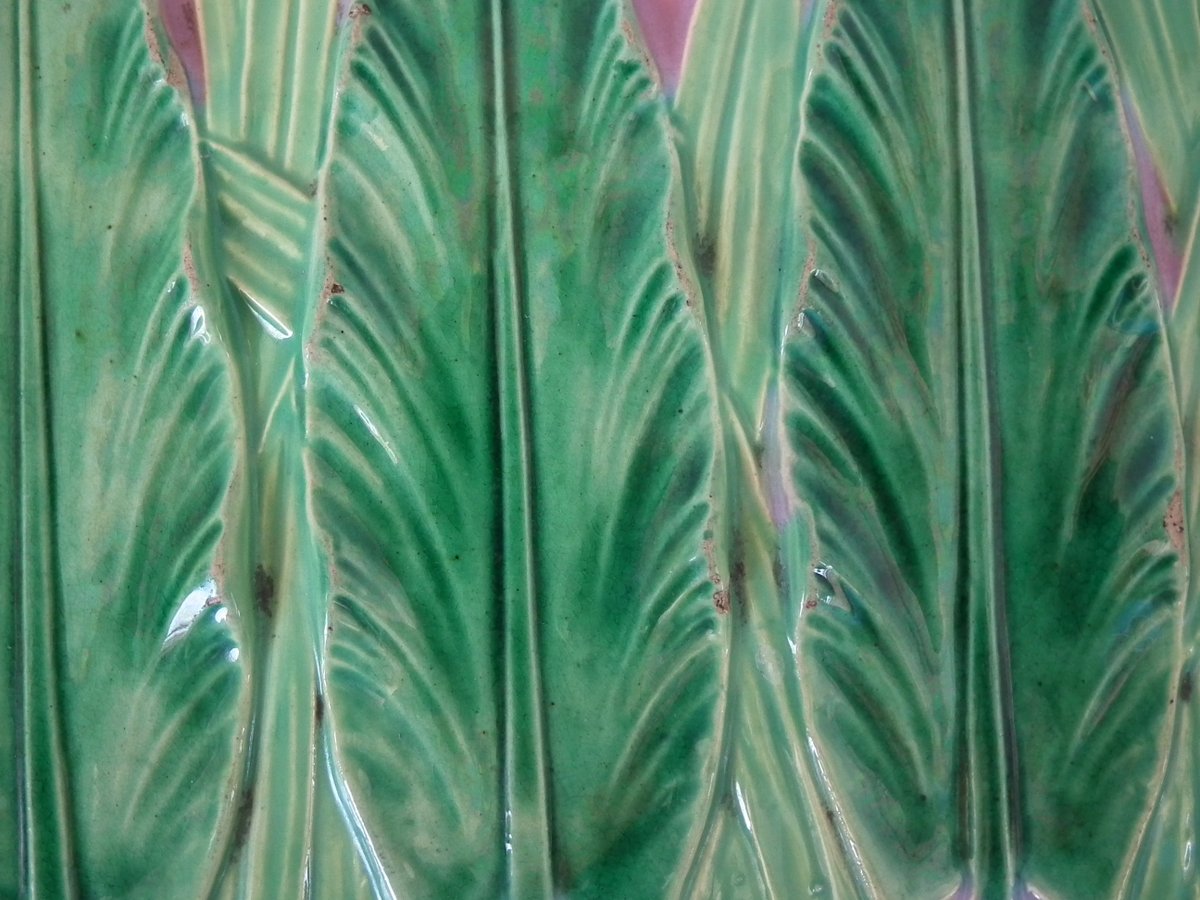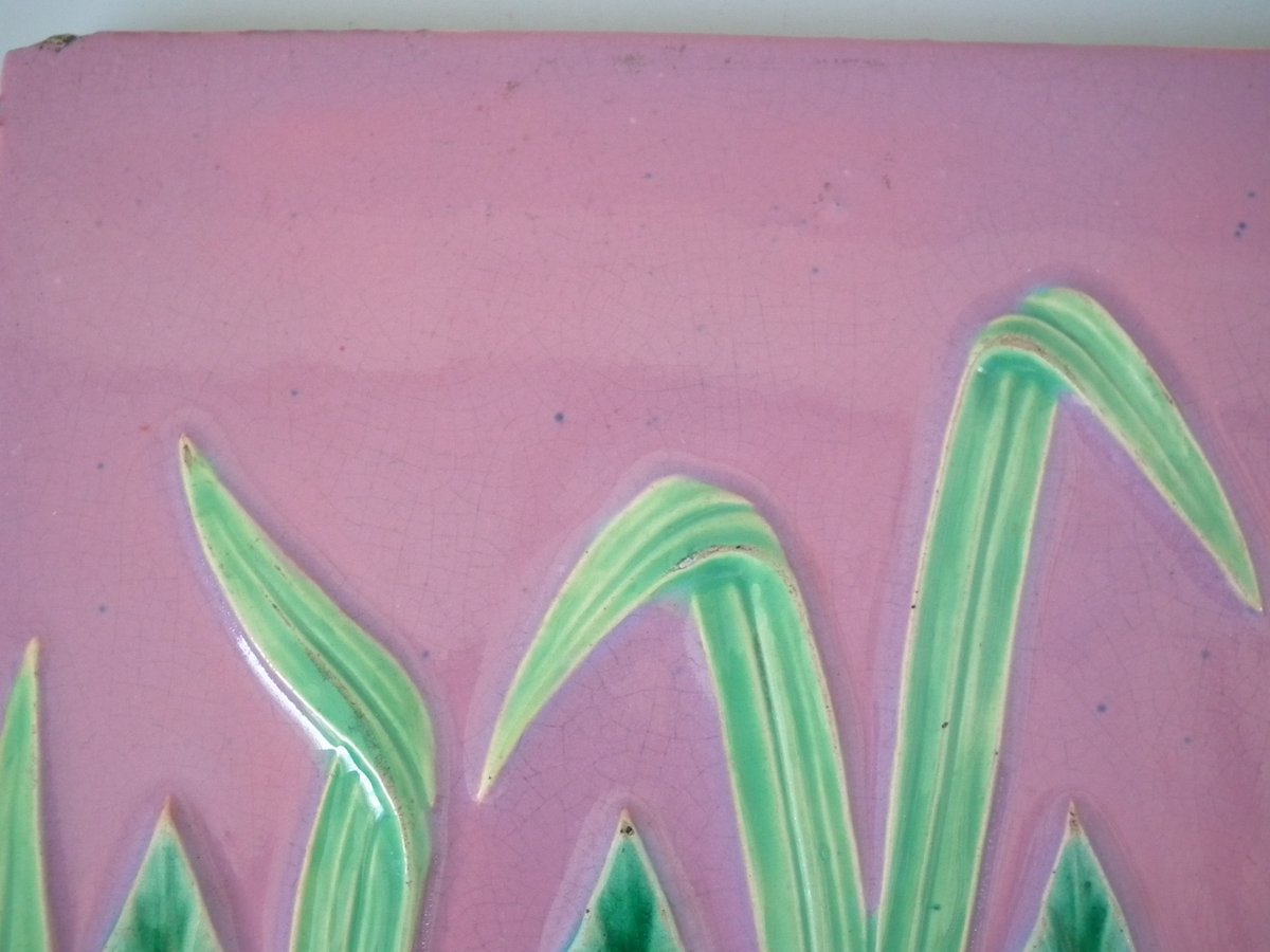 Victorian, circa 1870. 8.1ins high, 7.9ins wide, 0.4ins depth. George Jones Majolica tile which features leaves.