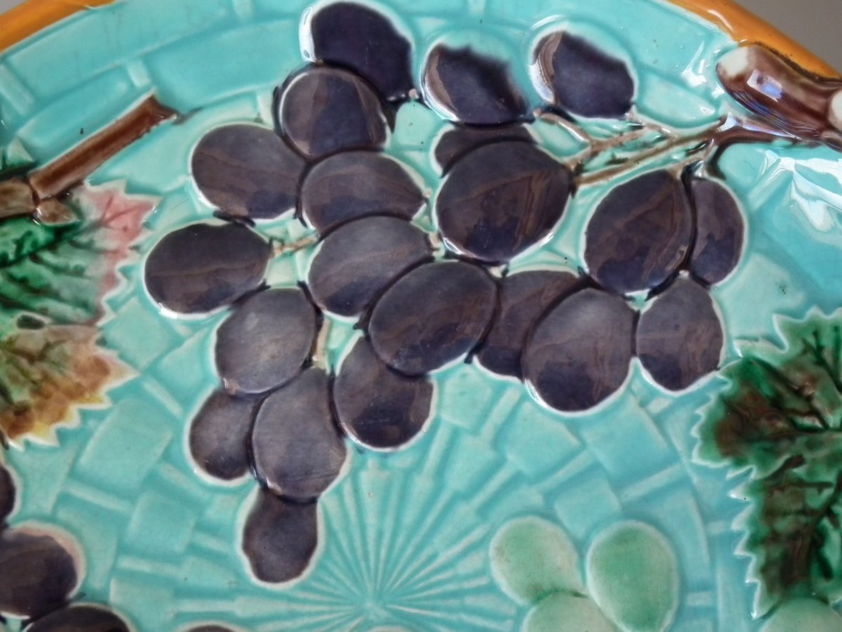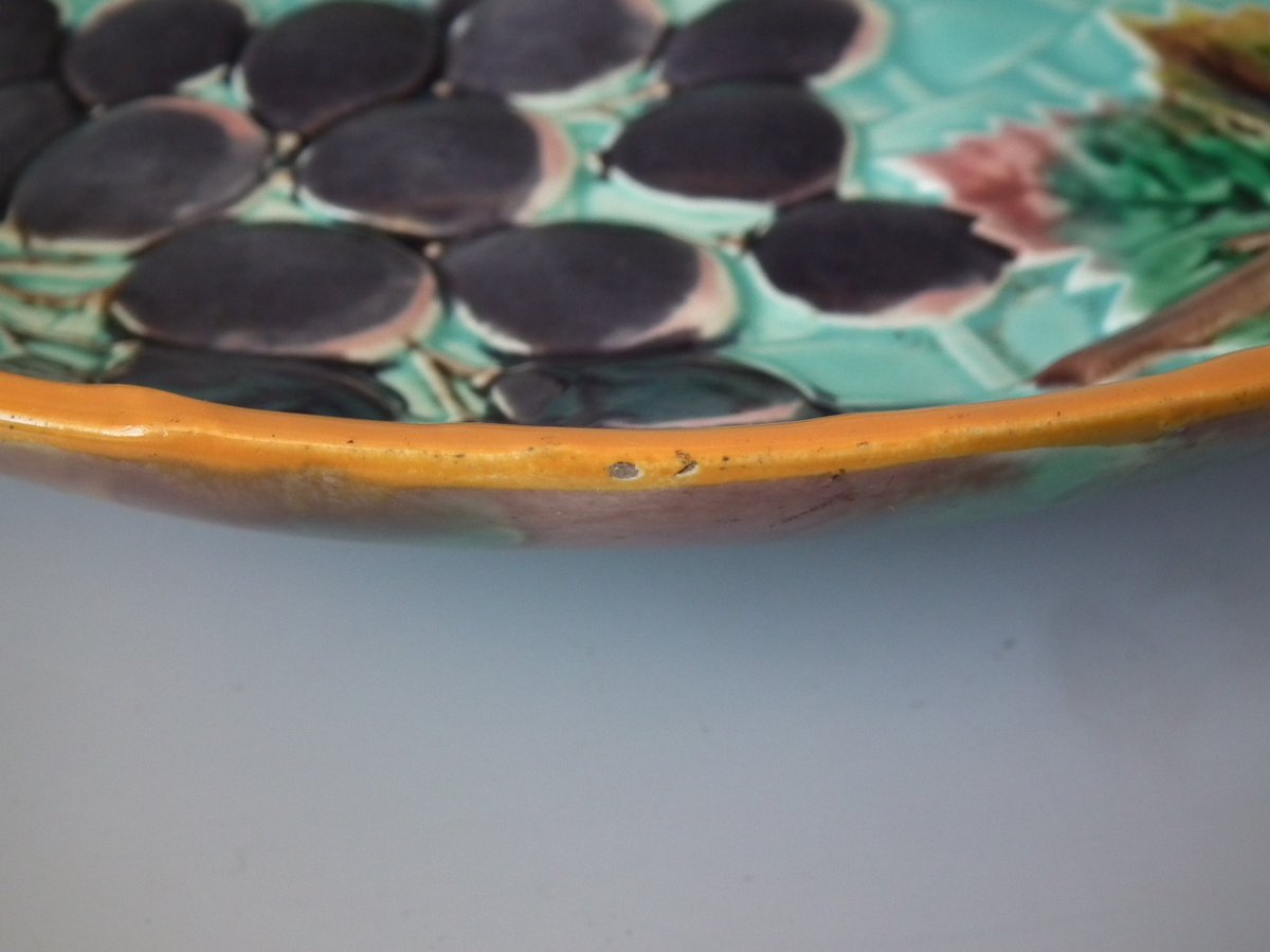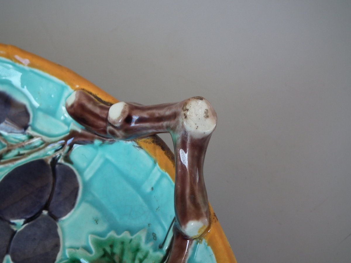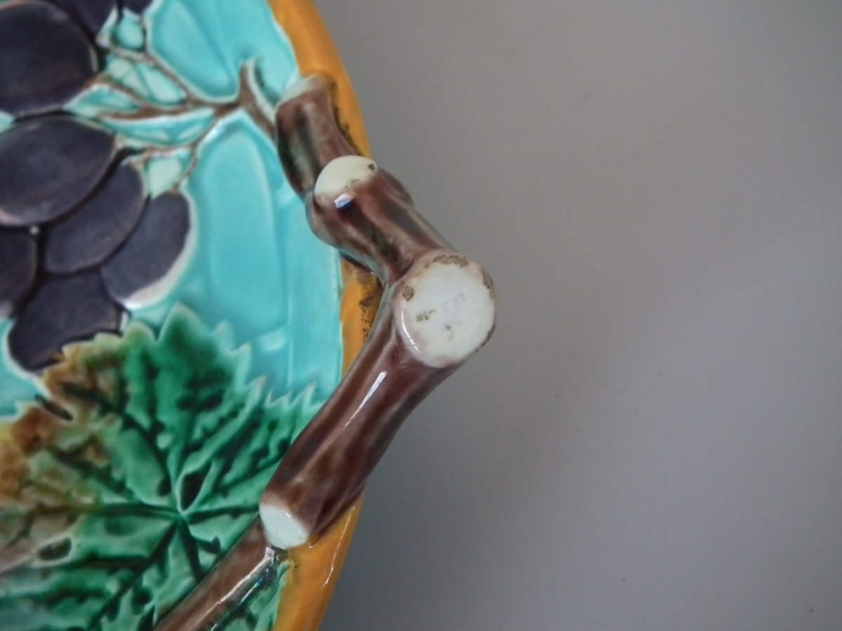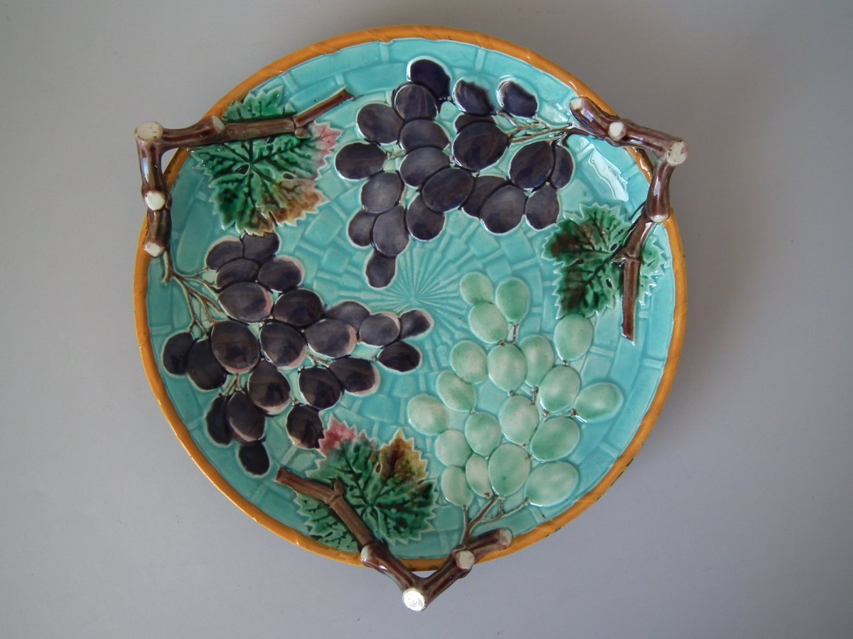 Victorian, circa 1875. 2.4ins high, 10.2ins wide, 10.2ins depth. Wedgwood Majolica shallow bowl which features bunches of grapes hanging from twig handles.