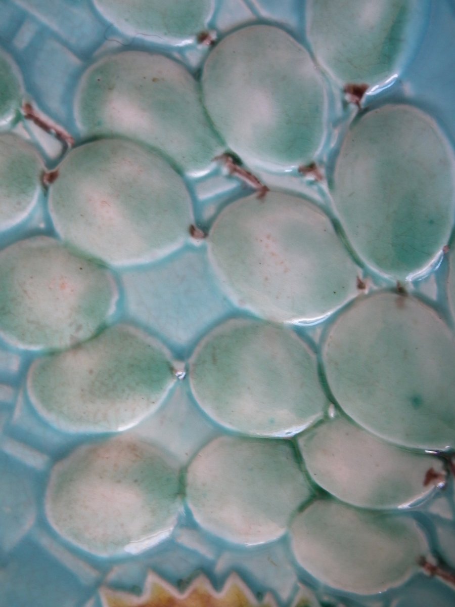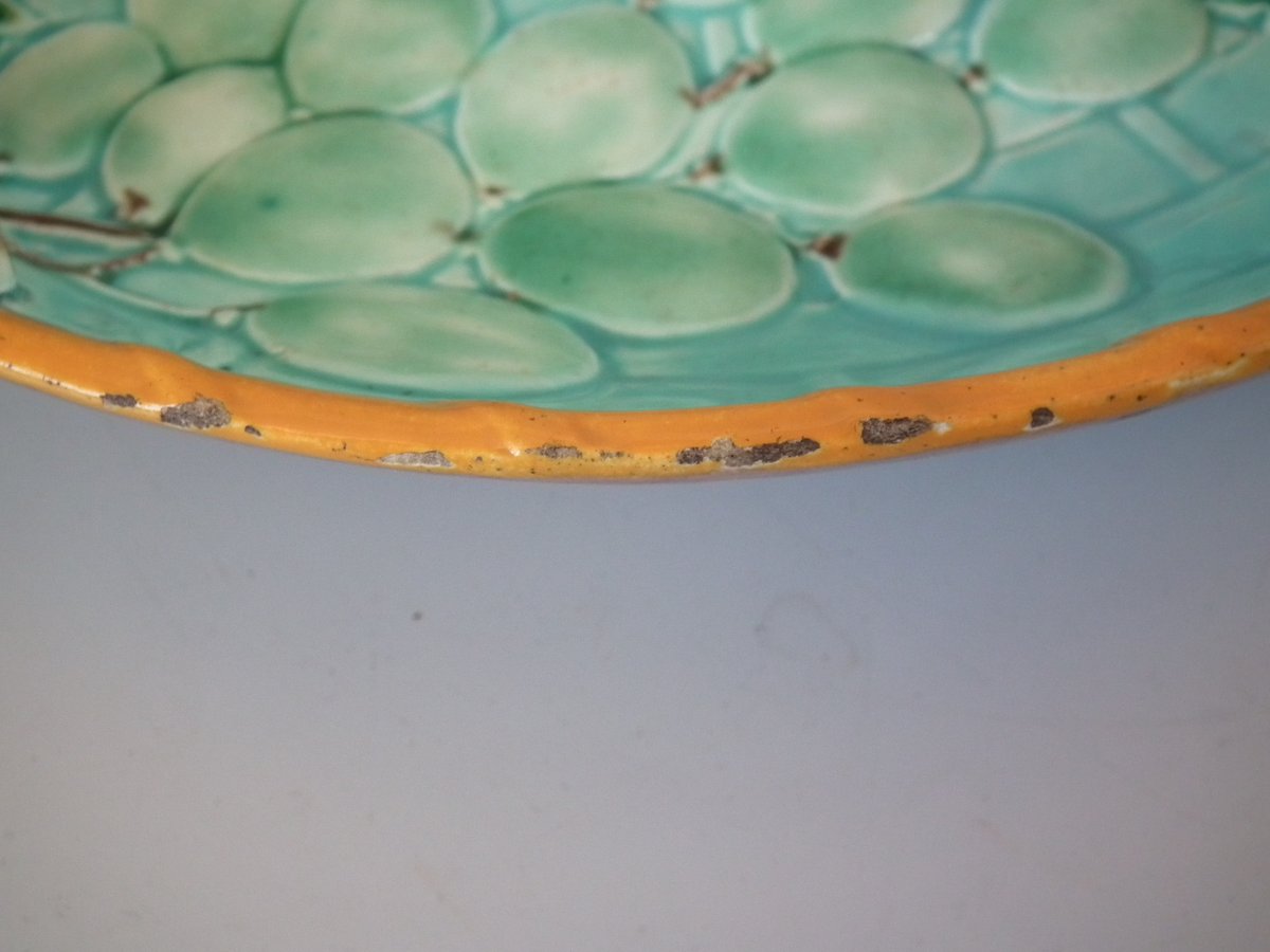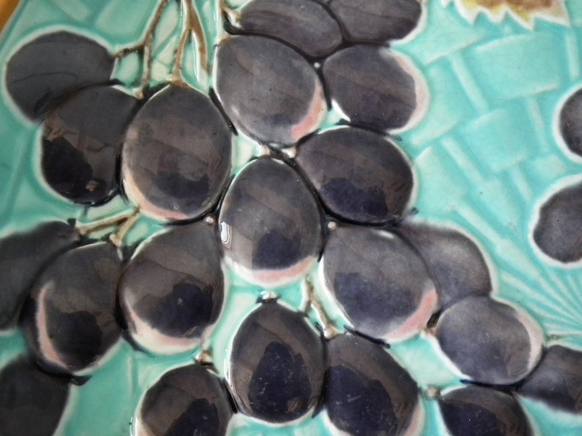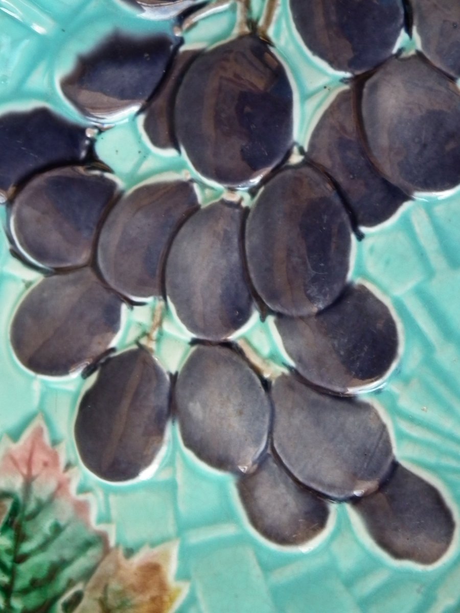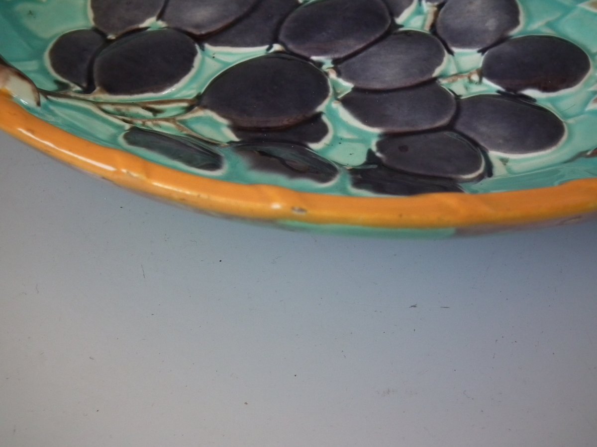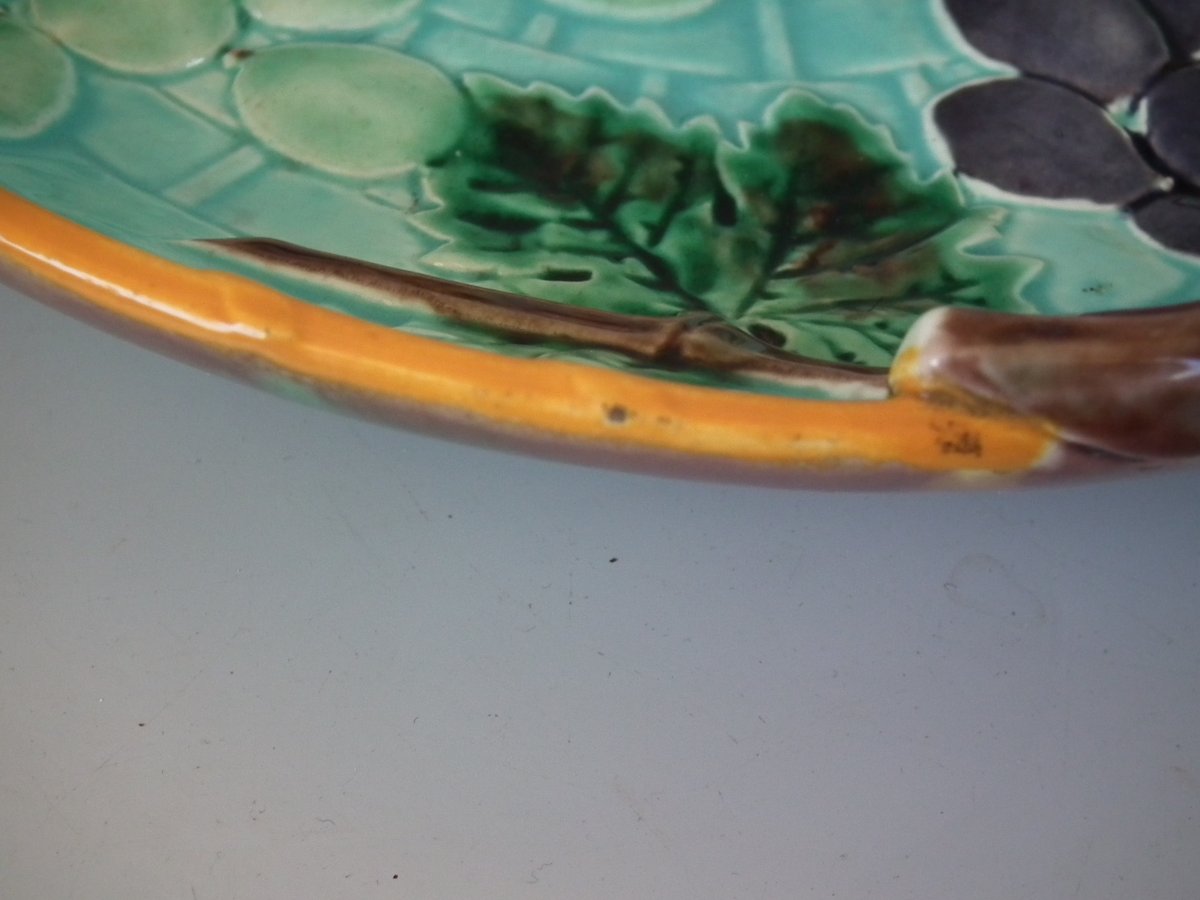 Victorian, circa 1875. 2.4ins high, 10.2ins wide, 10.2ins depth. Wedgwood Majolica shallow bowl which features bunches of grapes hanging from twig handles.